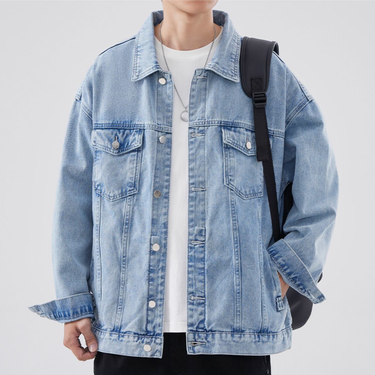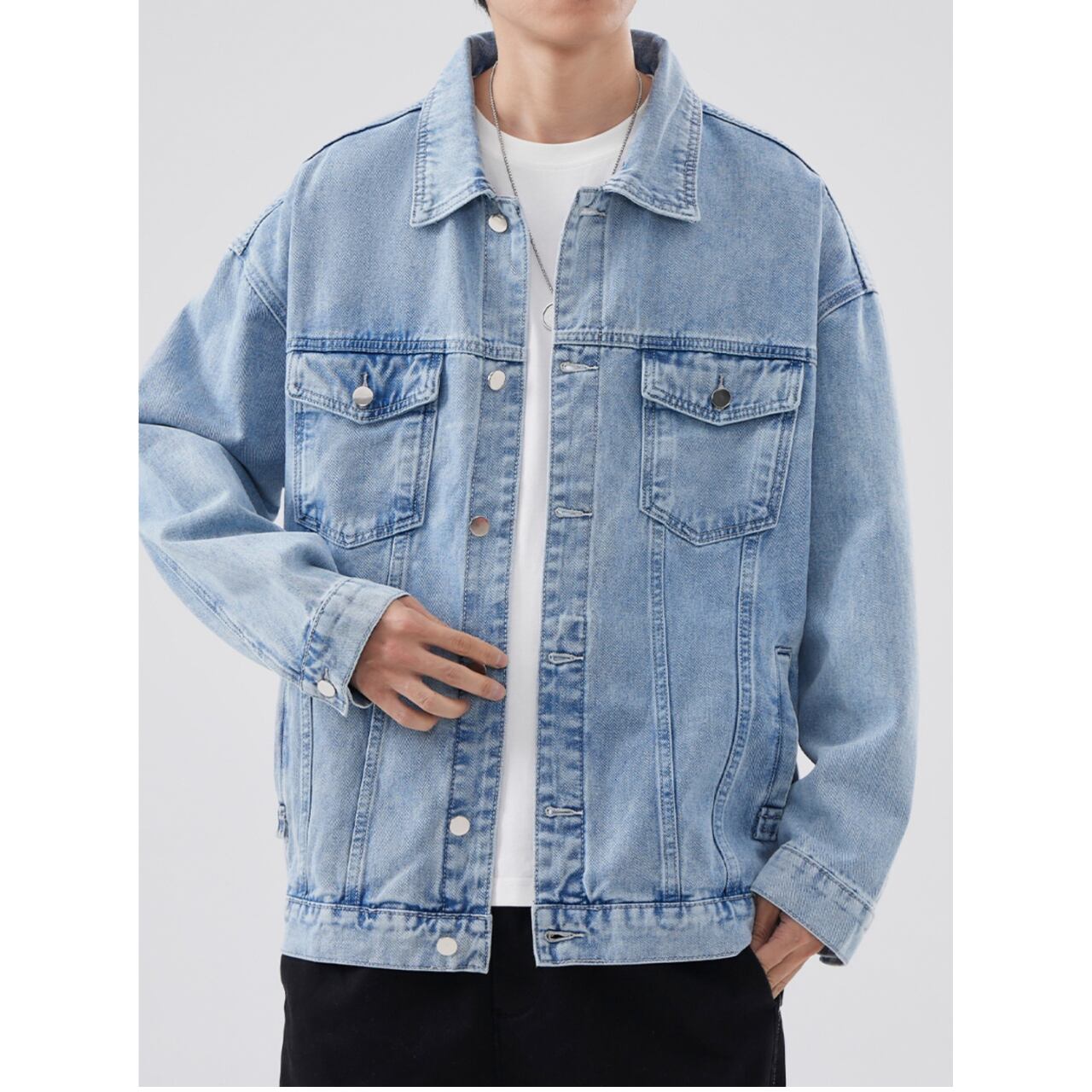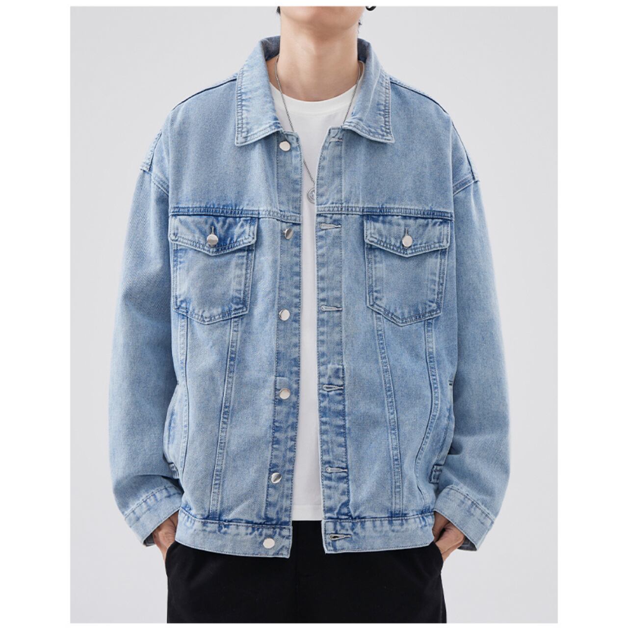 ライトブルーのデニムジャケットは、どんな服装にも合わせやすい万能アイテムです。