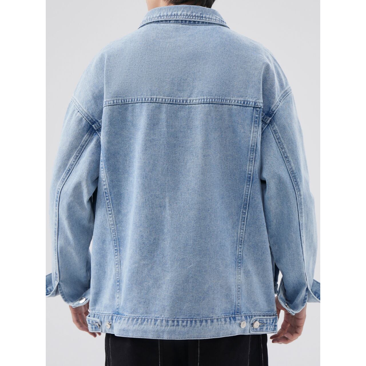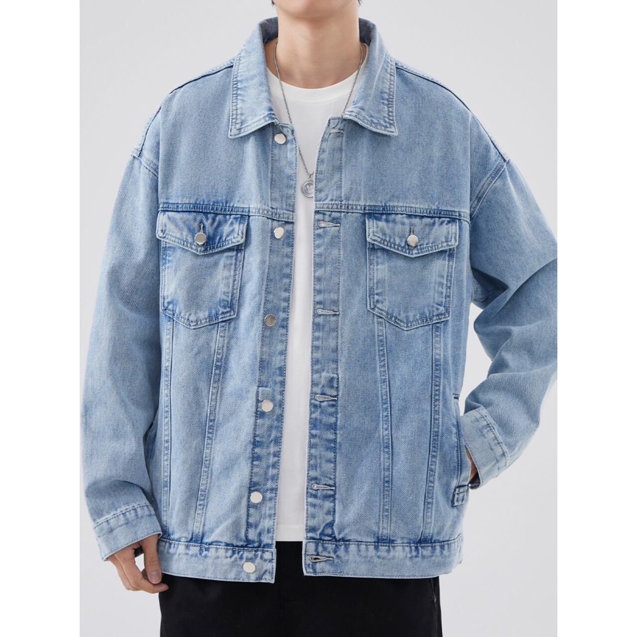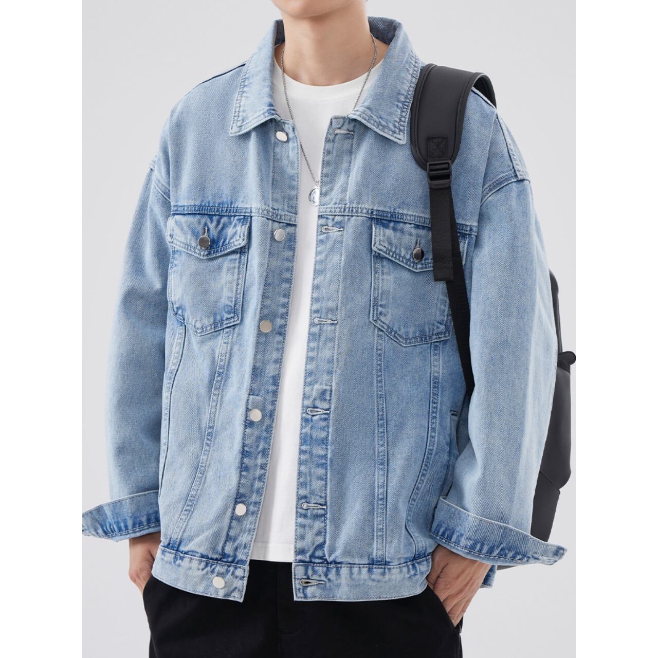ライトブルーのデニムジャケットは、どんな服装にも合わせやすい万能アイテムです。