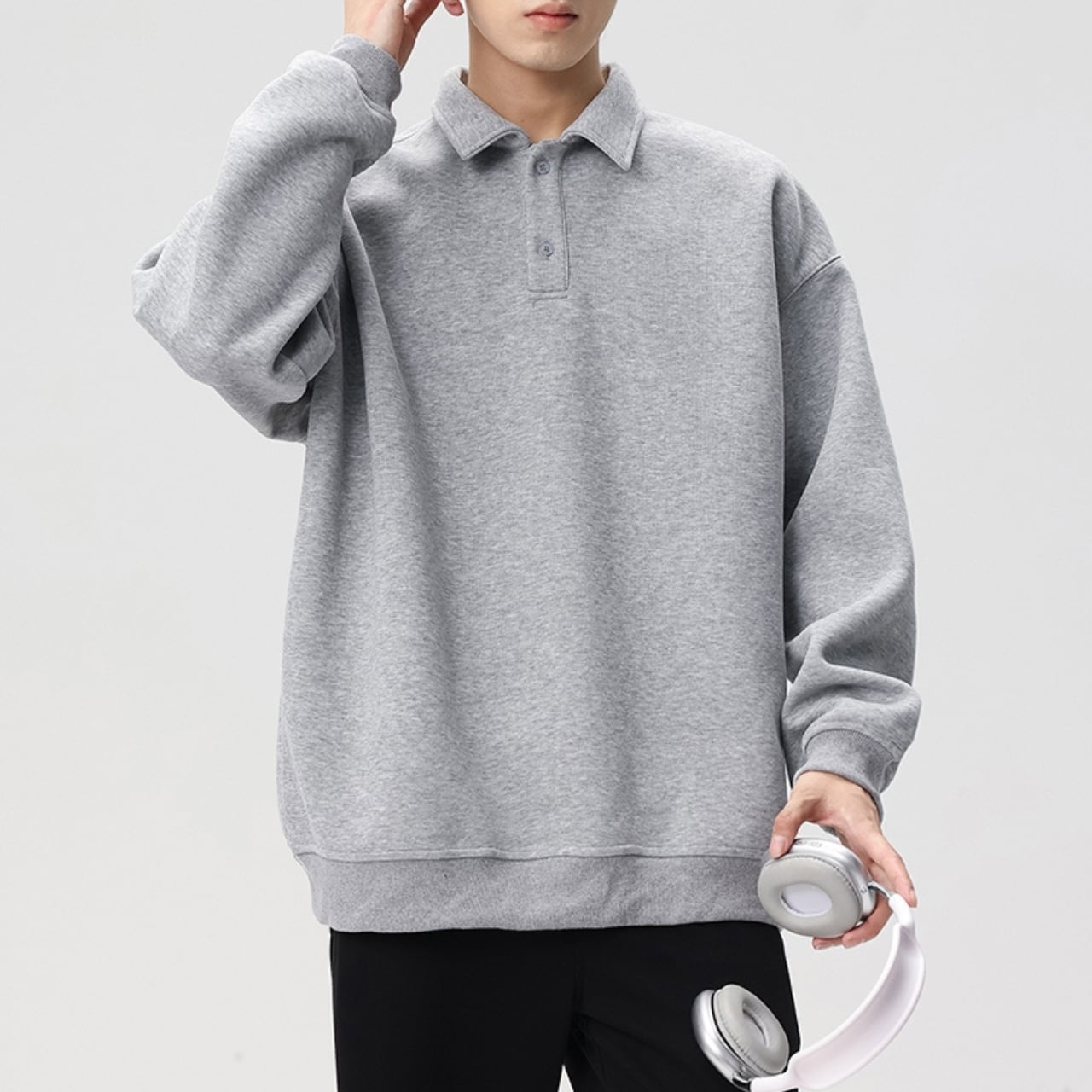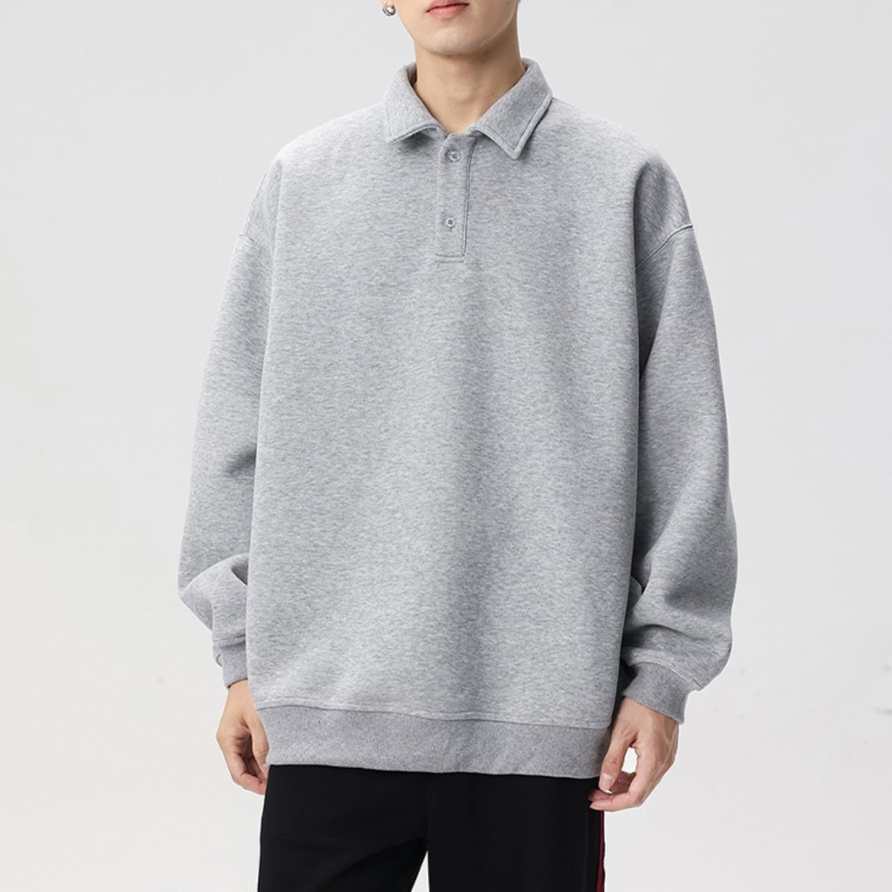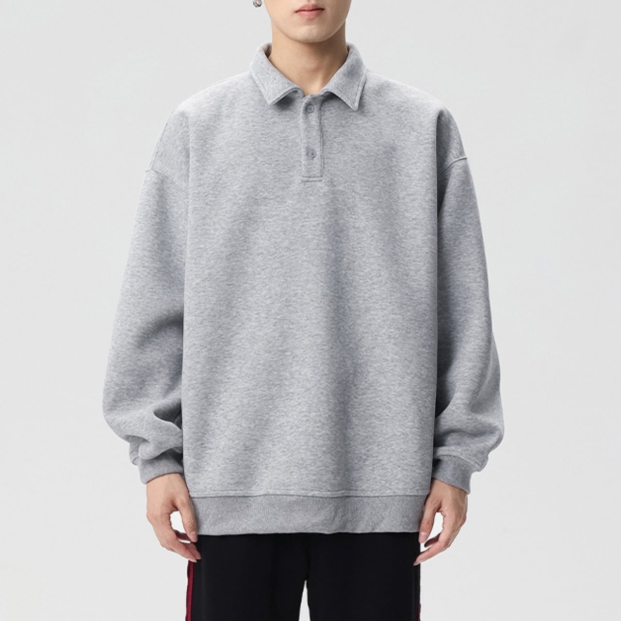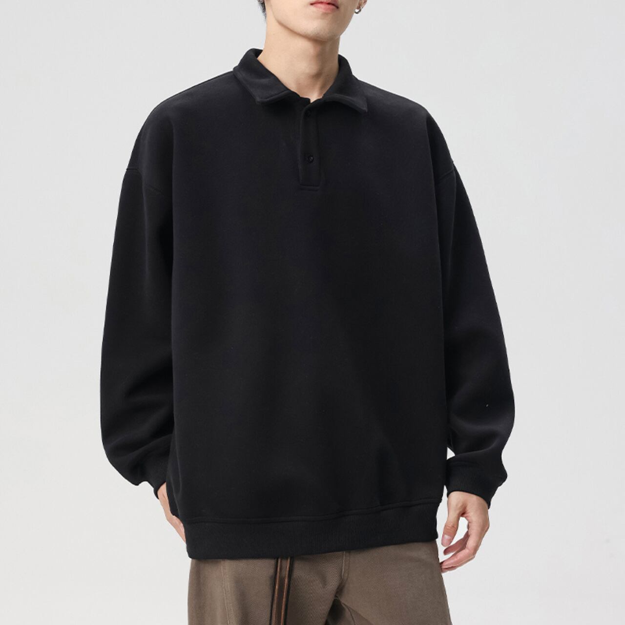 トレンドのオーバーサイズシルエットと、上品なポロシャツ風の襟が融合したスウェットシャツ。ドロップショルダーのデザインが、肩周りのラインを美しく見せます。