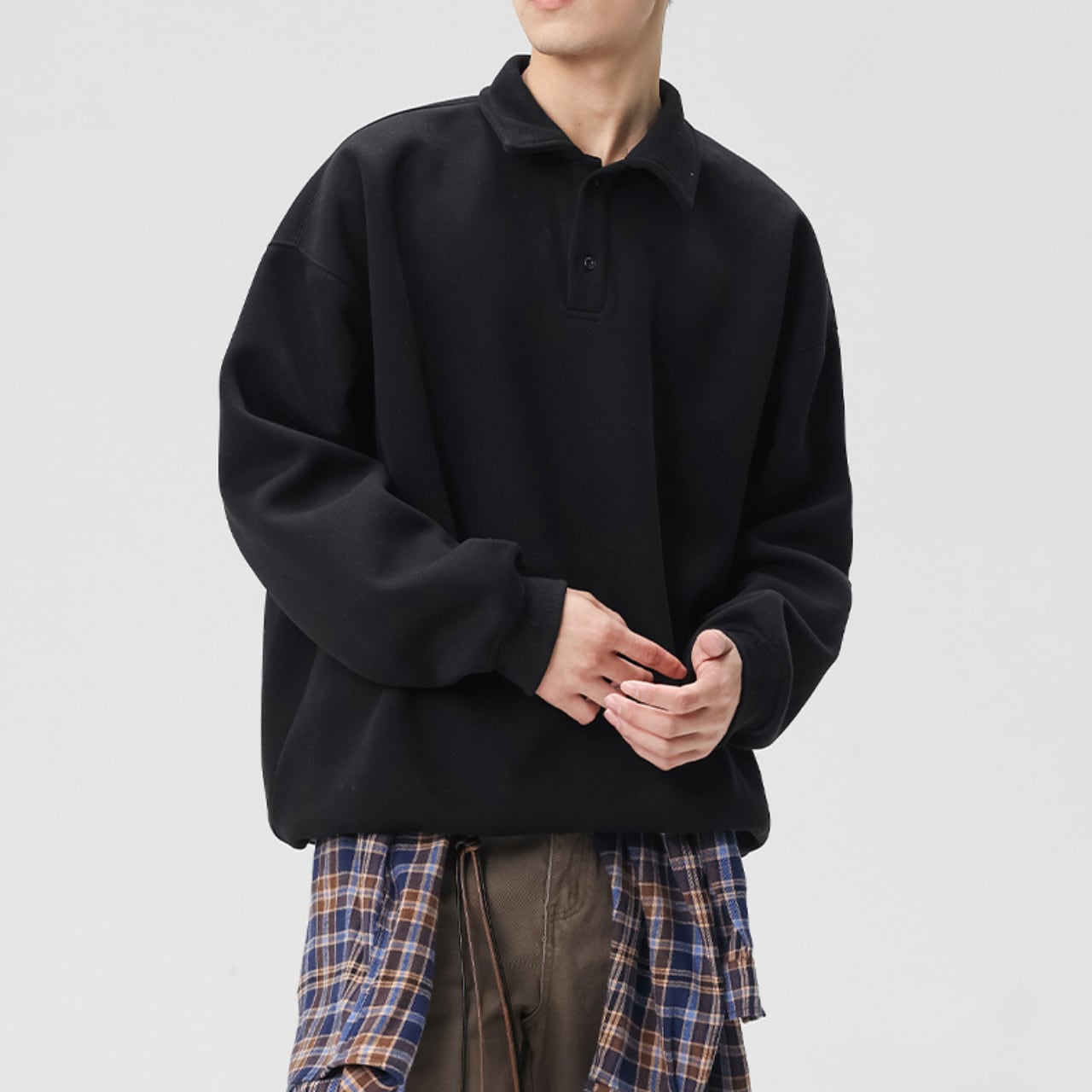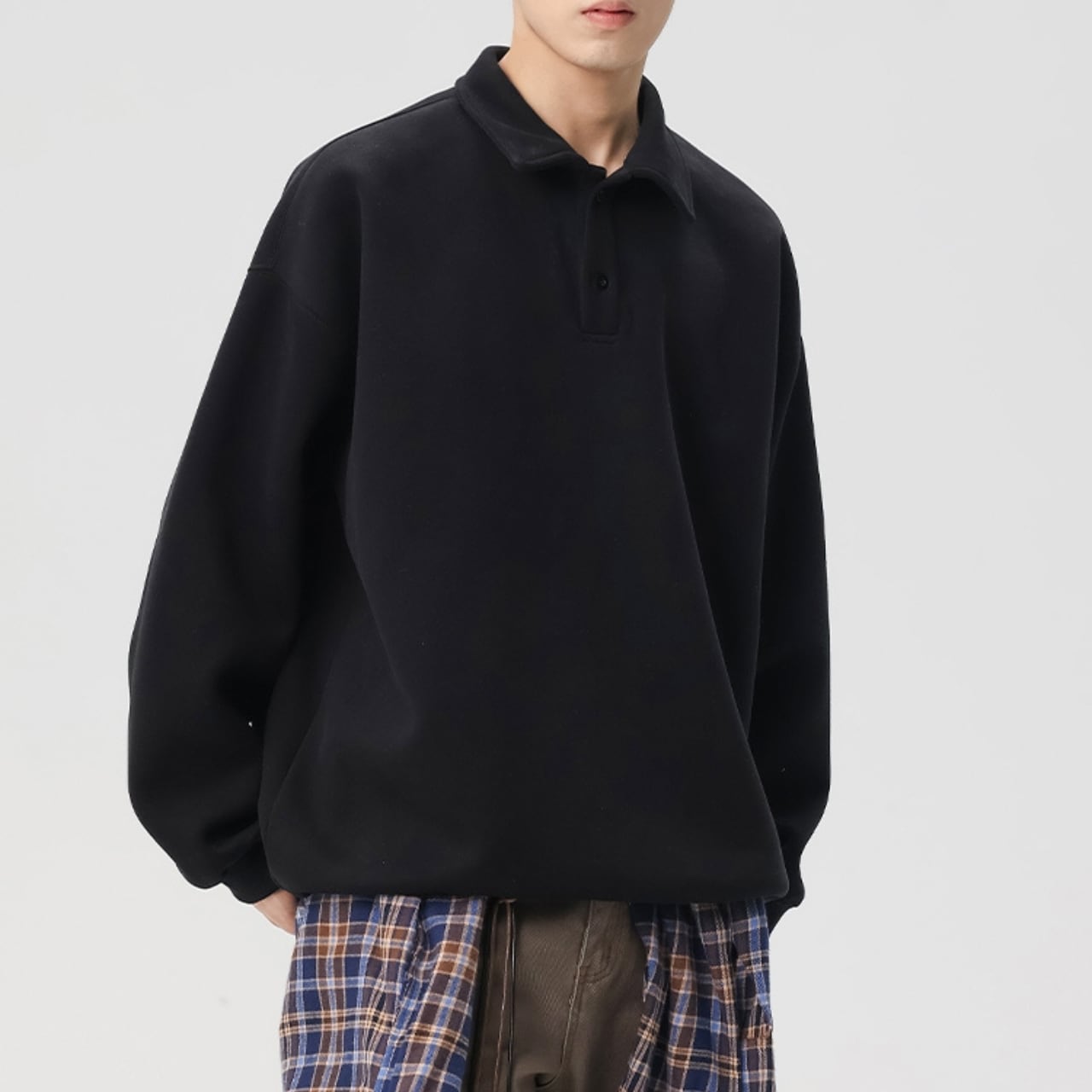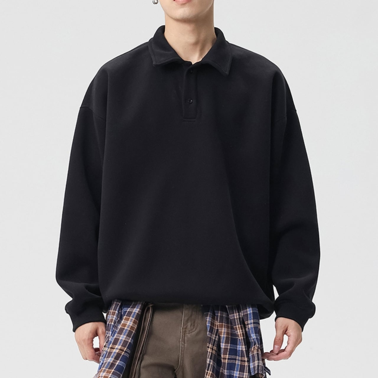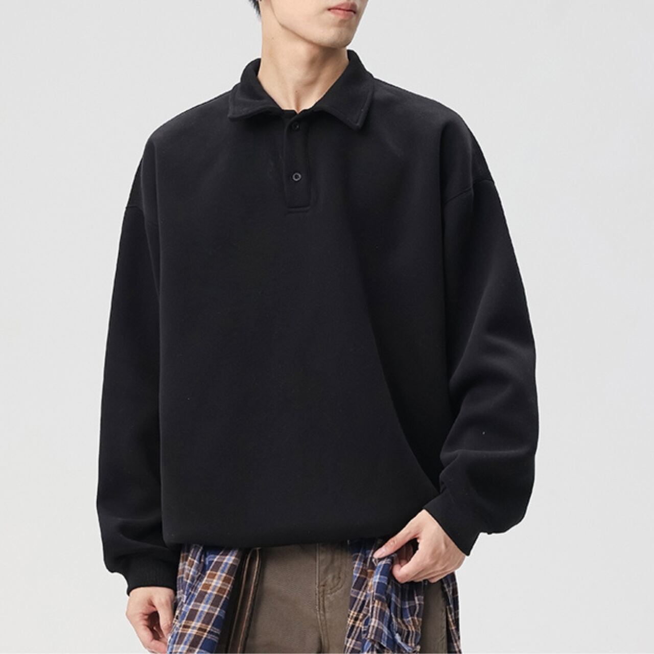 トレンドのオーバーサイズシルエットと、上品なポロシャツ風の襟が融合したスウェットシャツ。ドロップショルダーのデザインが、肩周りのラインを美しく見せます。