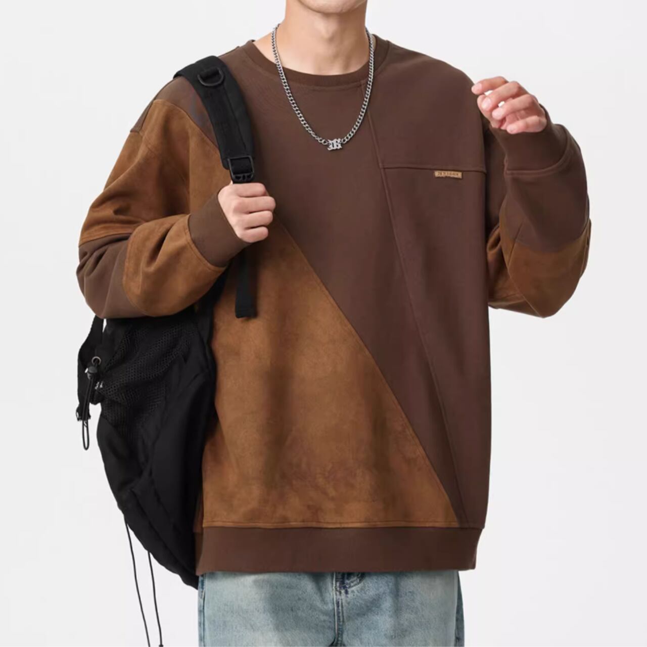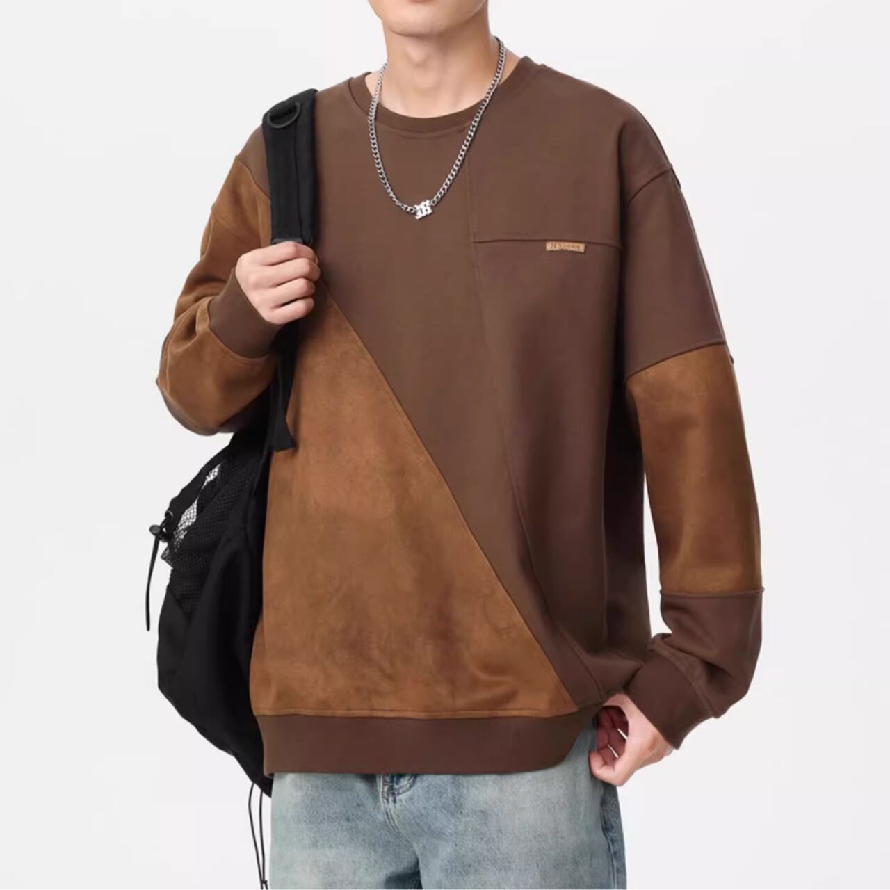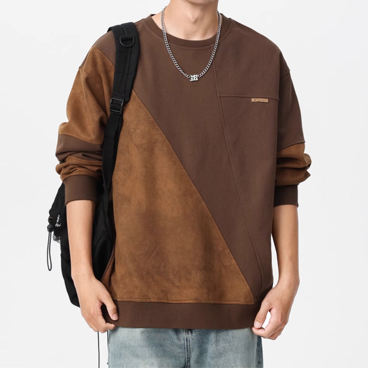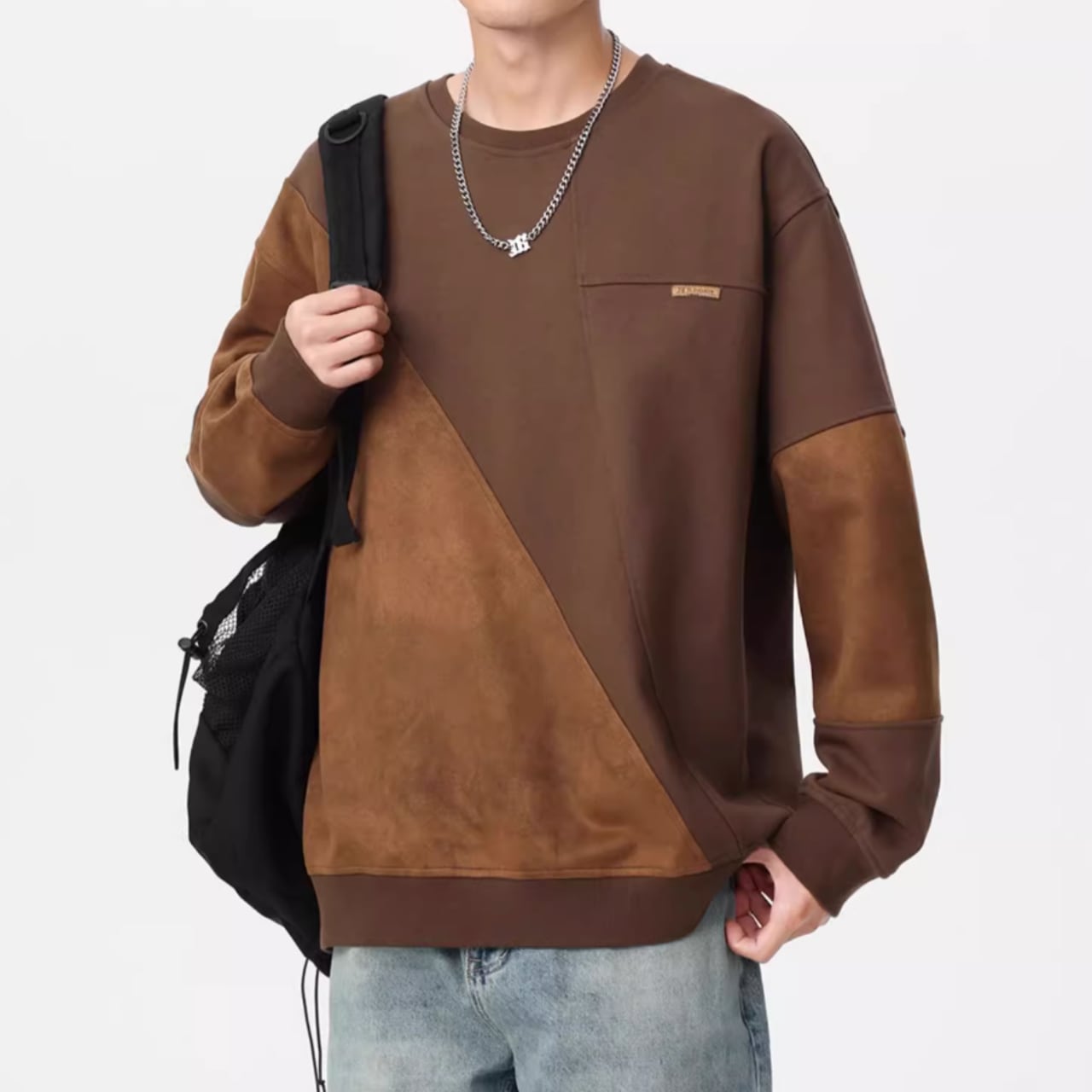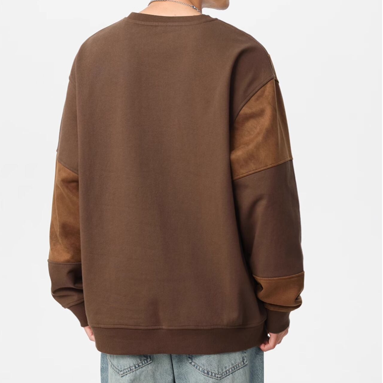 スエード調素材の切替が目を惹くクルーネックスウェットシャツ。
