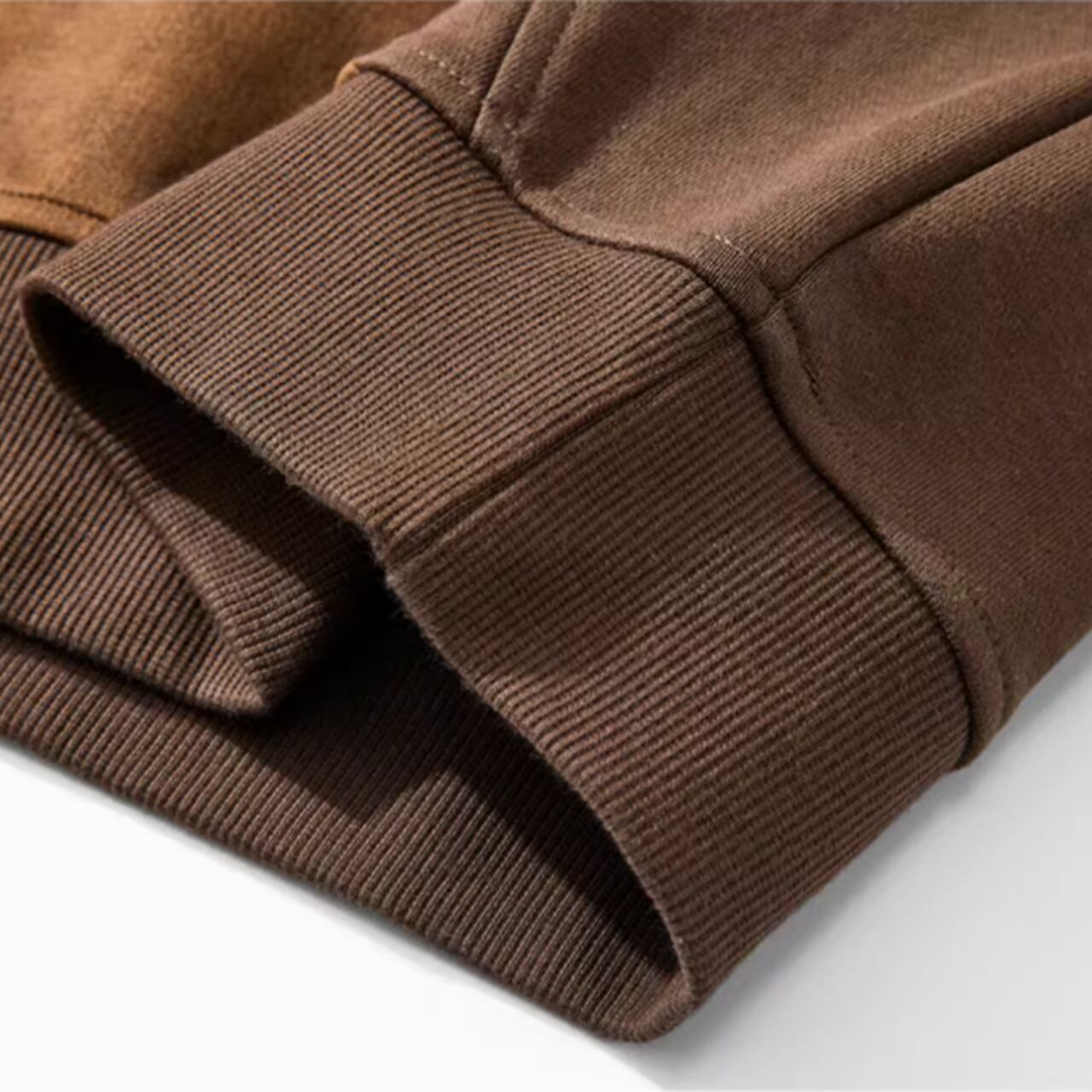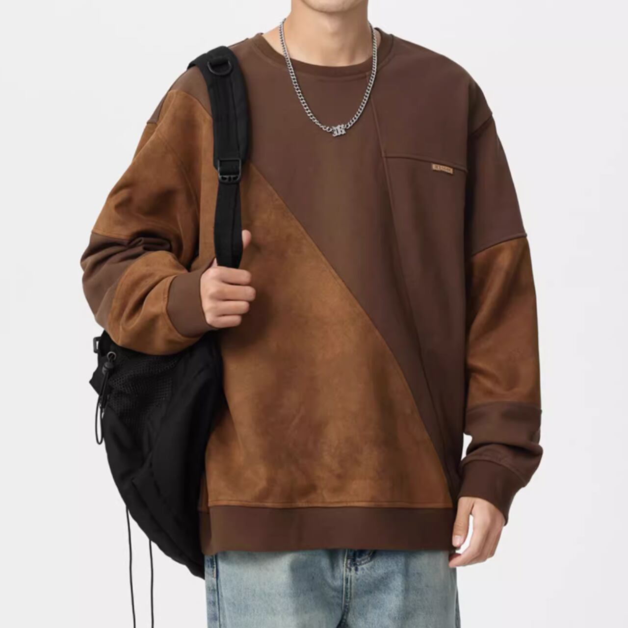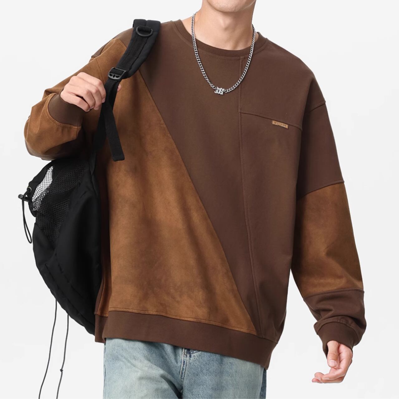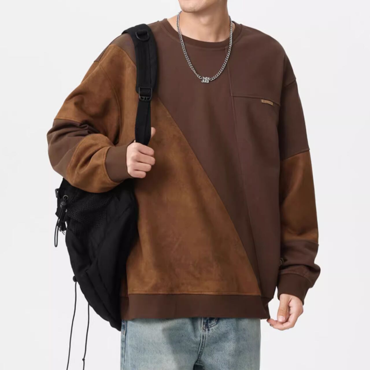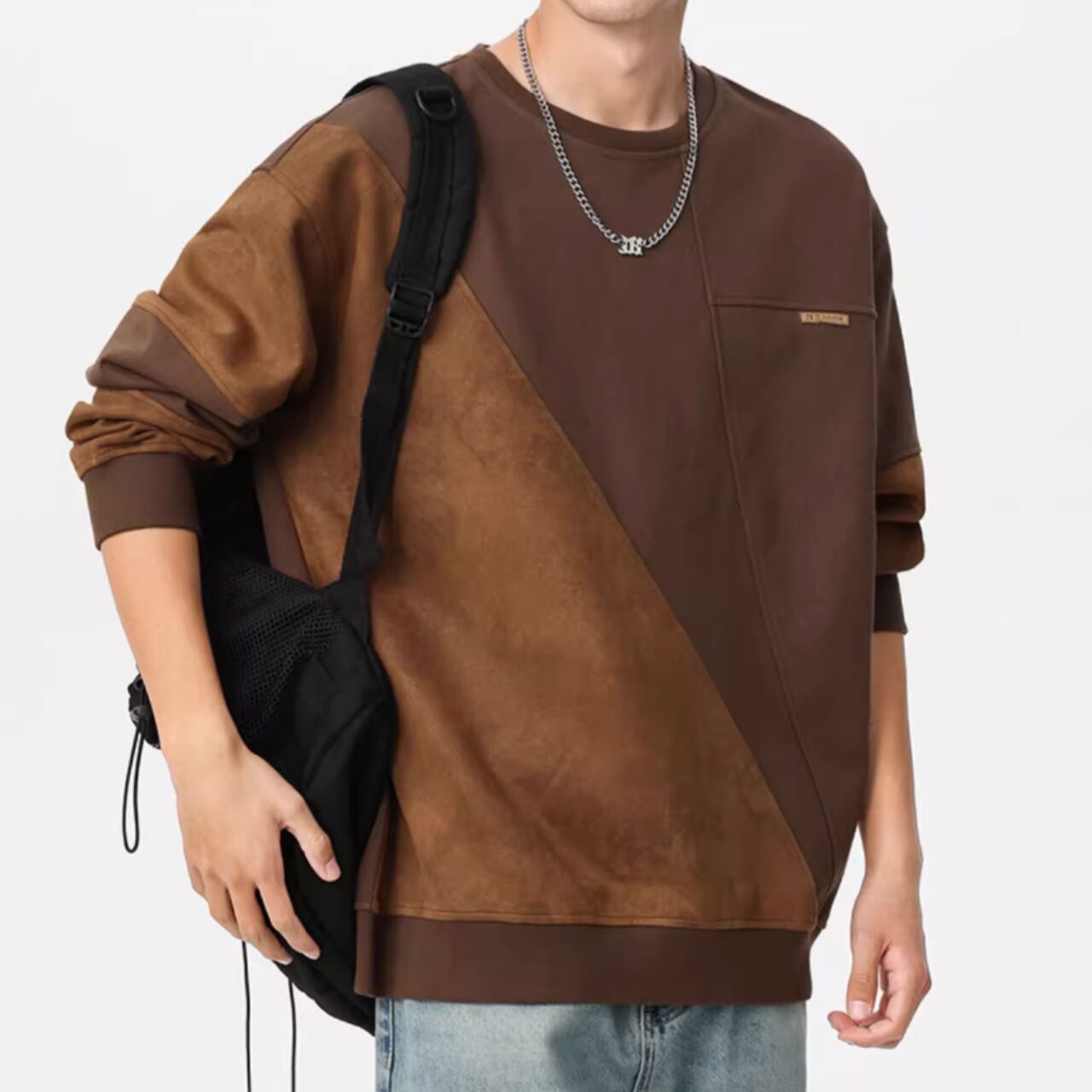 スエード調素材の切替が目を惹くクルーネックスウェットシャツ。