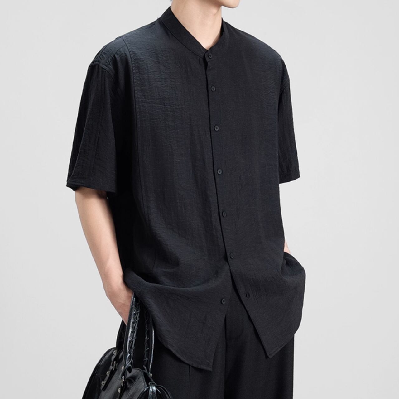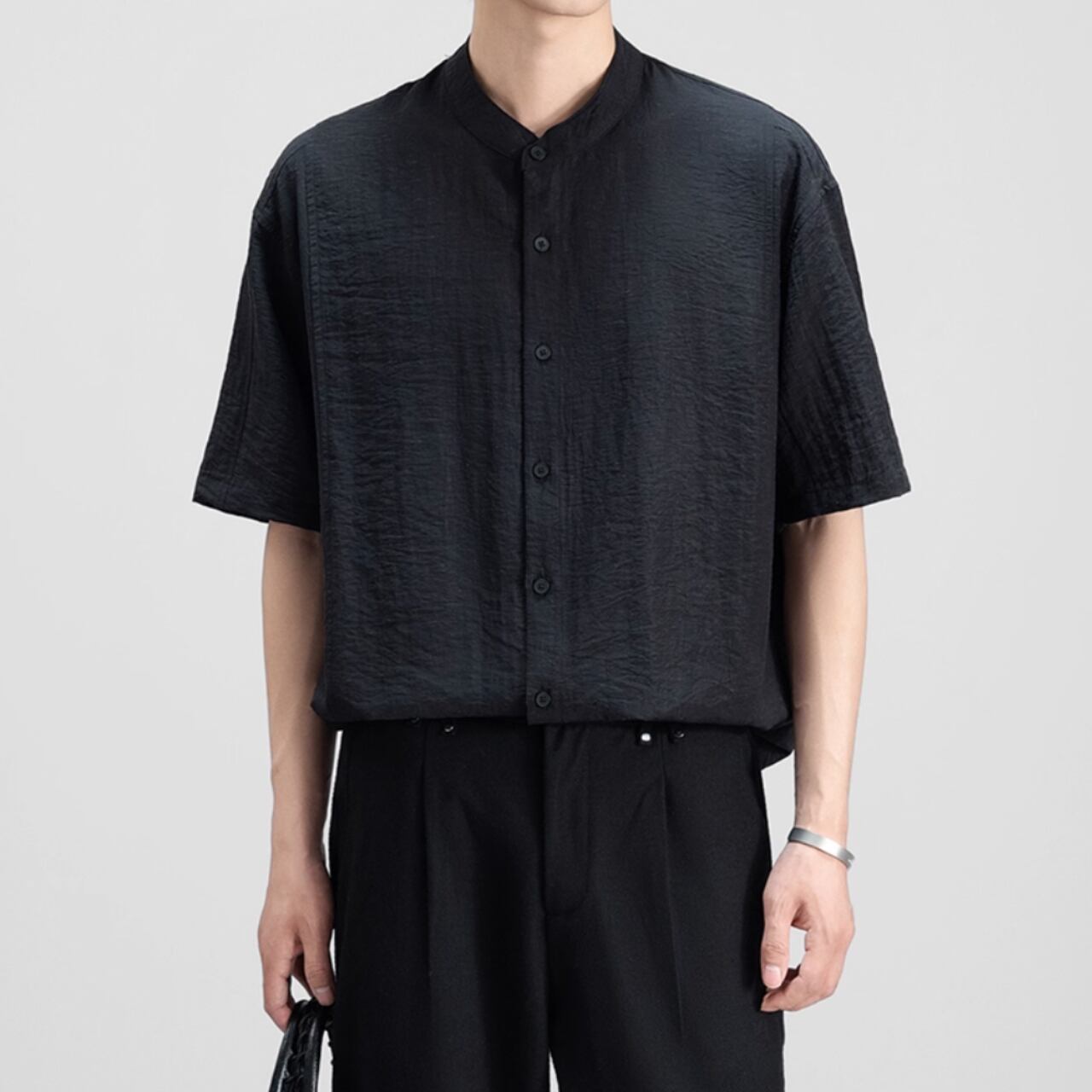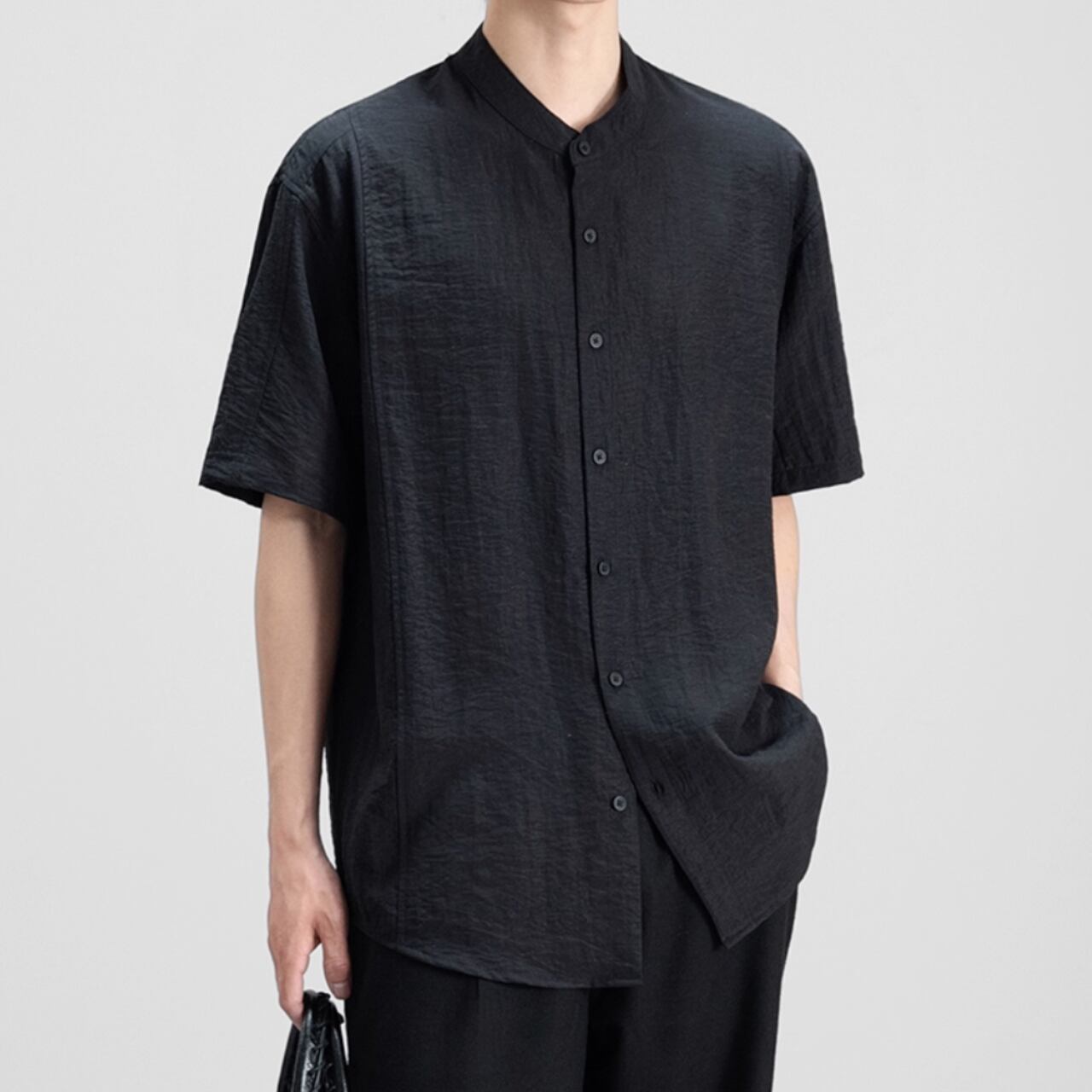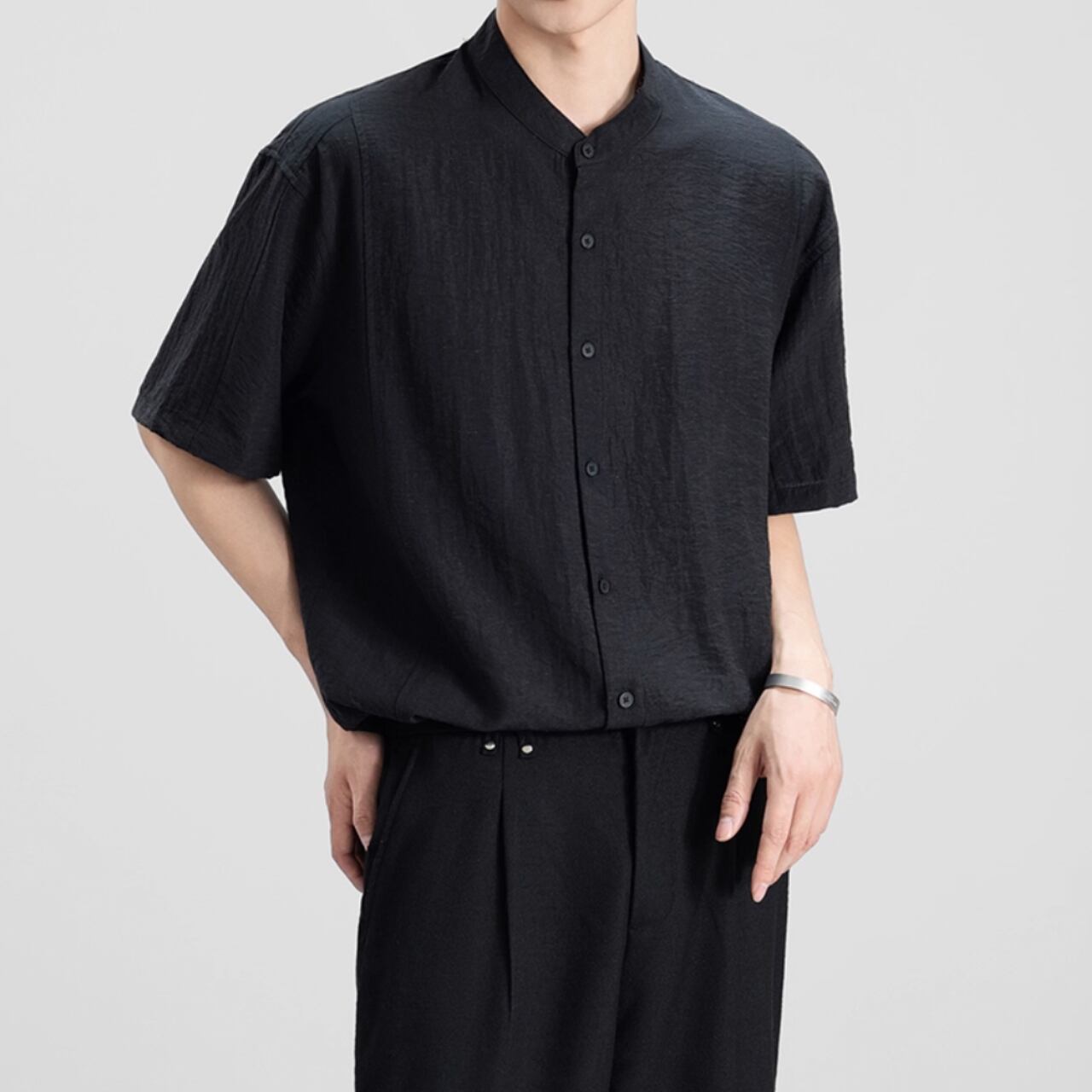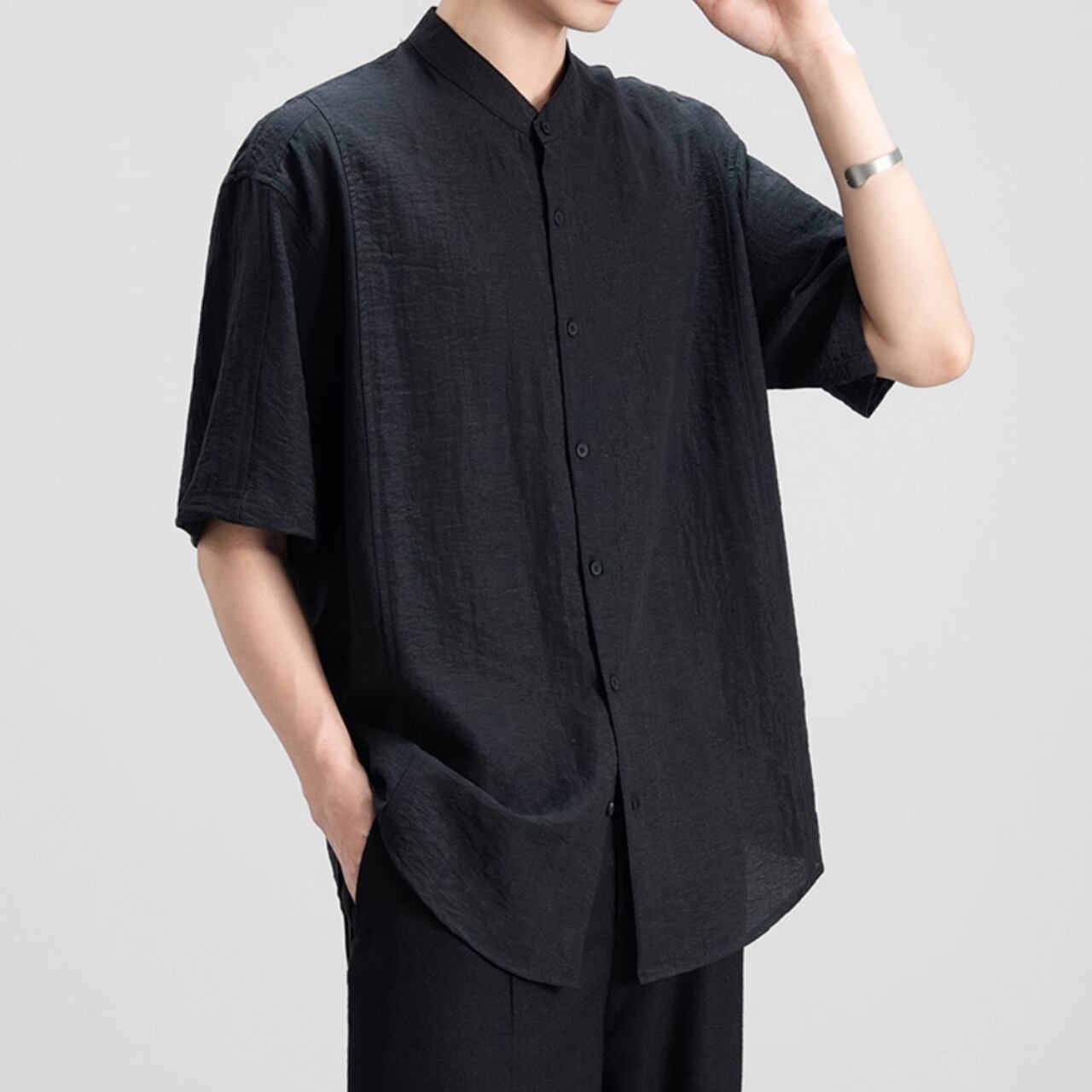 都会的な雰囲気漂う、バンドカラーの半袖シャツ。