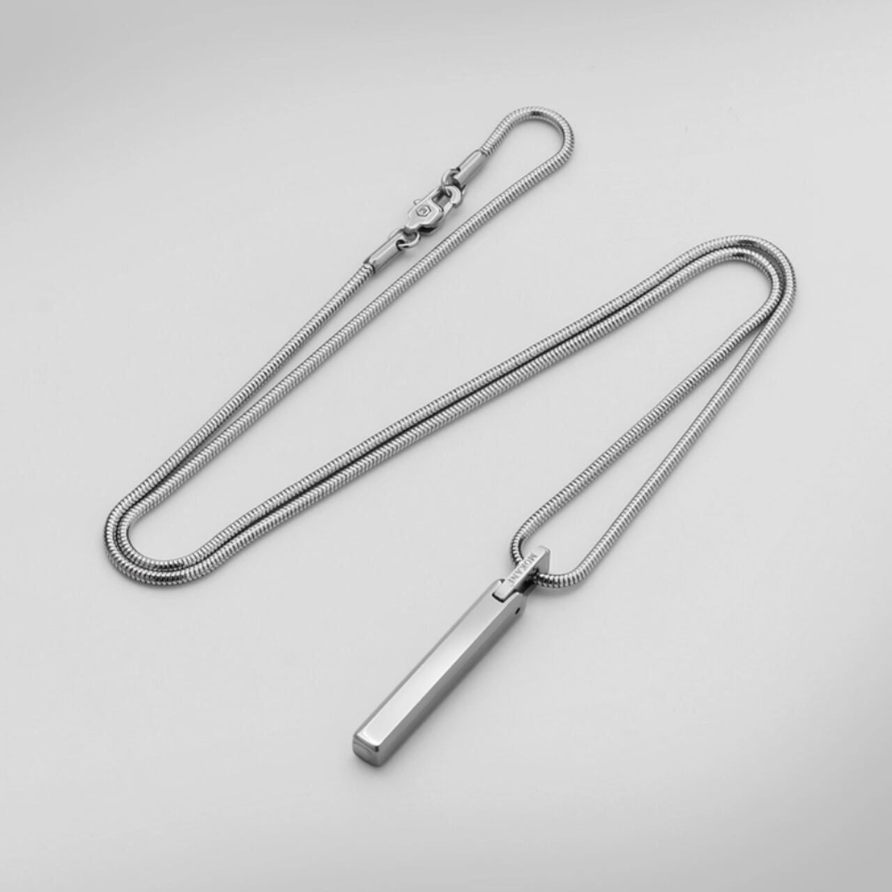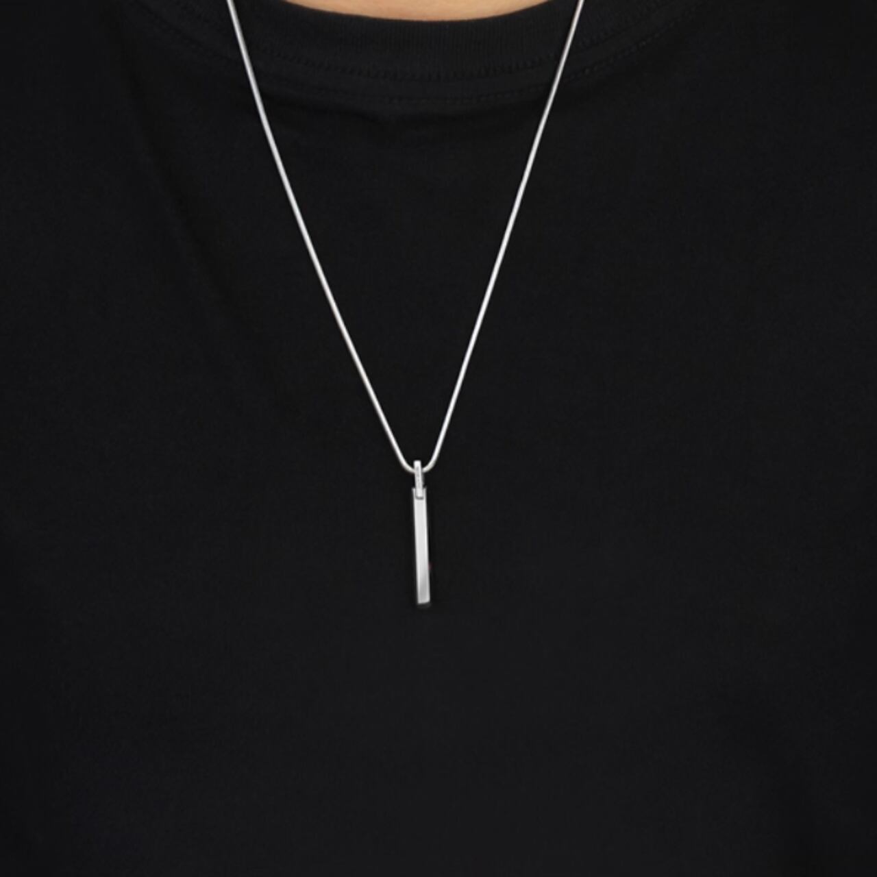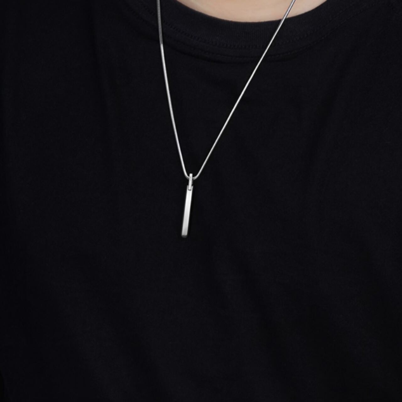 スタイリッシュなバータイプのペンダントが目を引く、メタルネックレス。