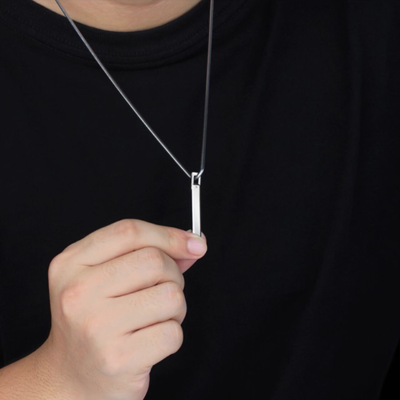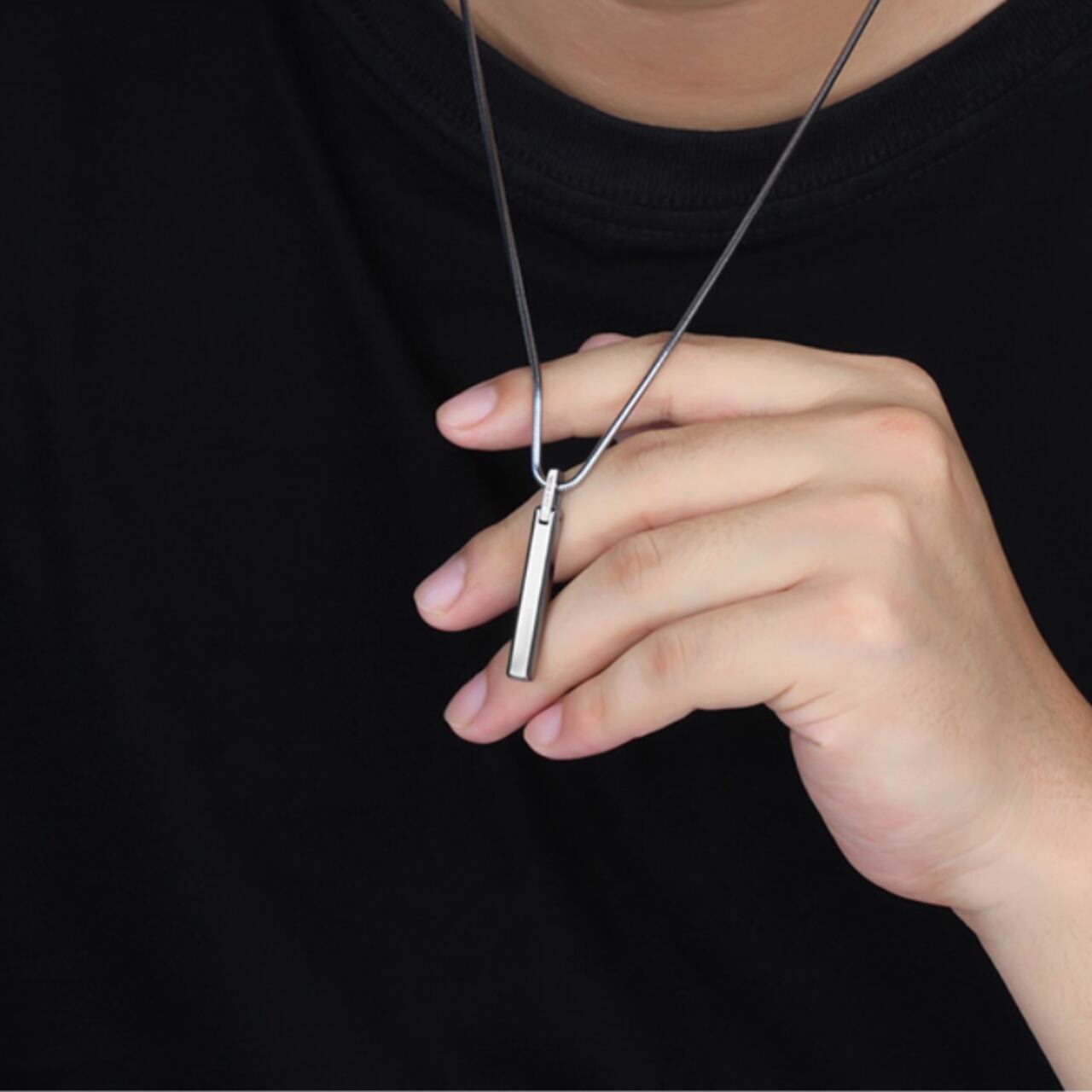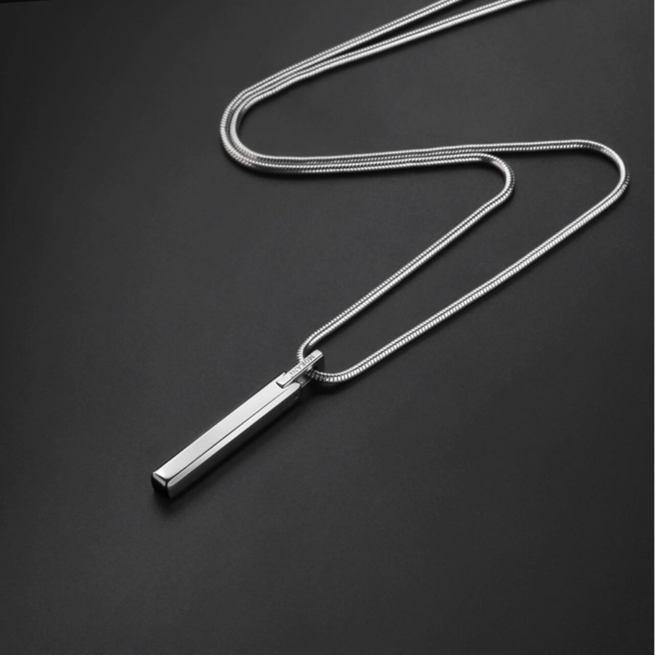 スタイリッシュなバータイプのペンダントが目を引く、メタルネックレス。