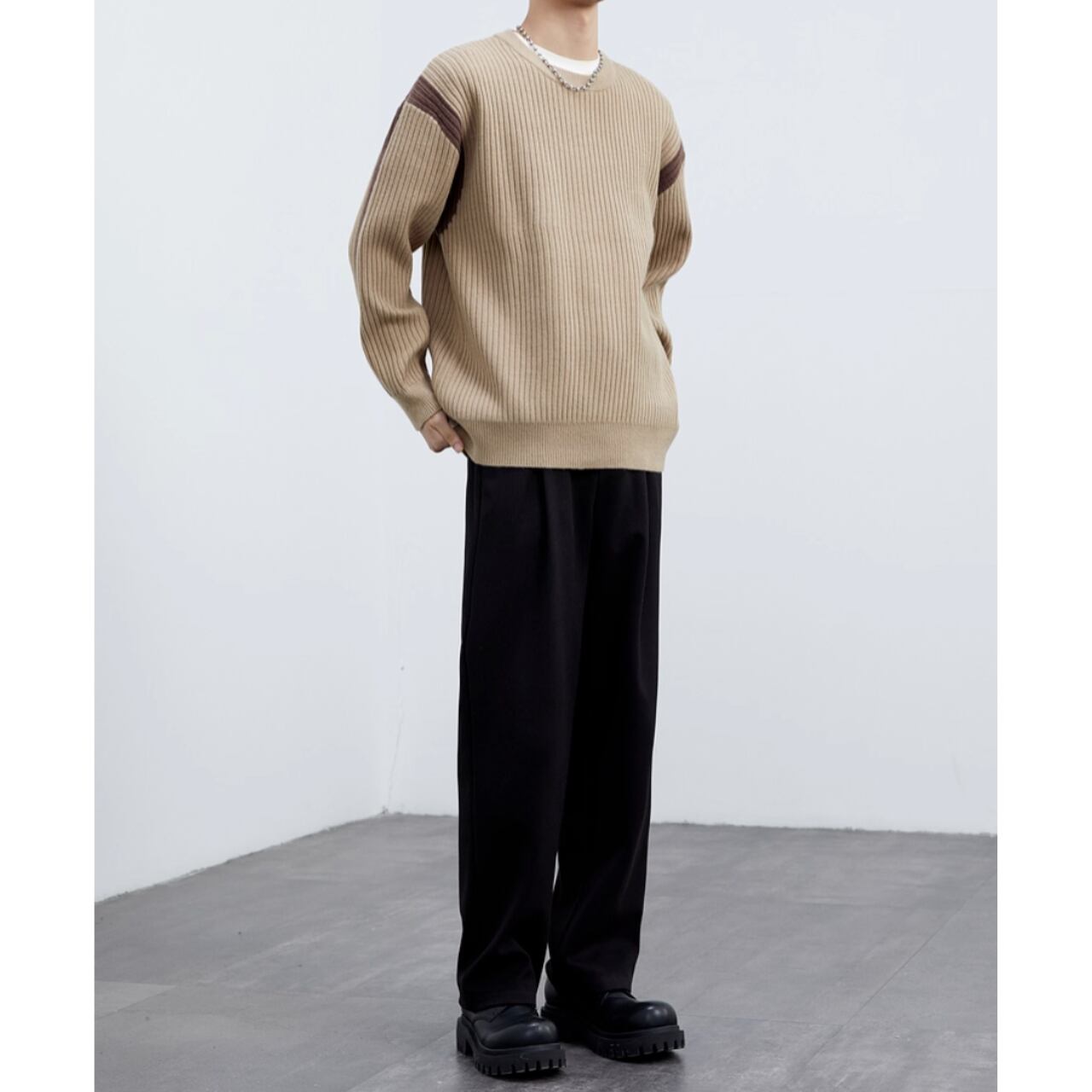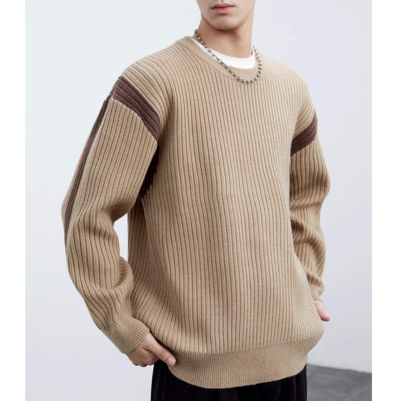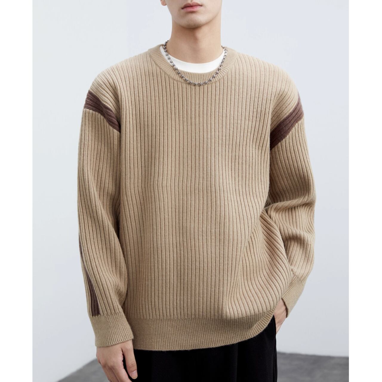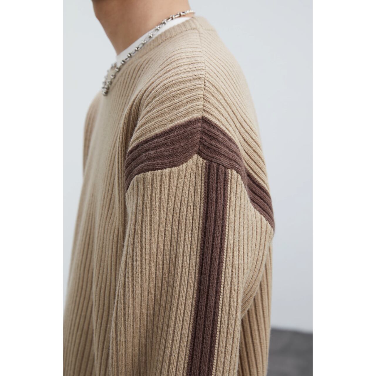 リブ編みのクルーネックニットは、ドロップショルダーとワイドシルエットが特徴です。