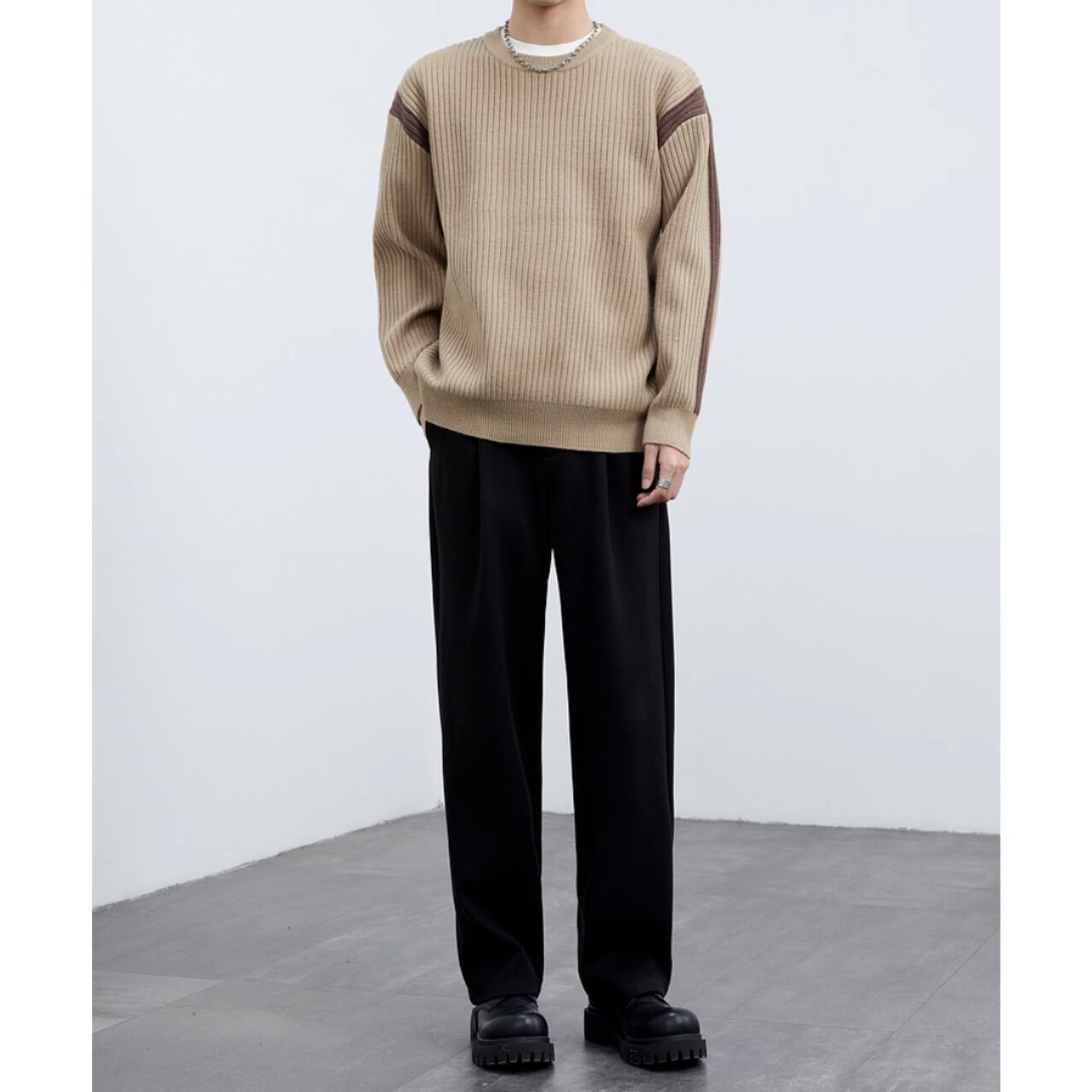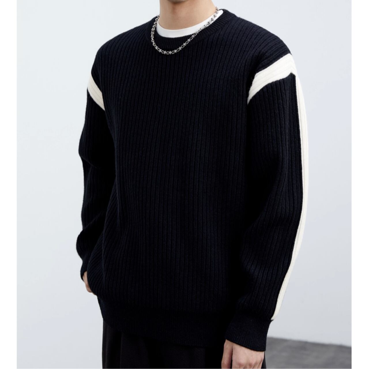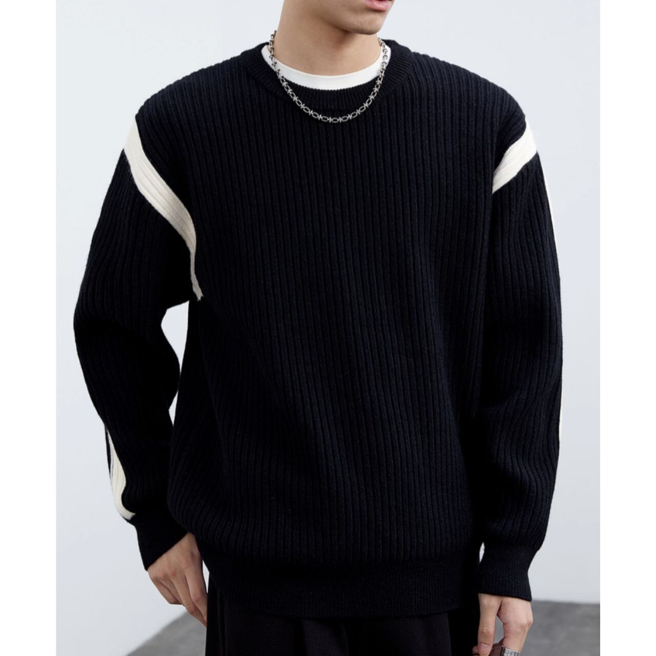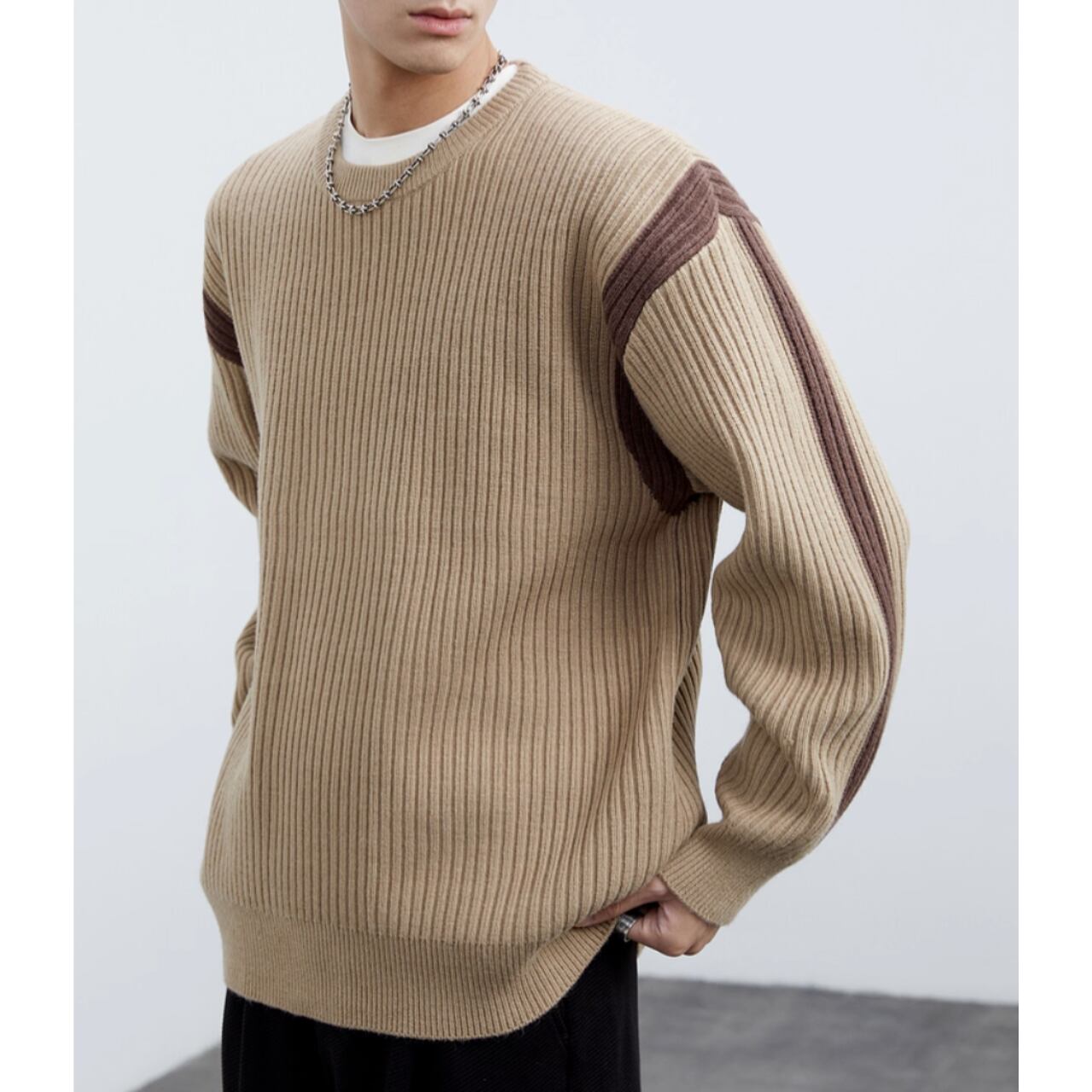 リブ編みのクルーネックニットは、ドロップショルダーとワイドシルエットが特徴です。
