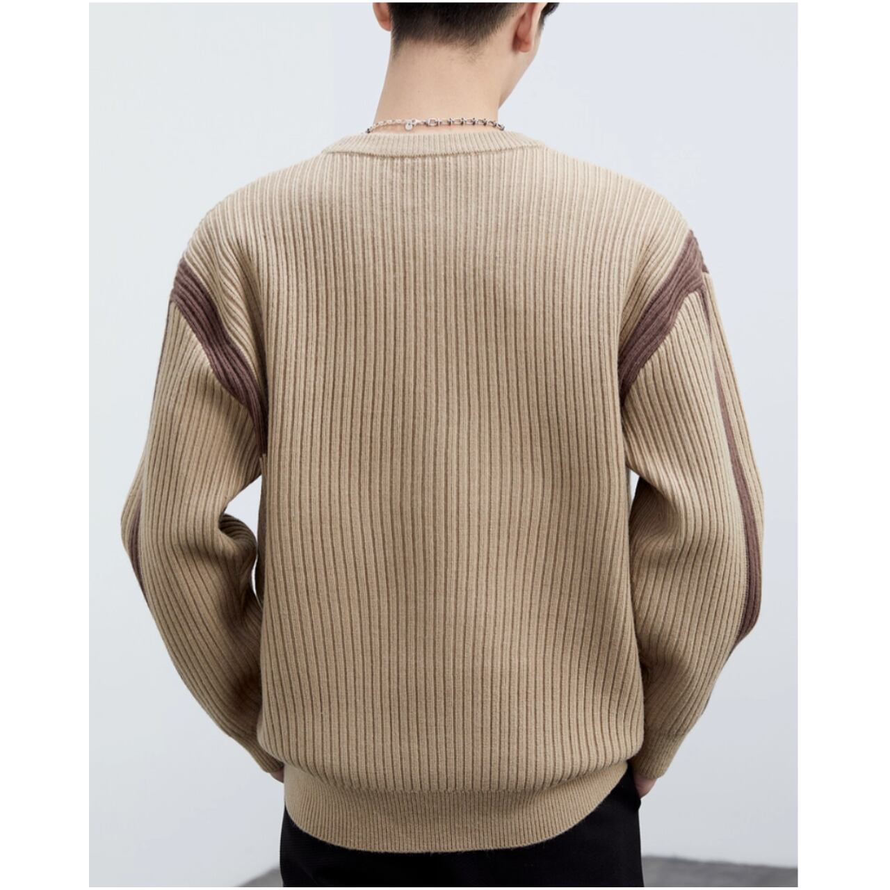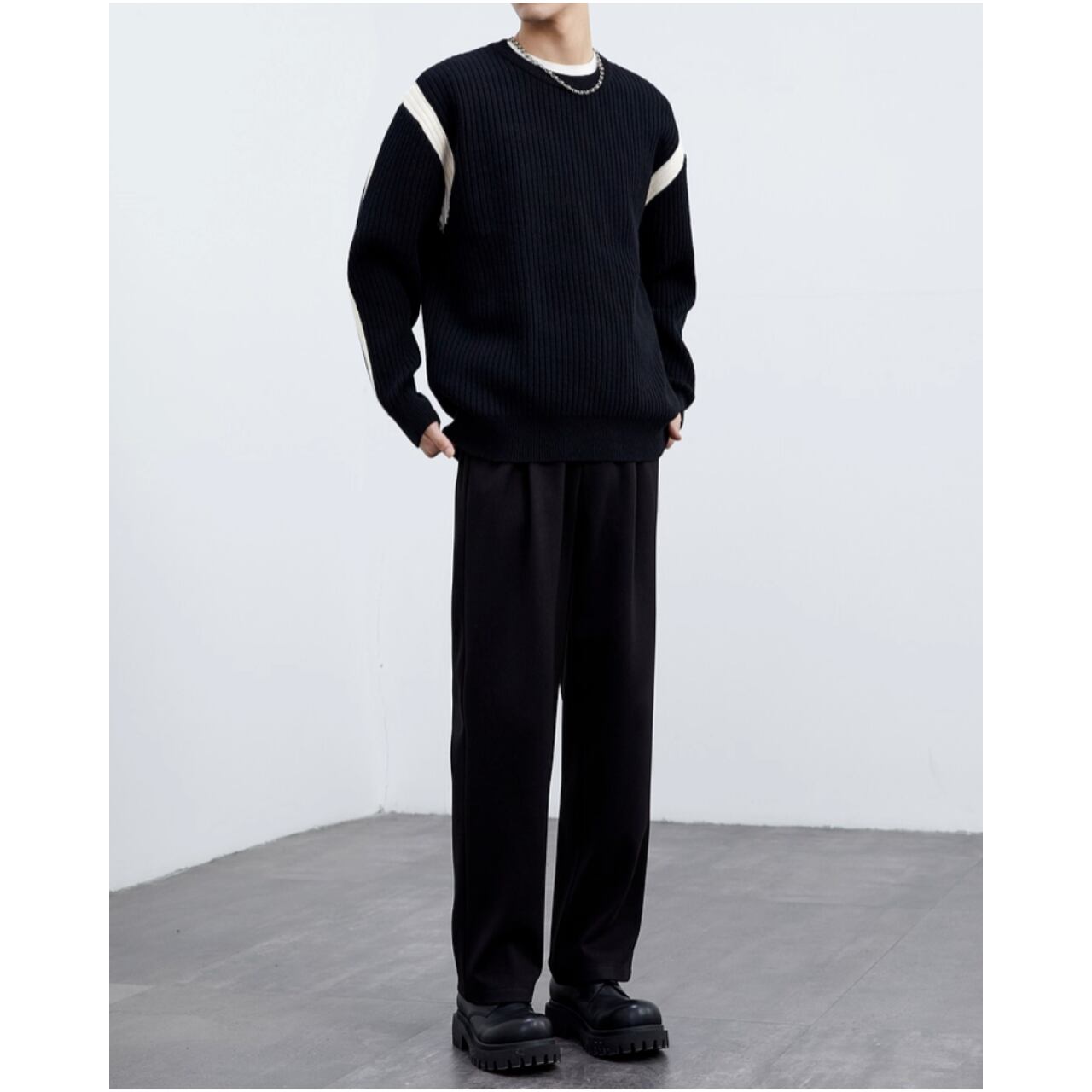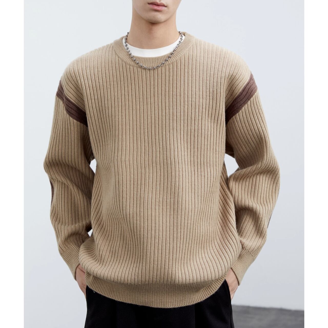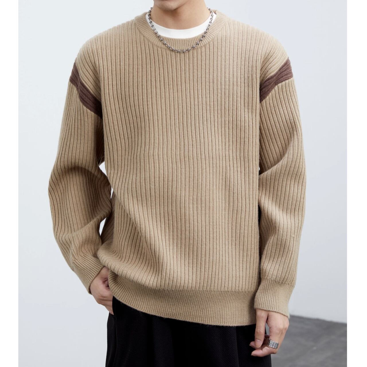 リブ編みのクルーネックニットは、ドロップショルダーとワイドシルエットが特徴です。