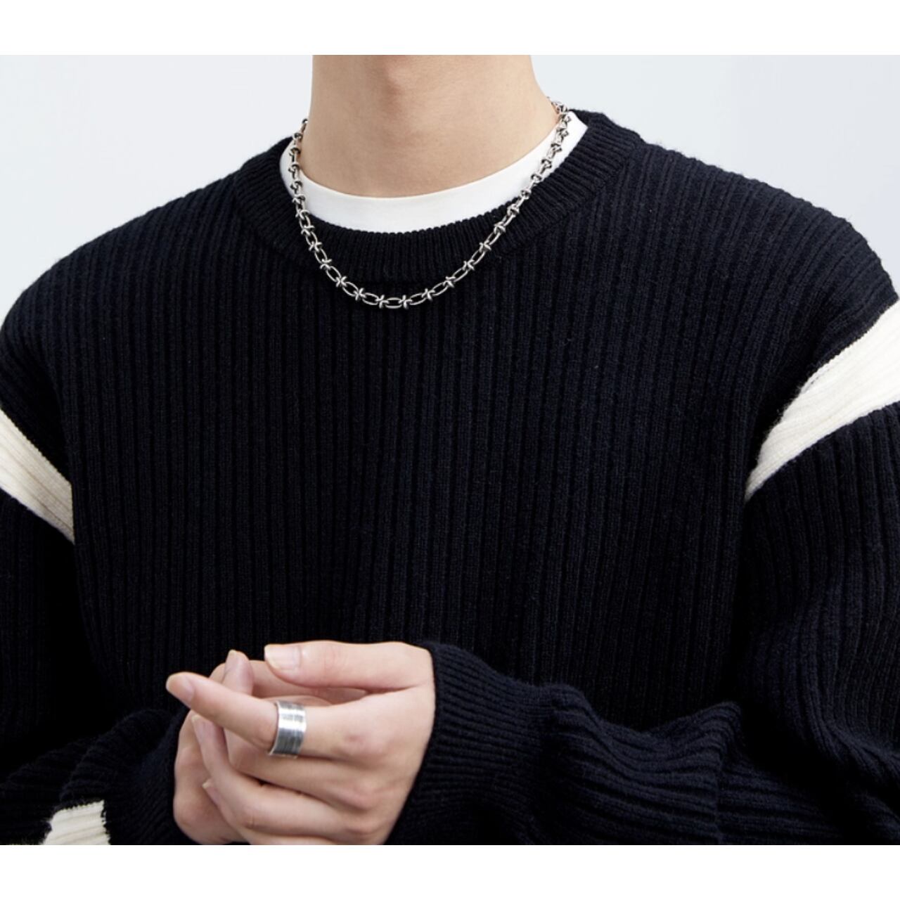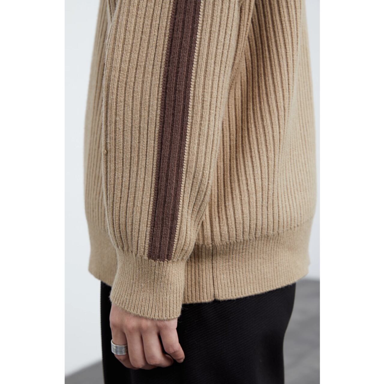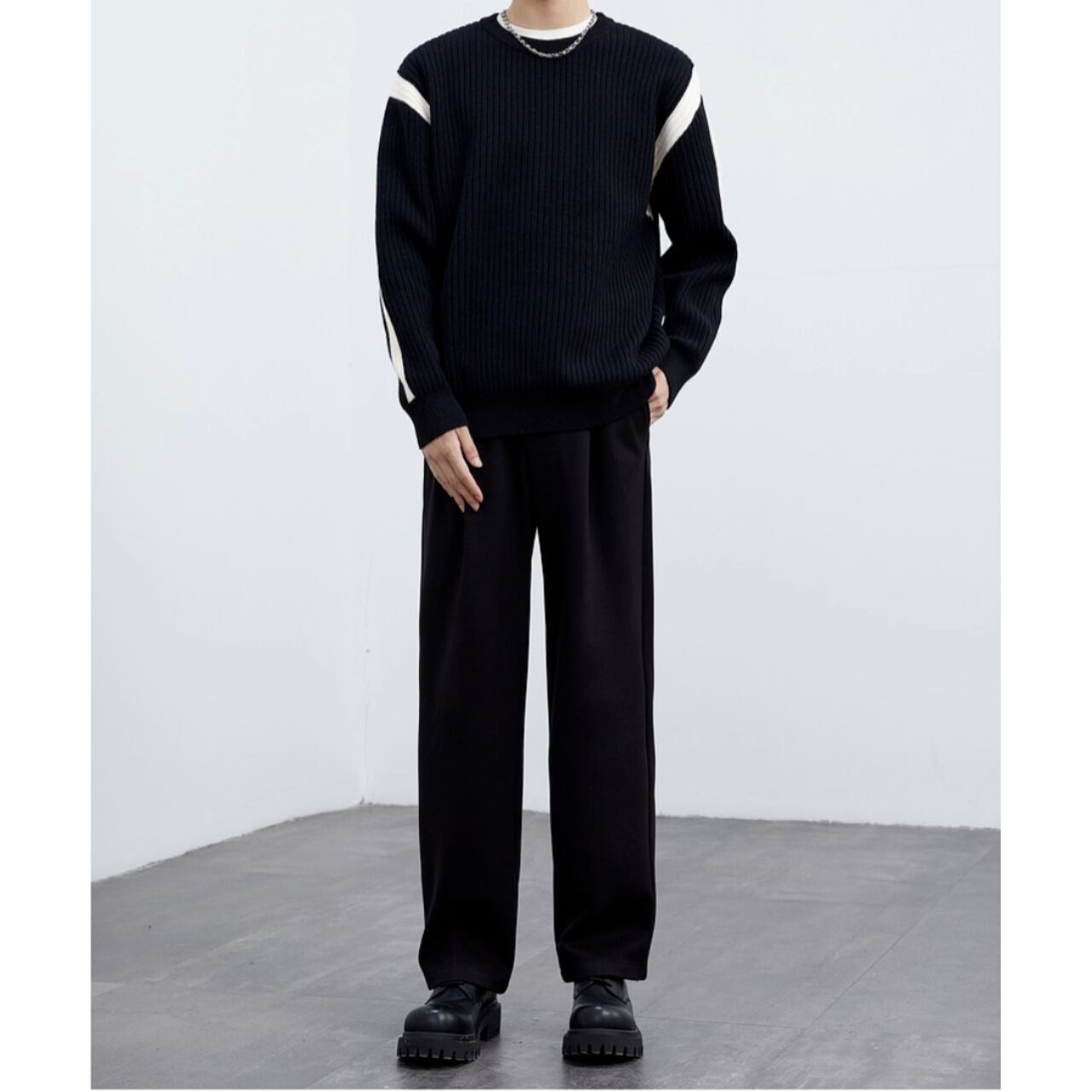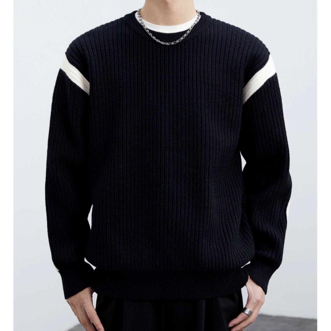 リブ編みのクルーネックニットは、ドロップショルダーとワイドシルエットが特徴です。