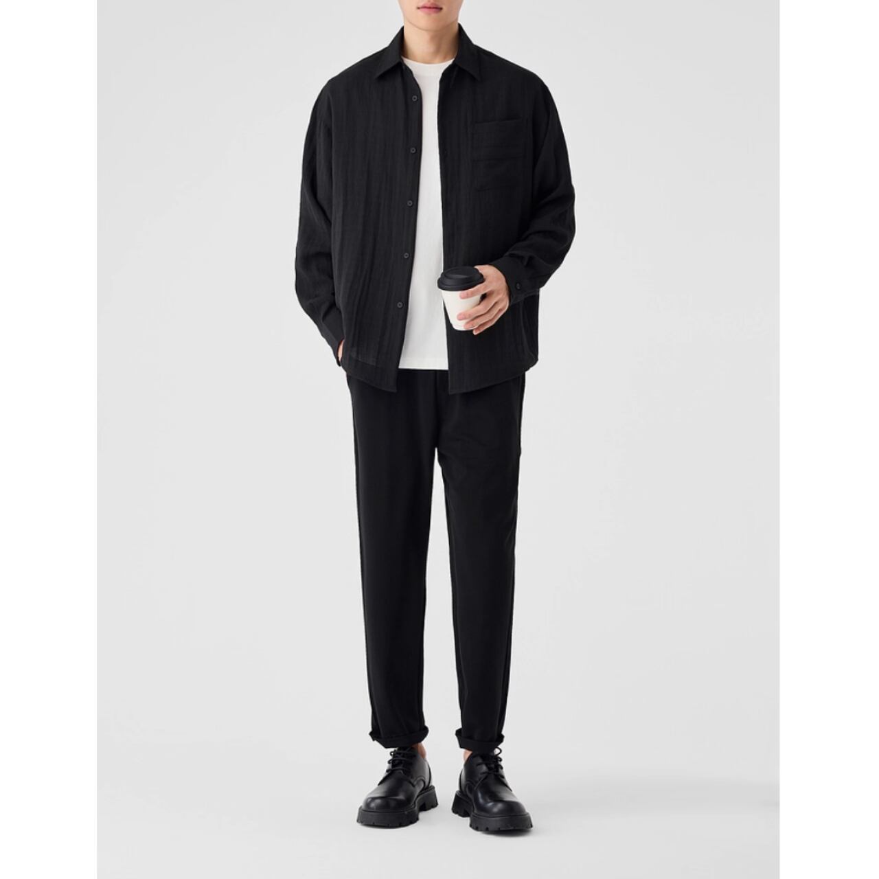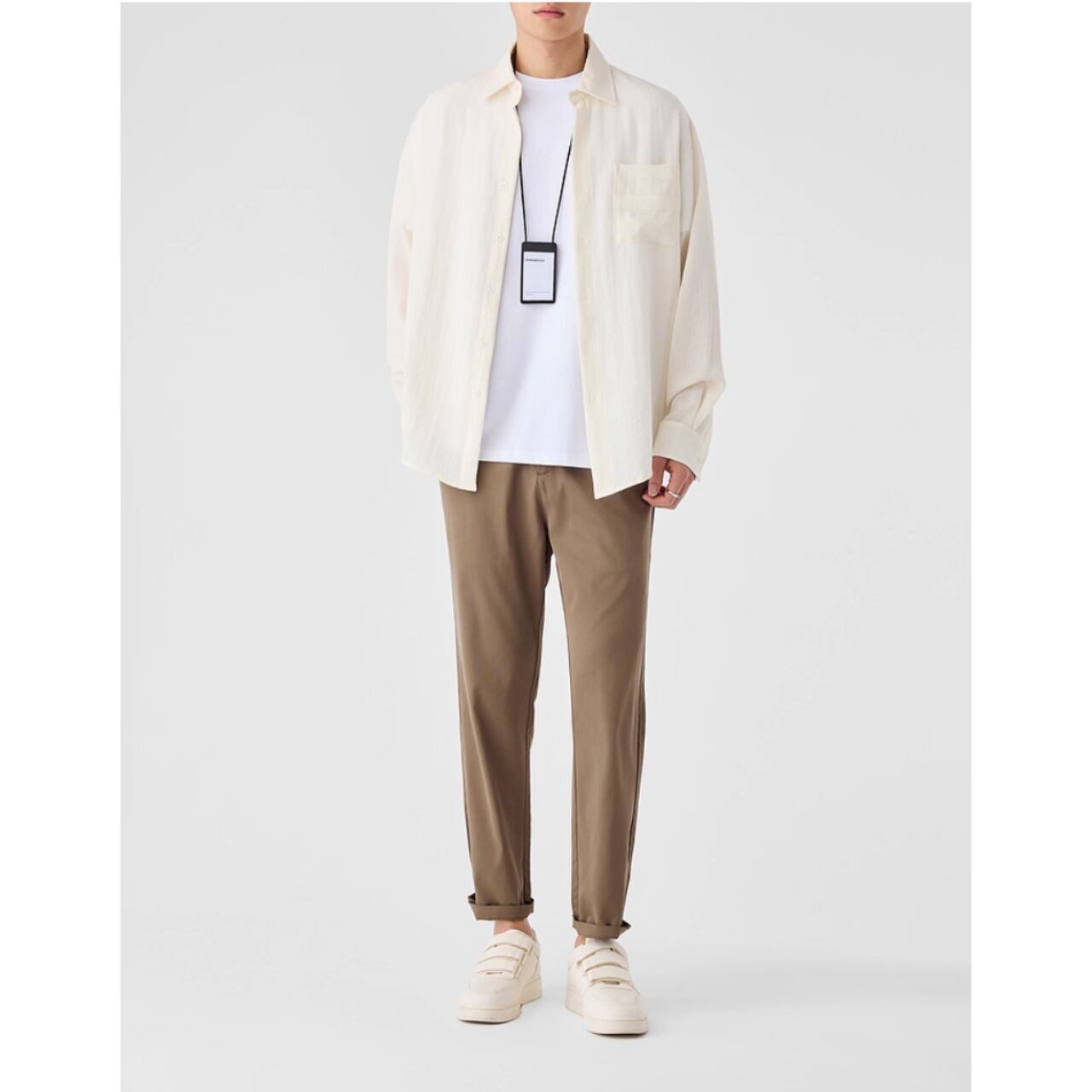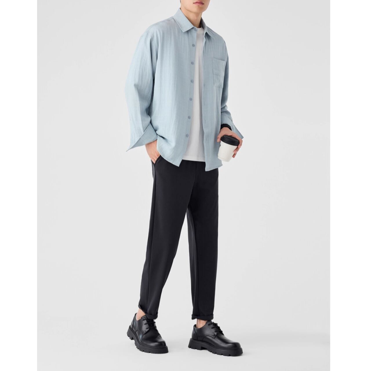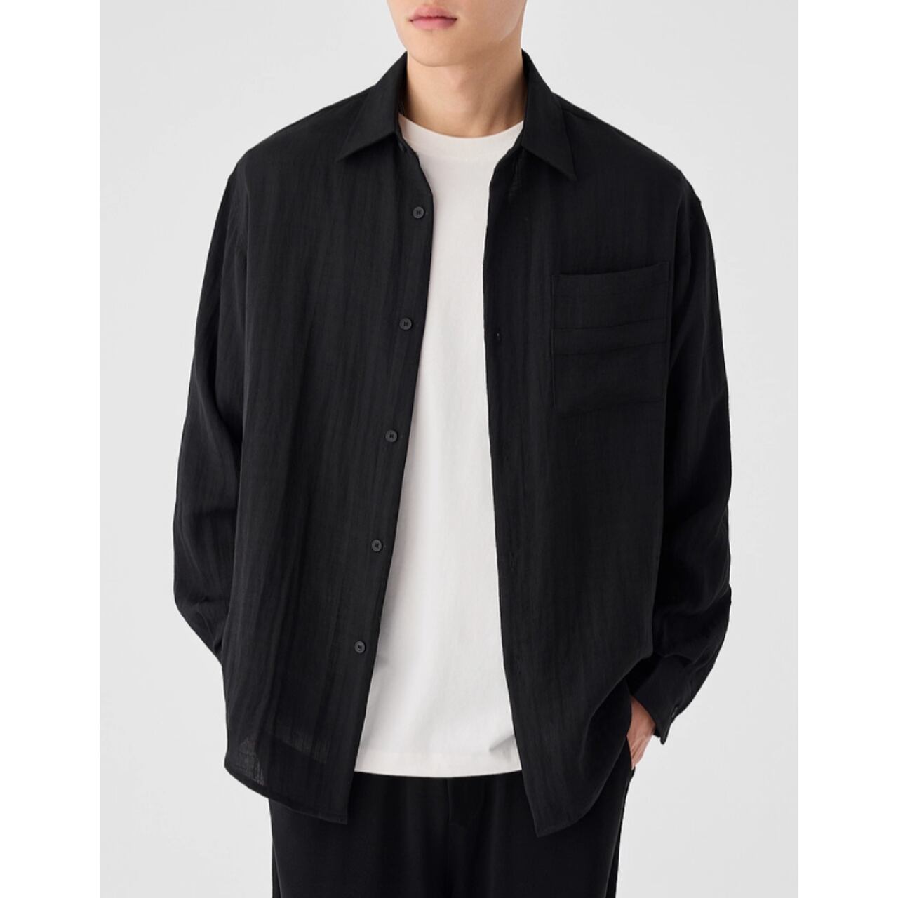 胸元のポケットがさりげないアクセントとなり、シンプルなデザインながらも存在感を放ちます。