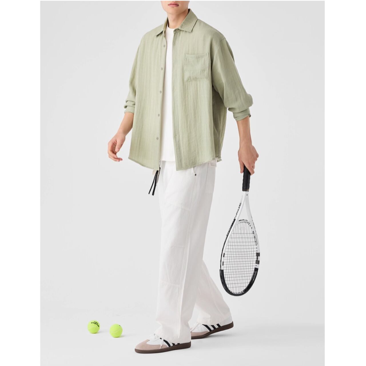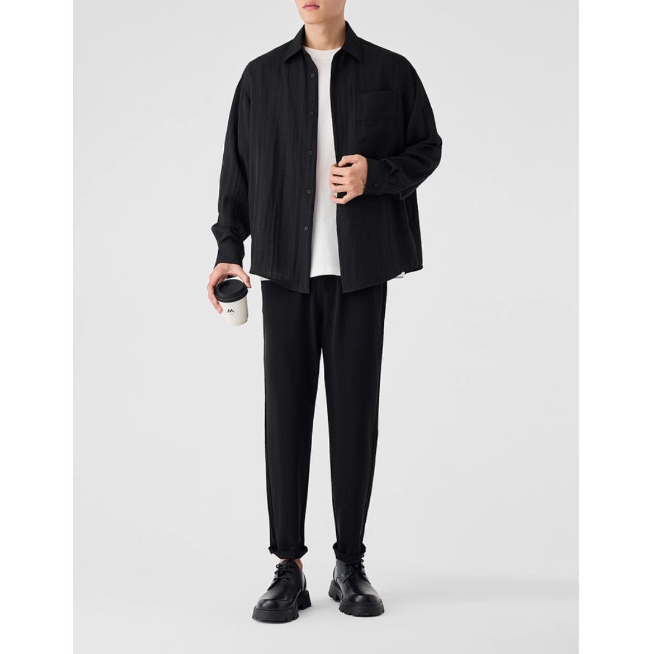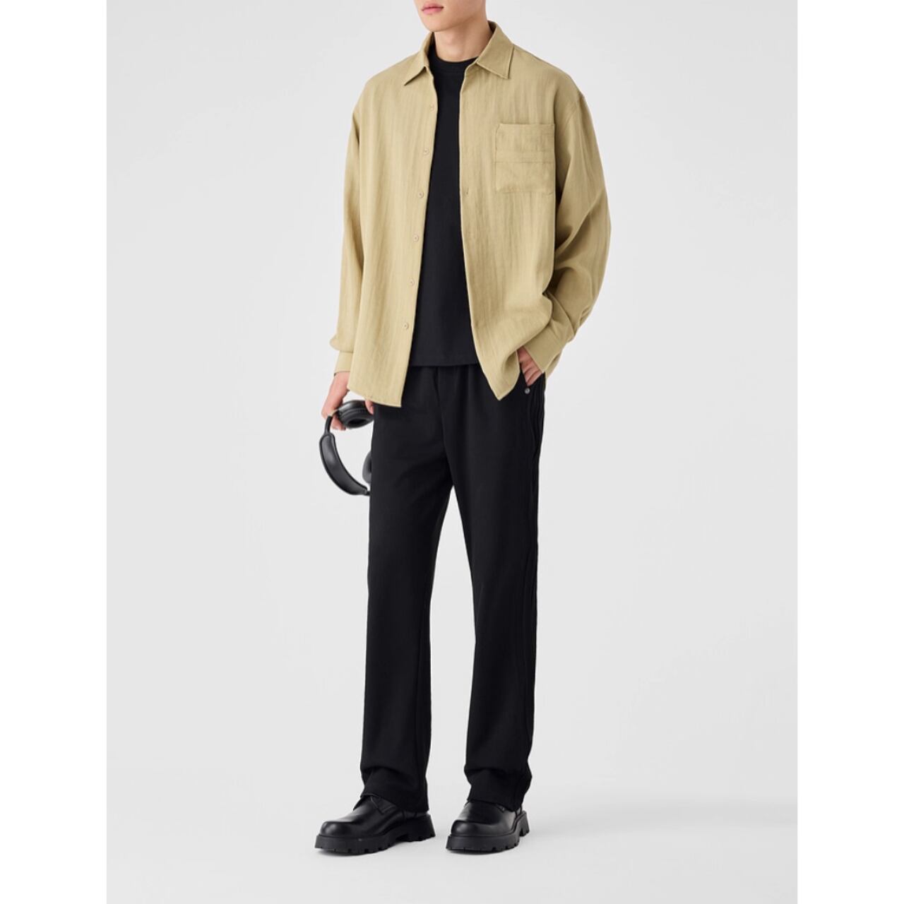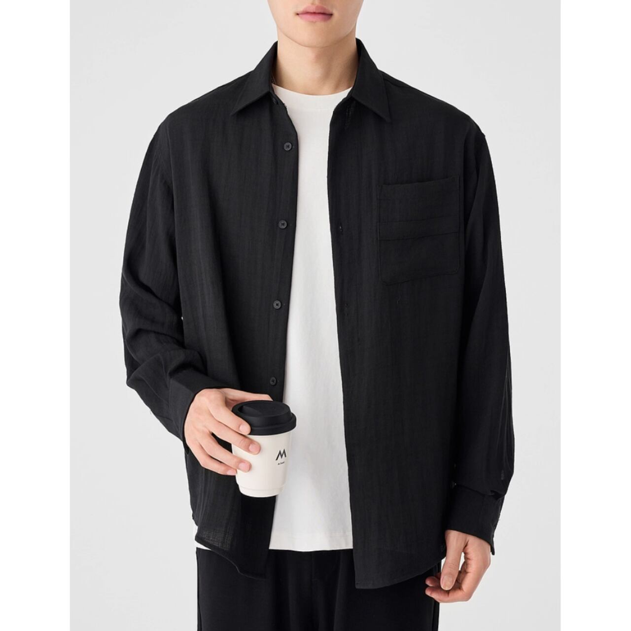 胸元のポケットがさりげないアクセントとなり、シンプルなデザインながらも存在感を放ちます。