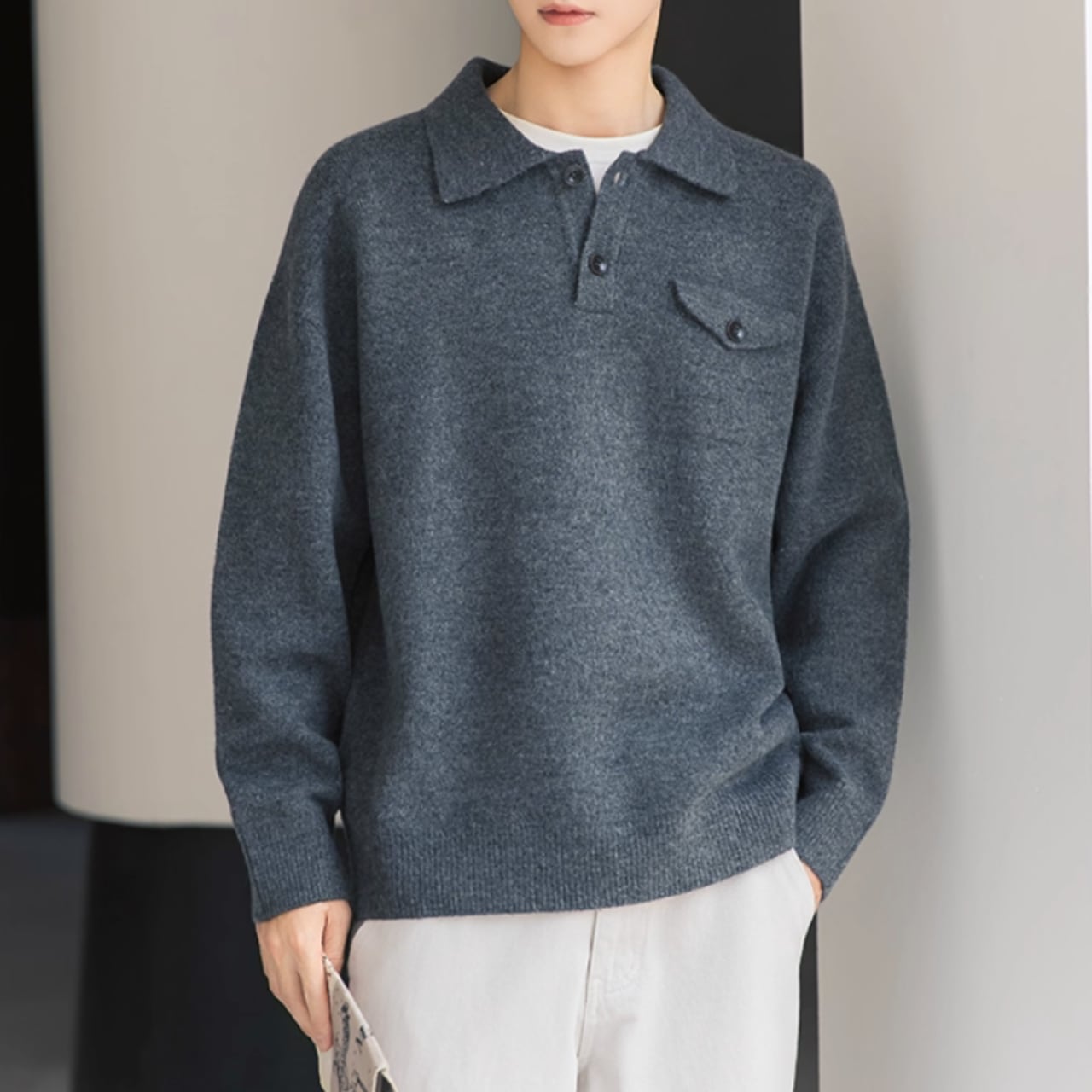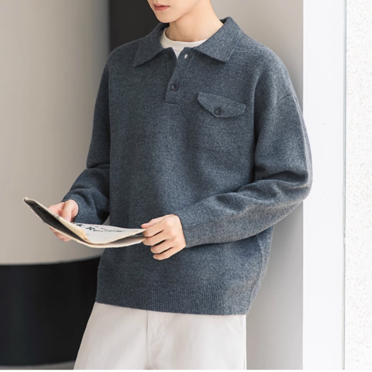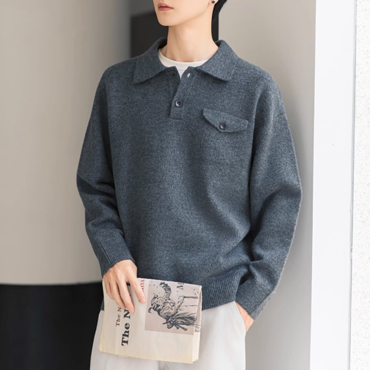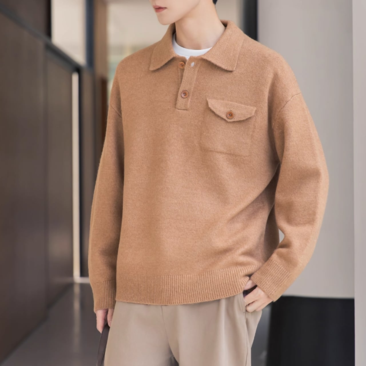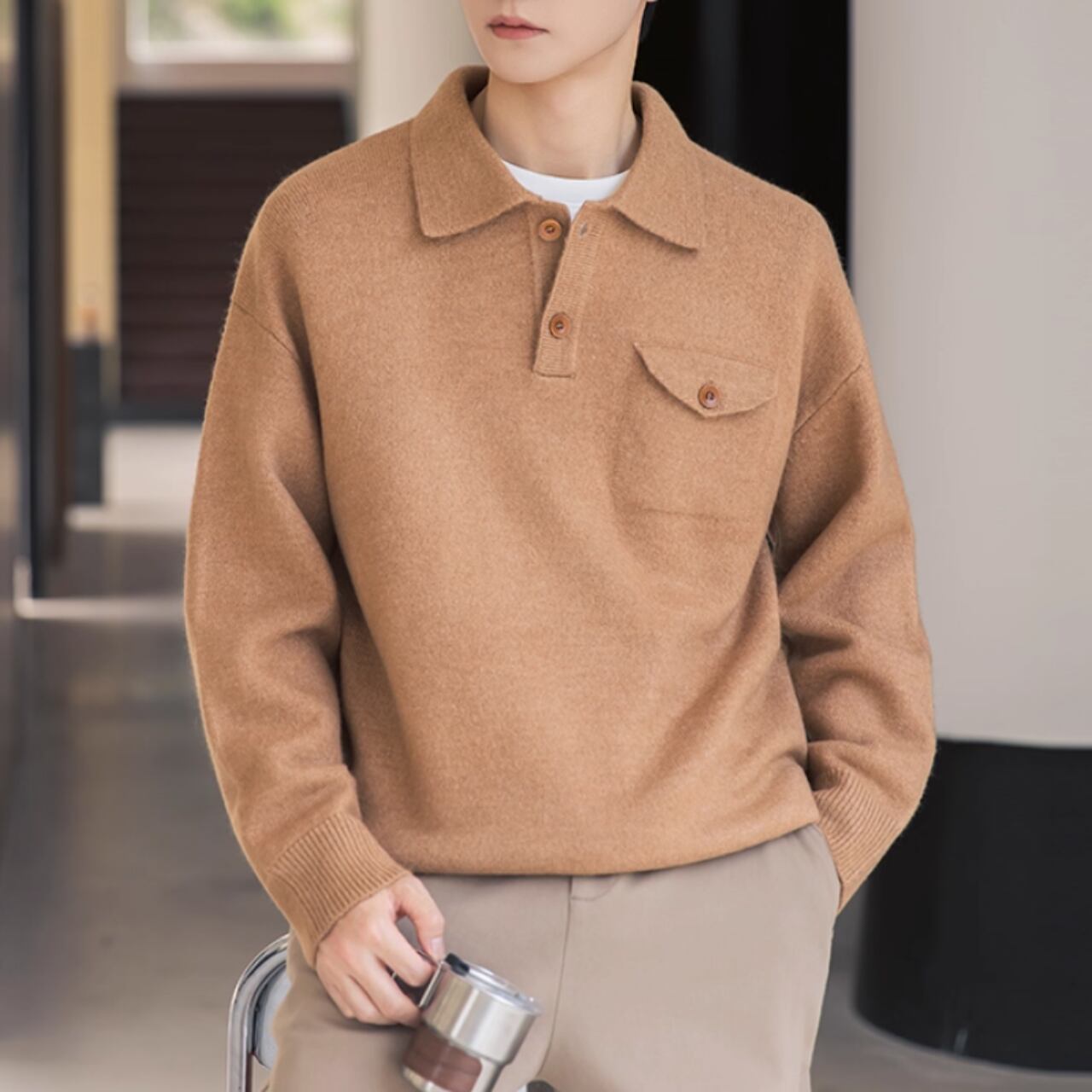 シンプルながらも上品な印象を与えるニットポロシャツ。