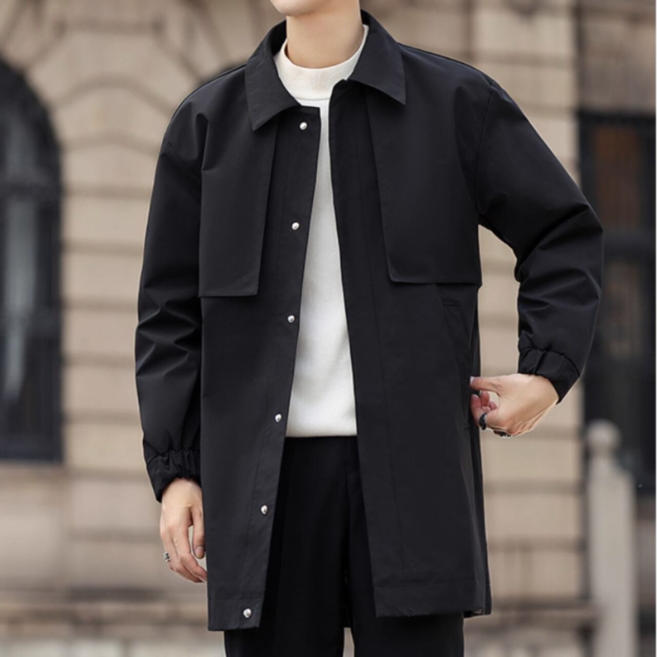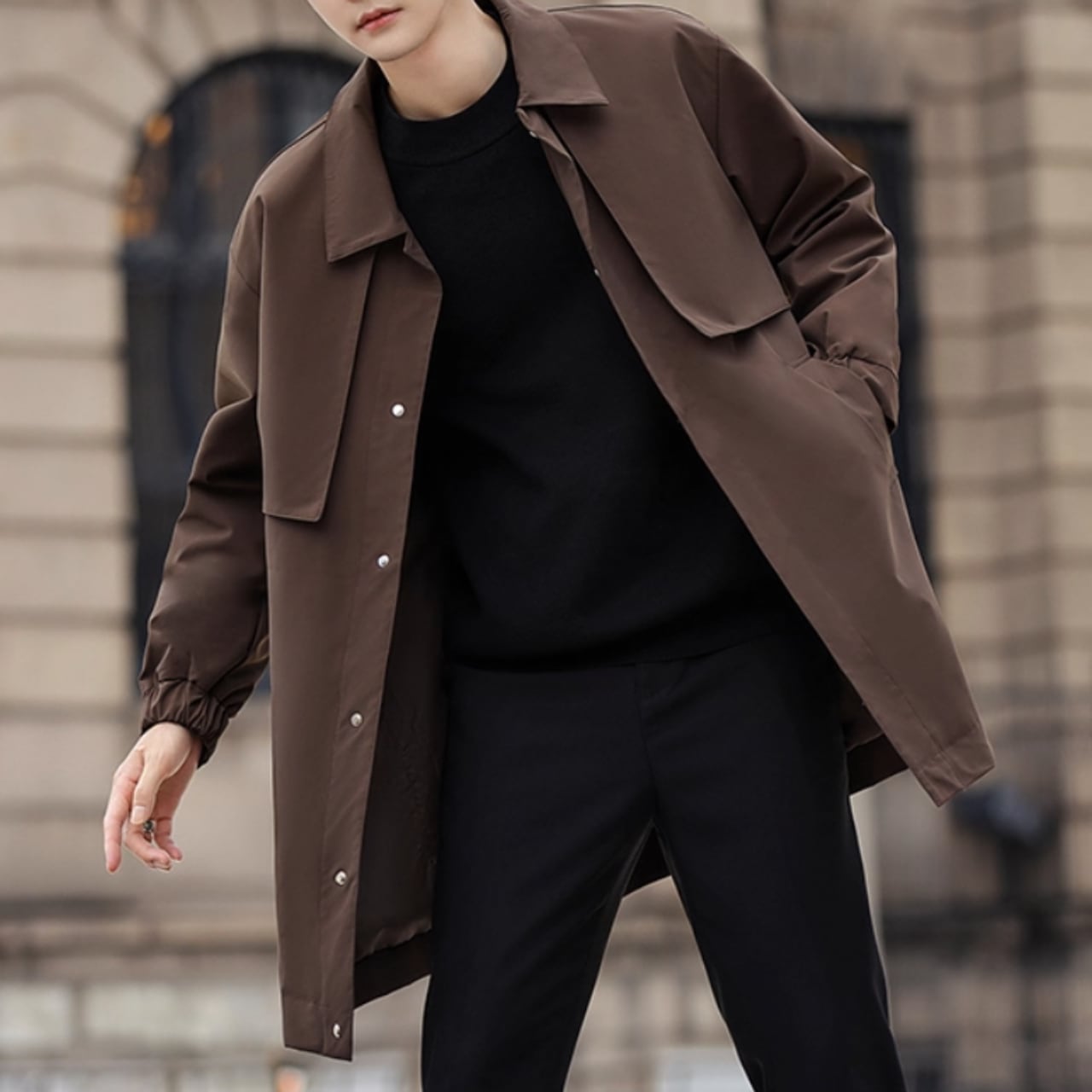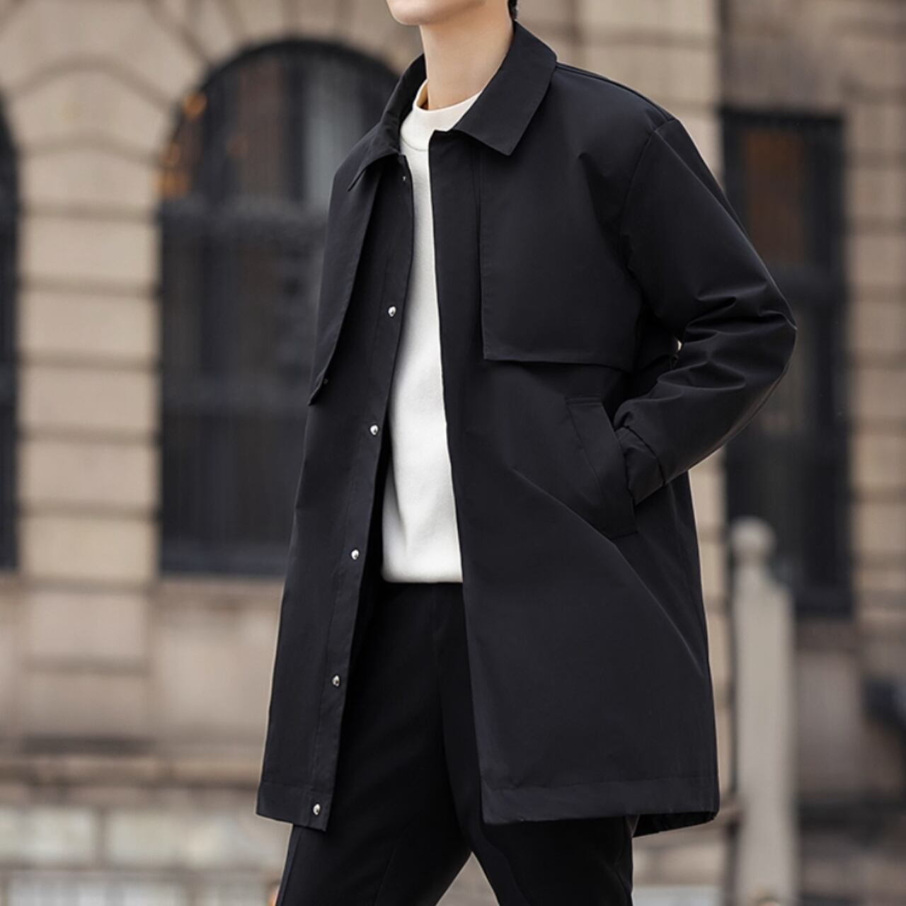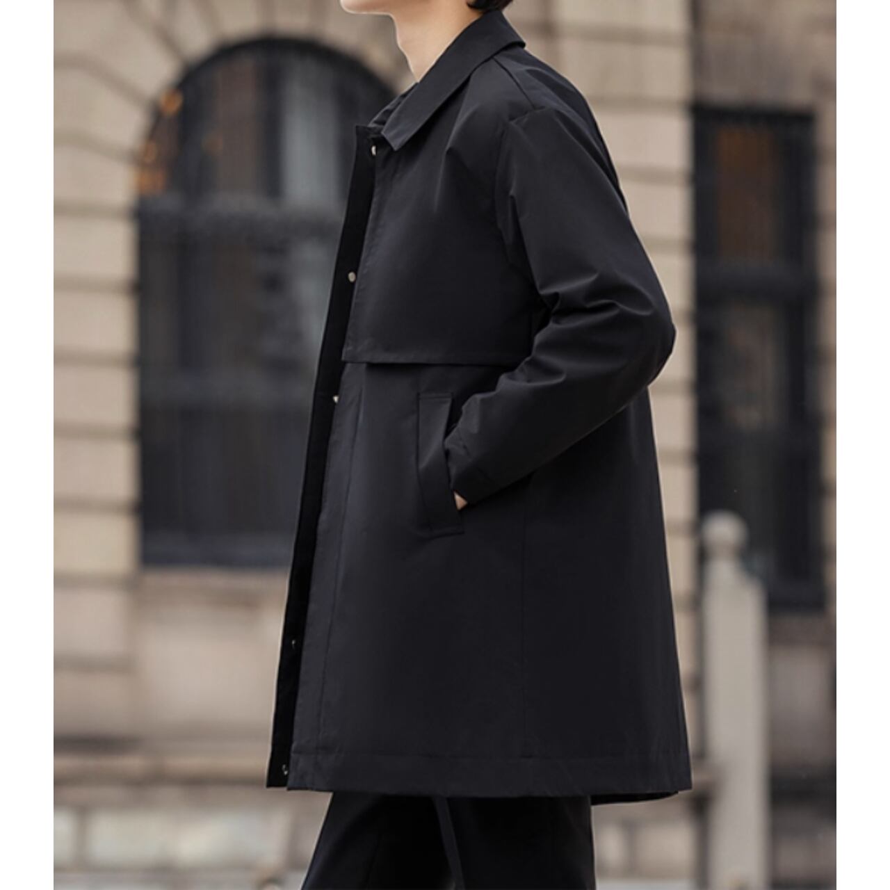 洗練されたシルエットが魅力のカジュアルコート。