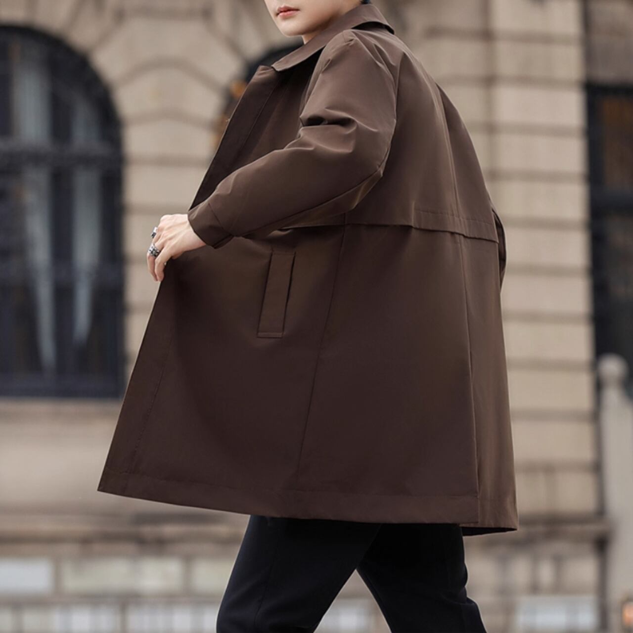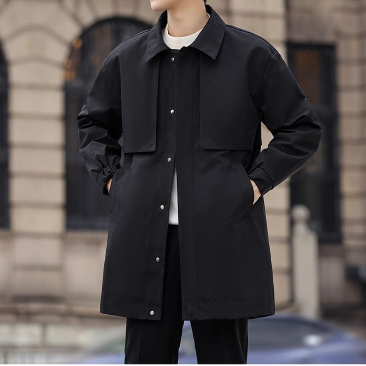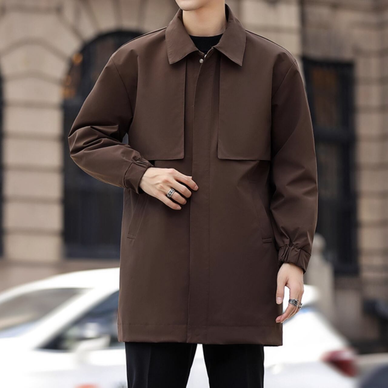 洗練されたシルエットが魅力のカジュアルコート。