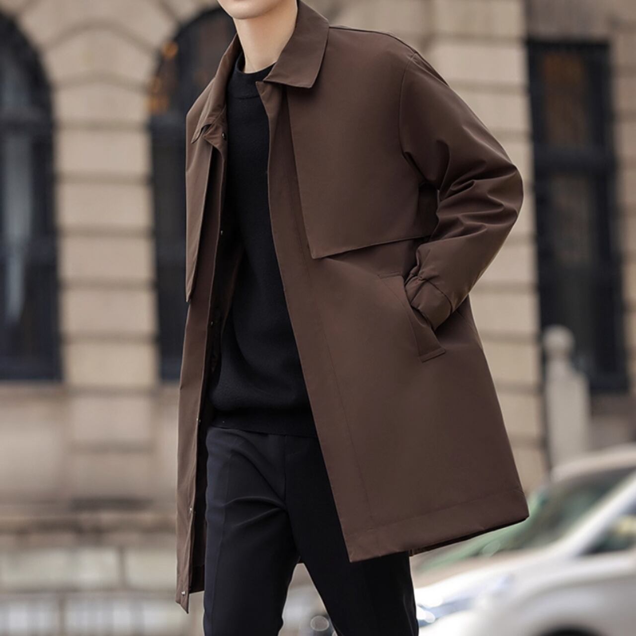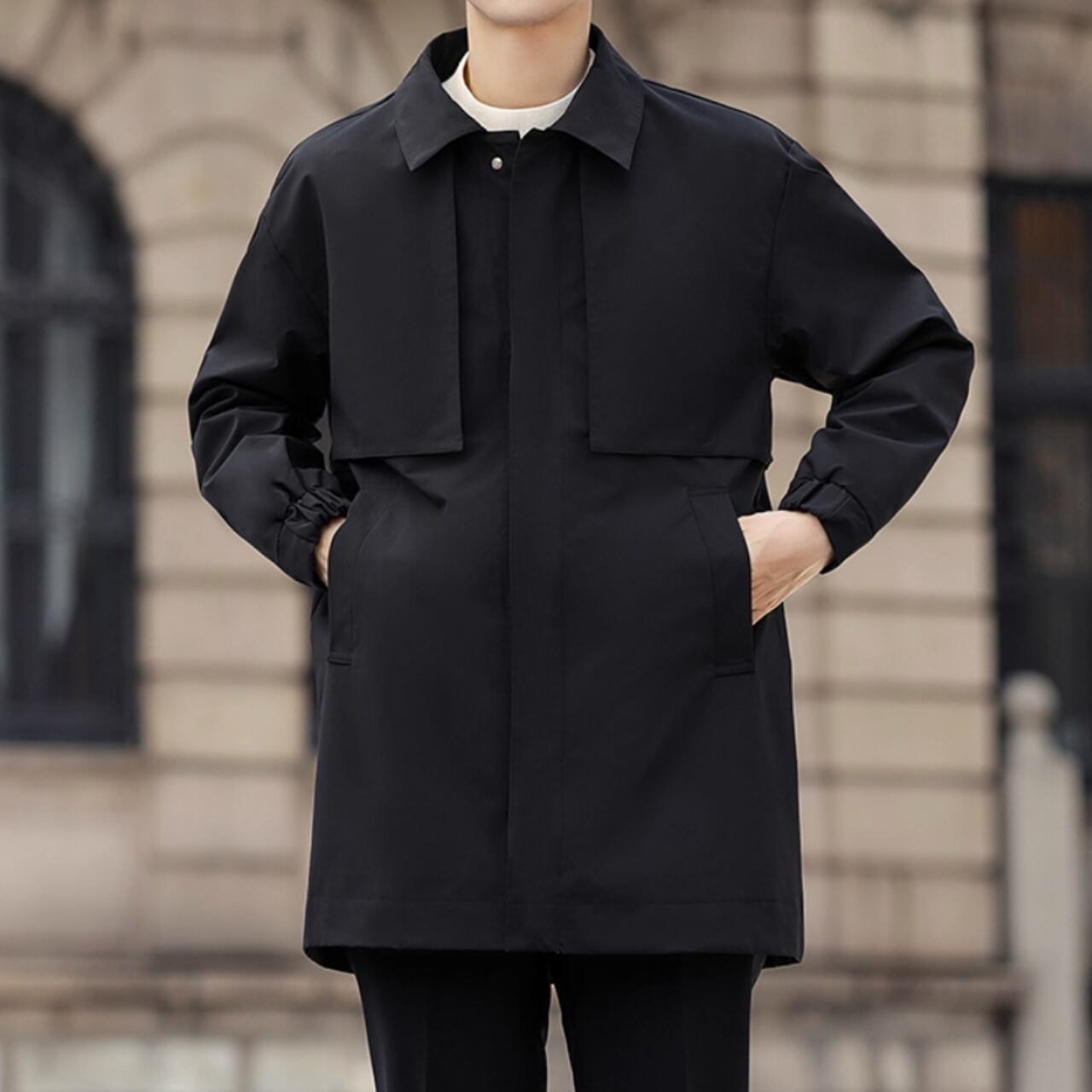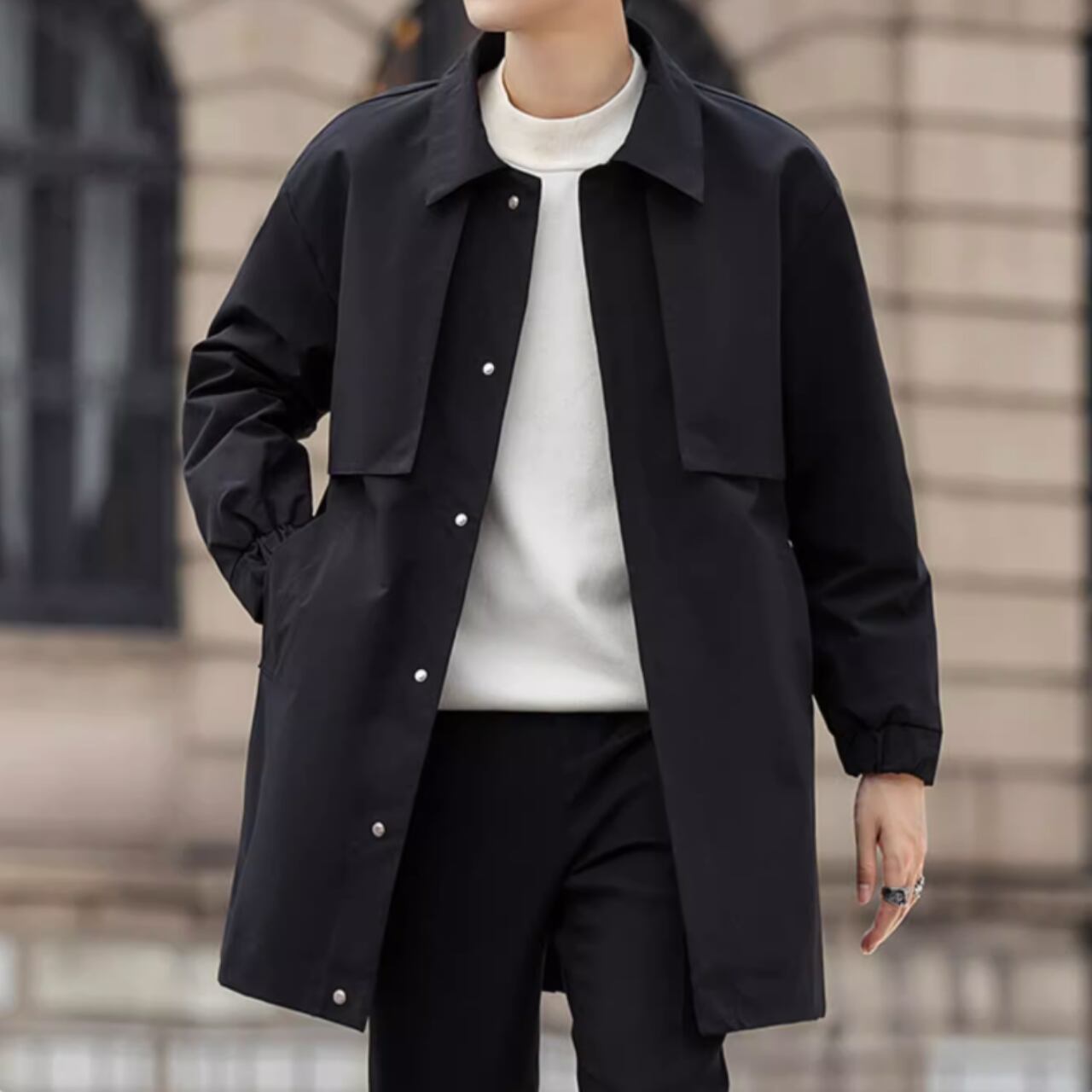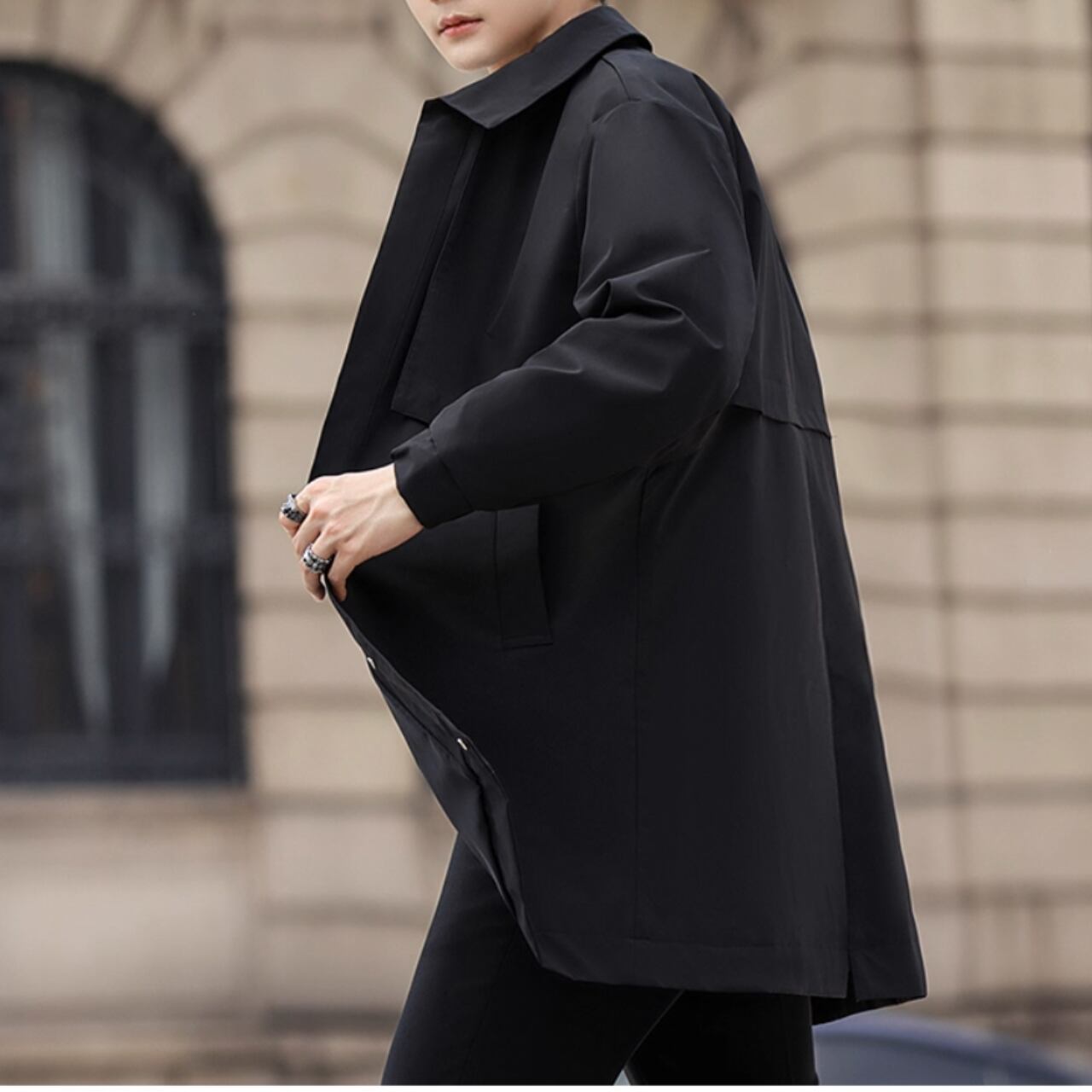 洗練されたシルエットが魅力のカジュアルコート。