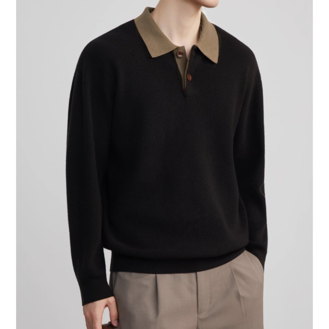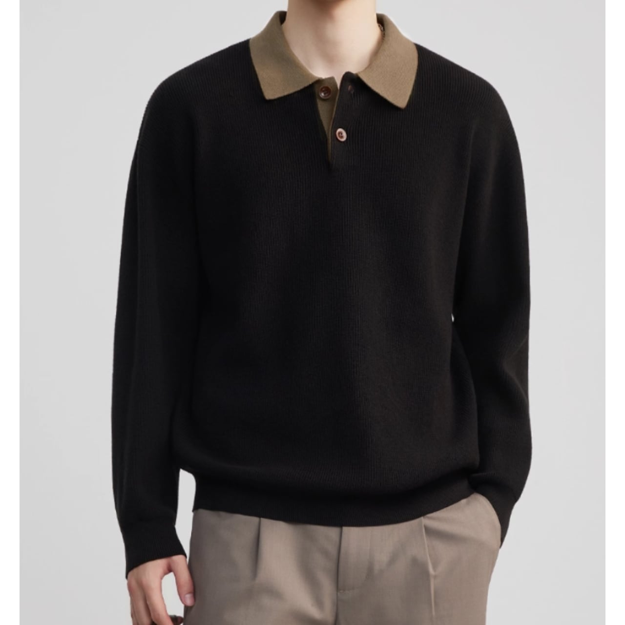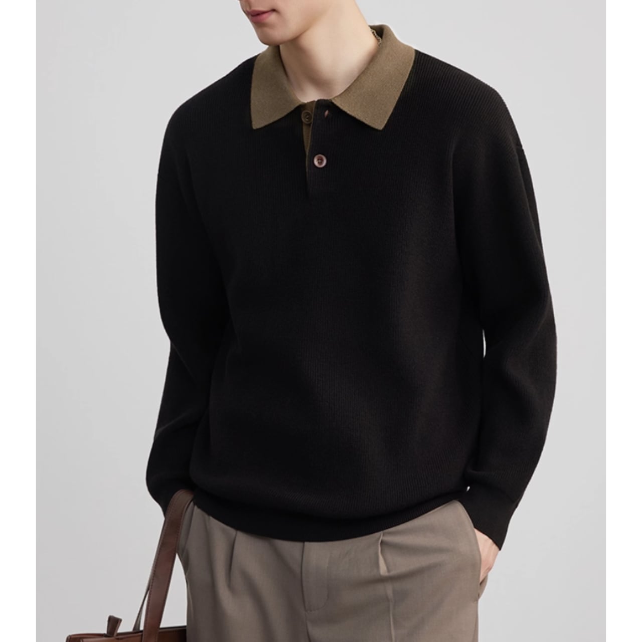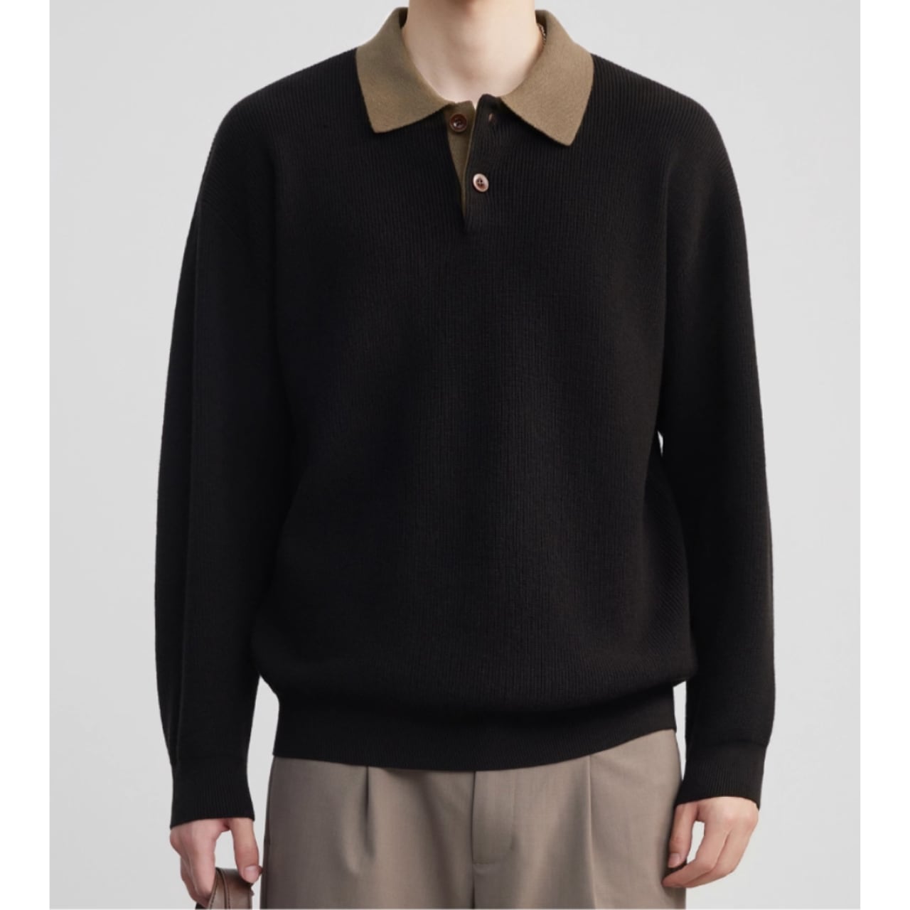 シンプルながらも、洗練された印象を与える長袖ニットポロシャツ。