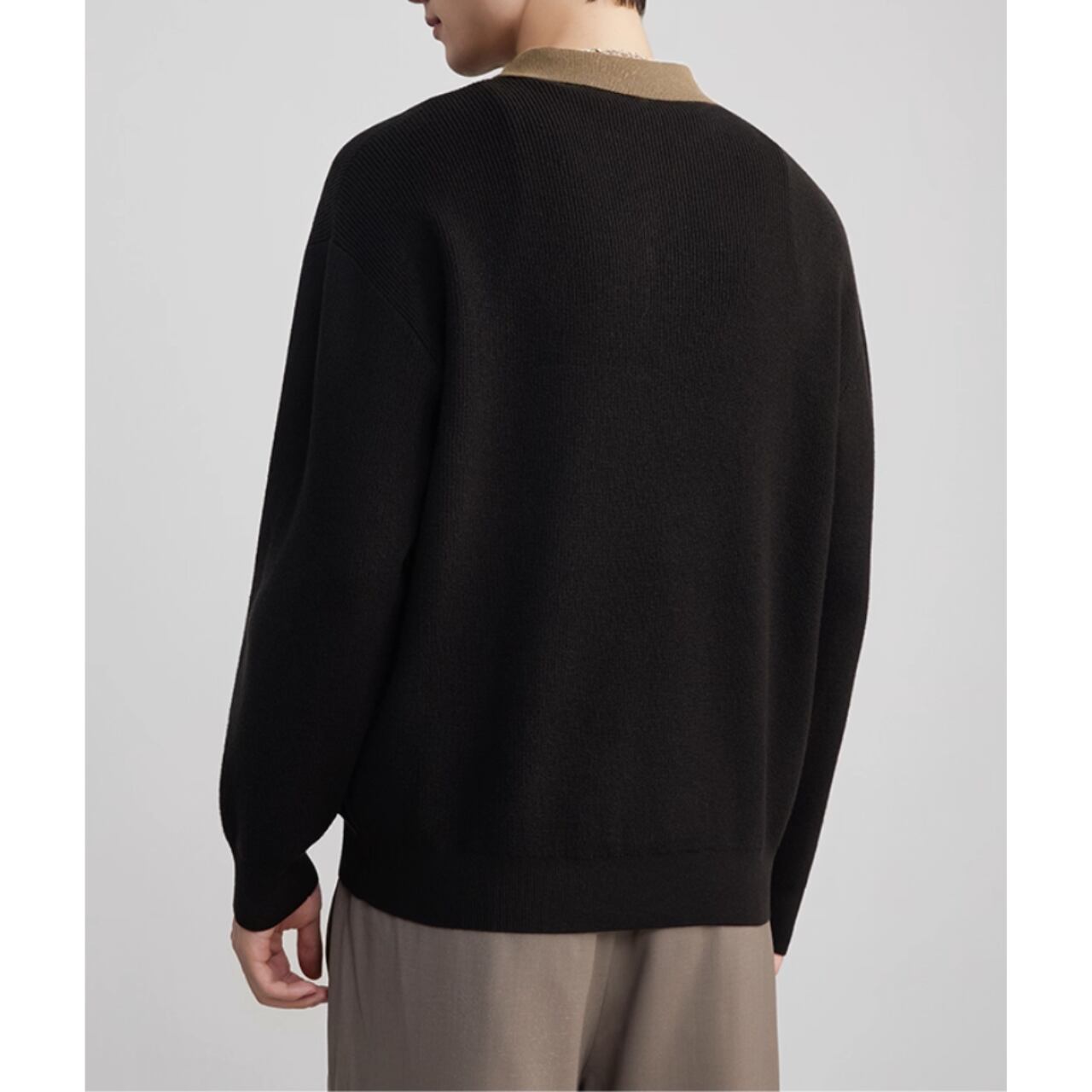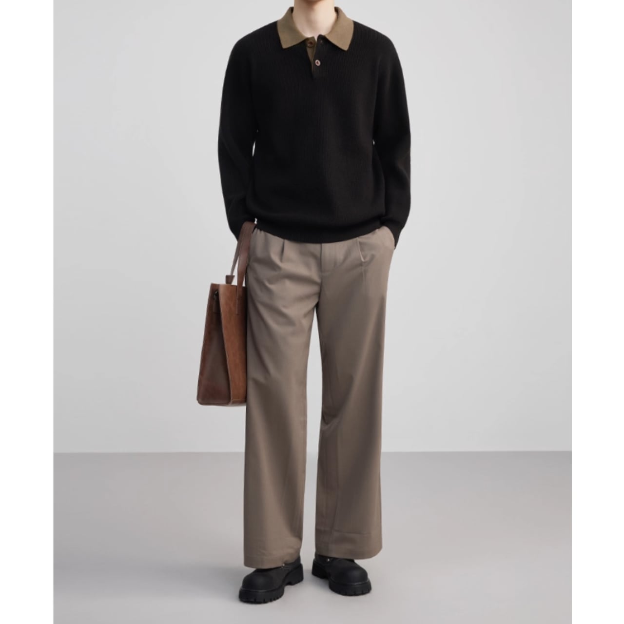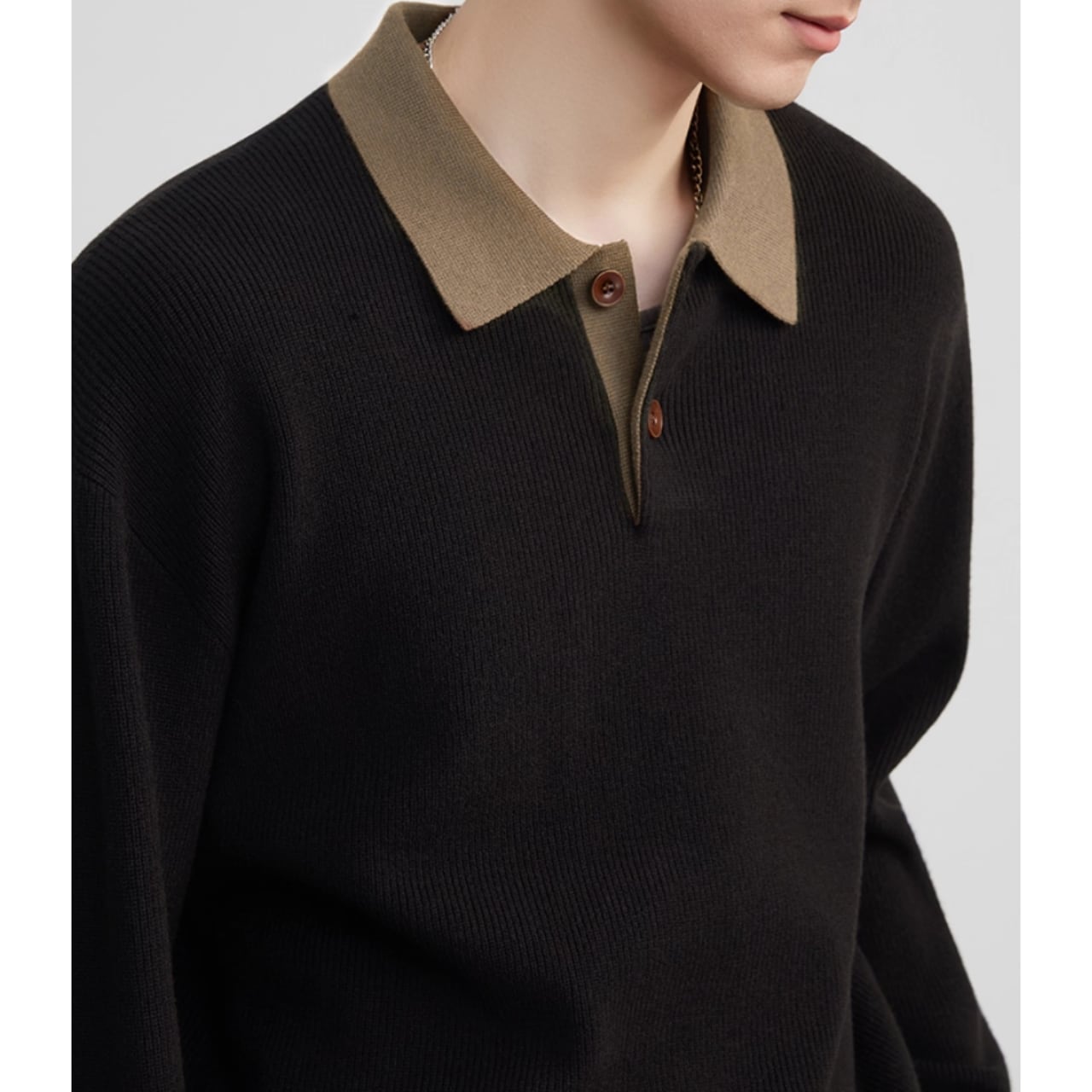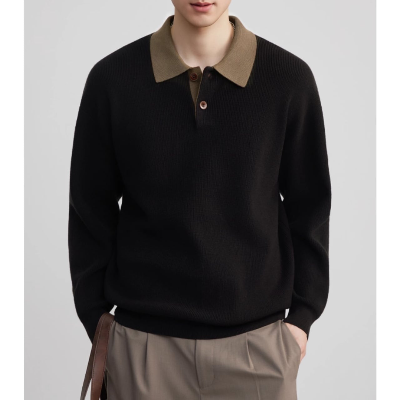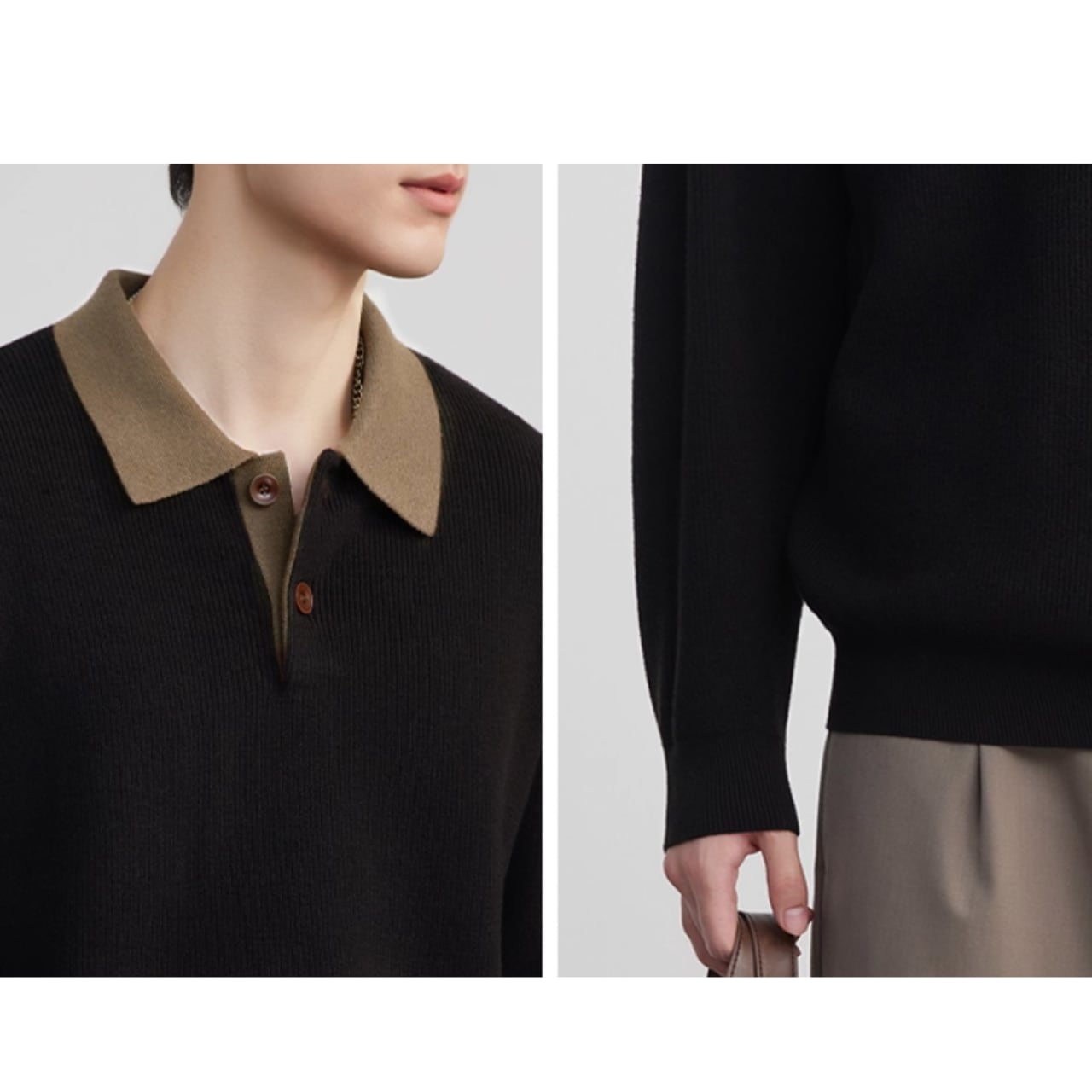 シンプルながらも、洗練された印象を与える長袖ニットポロシャツ。
