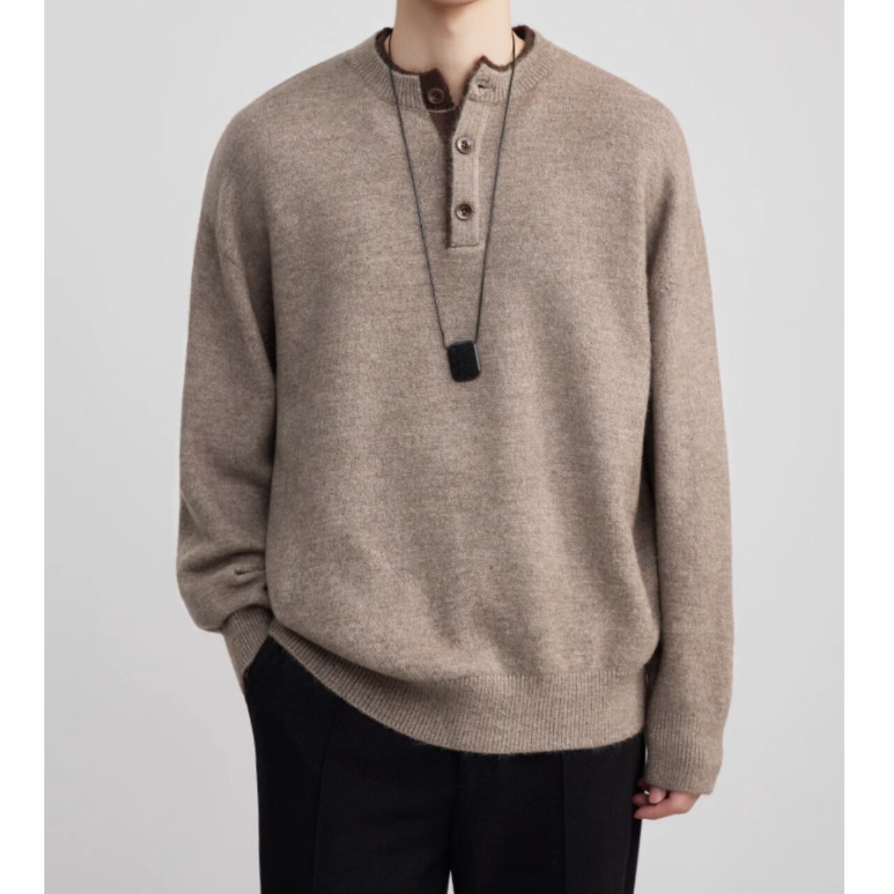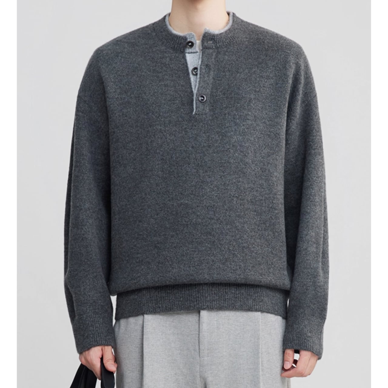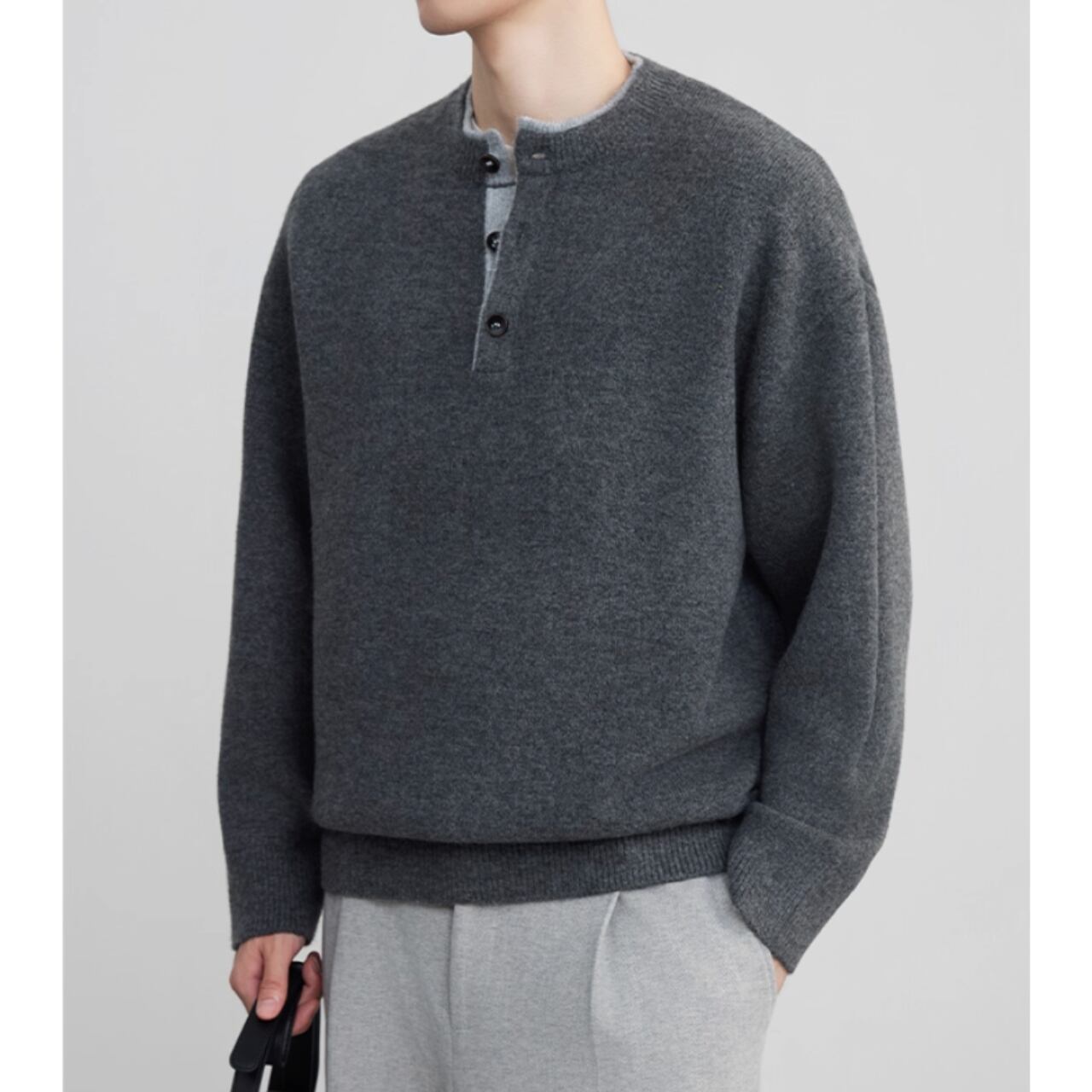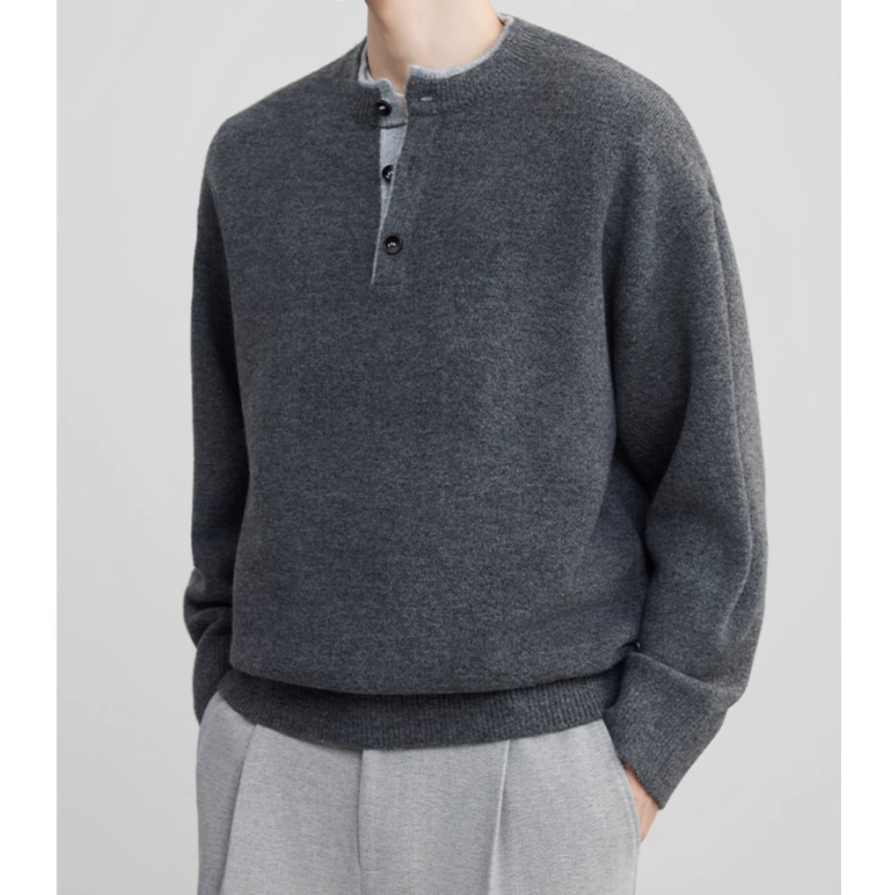 シンプルで落ち着いた印象のヘンリーネック長袖ニット。