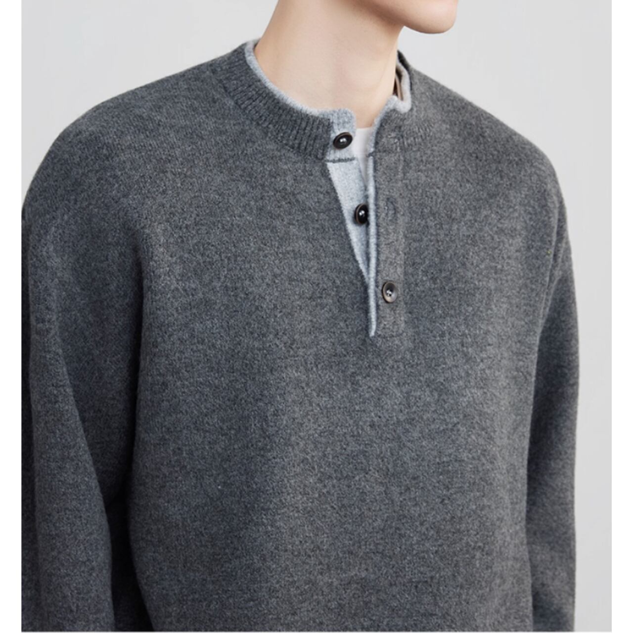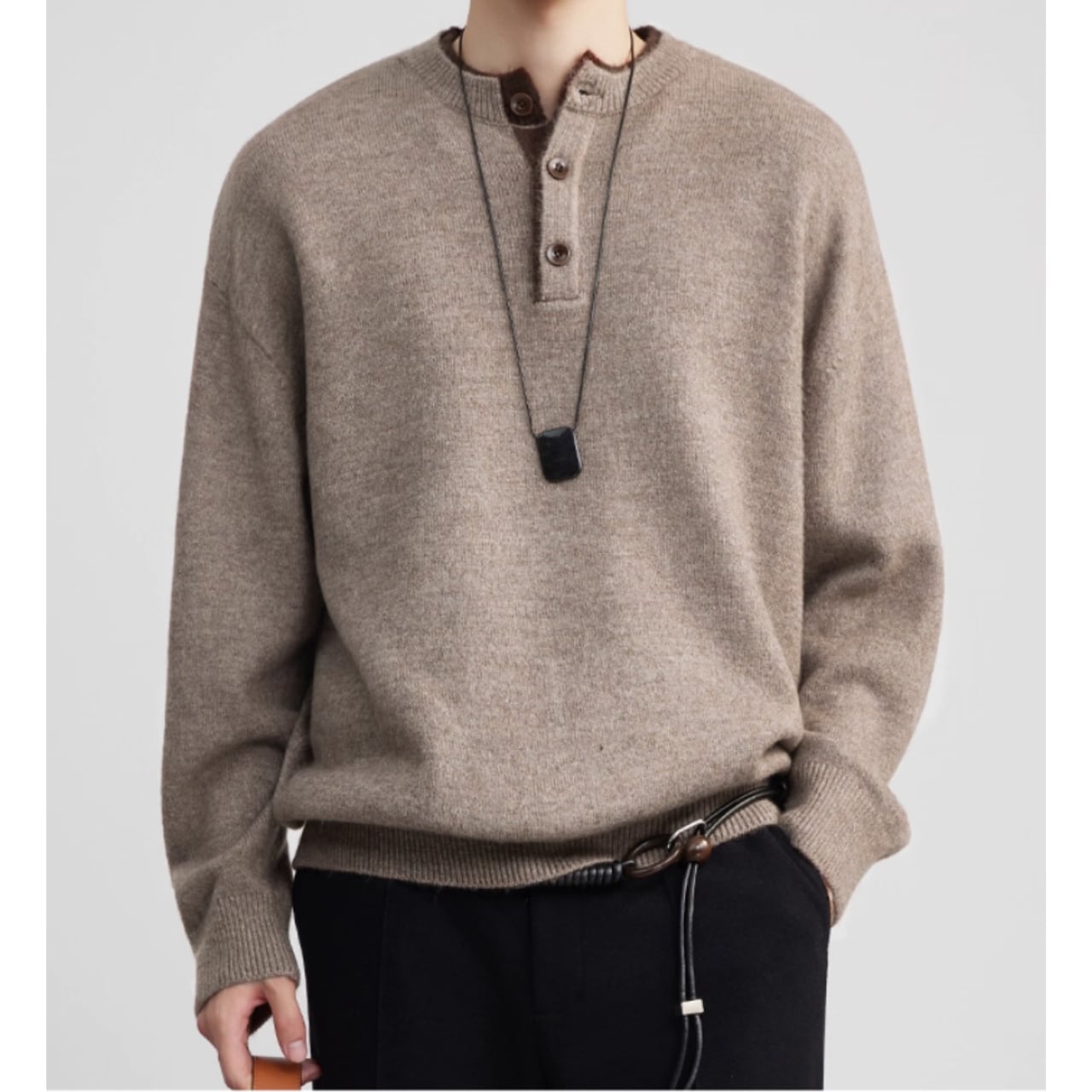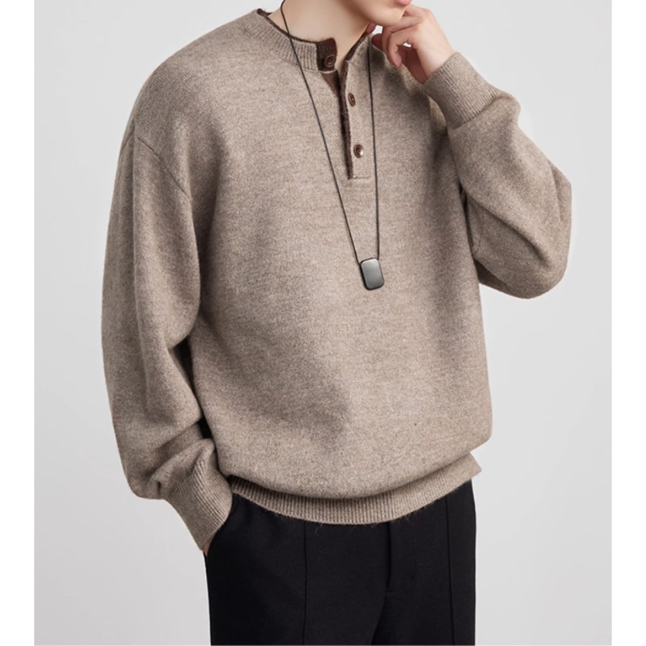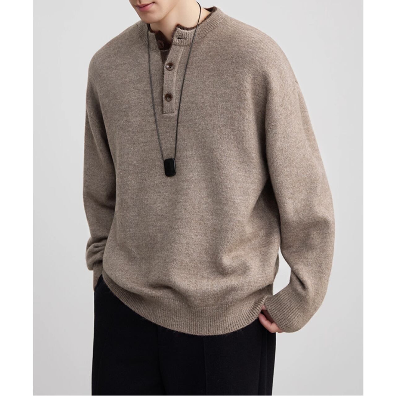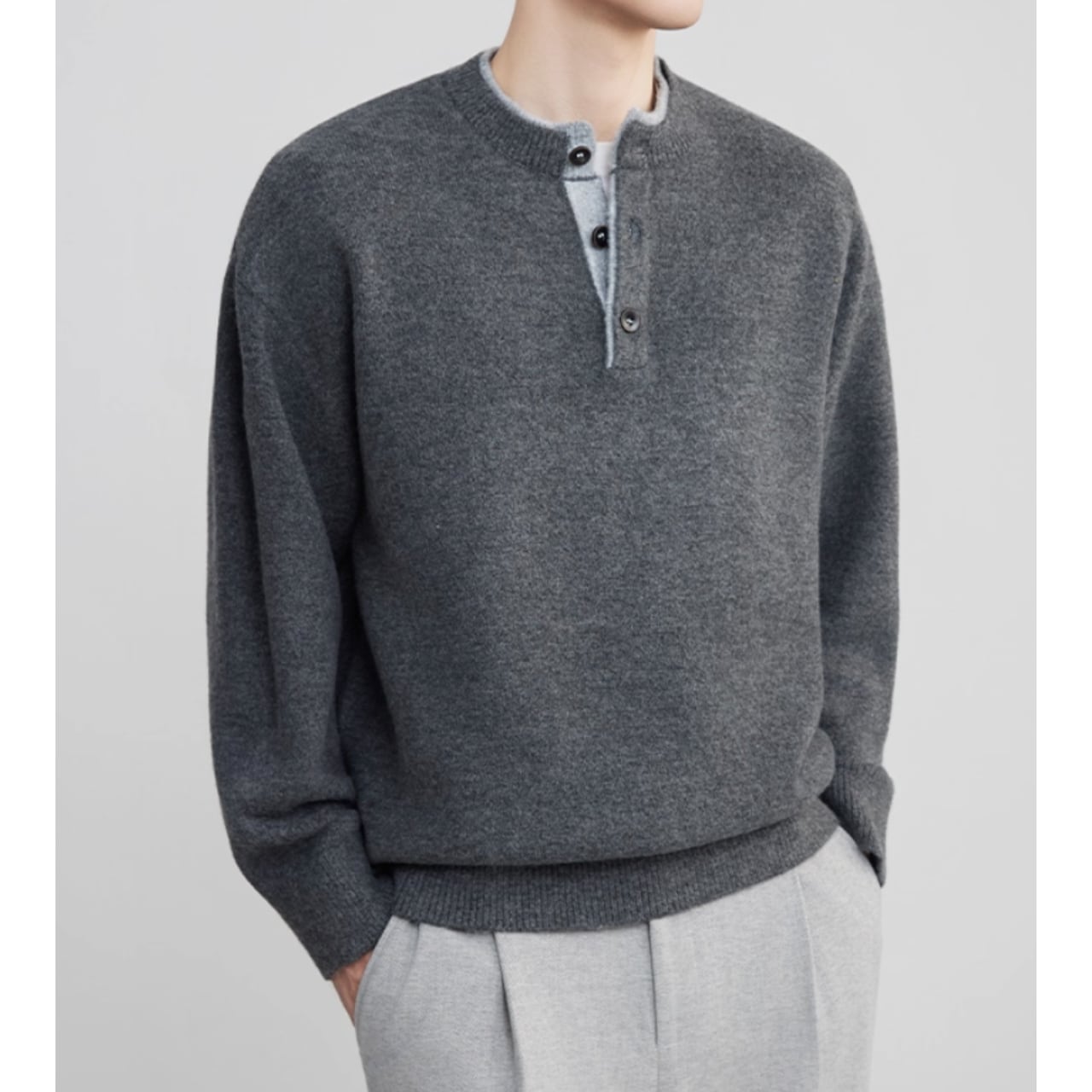 シンプルで落ち着いた印象のヘンリーネック長袖ニット。