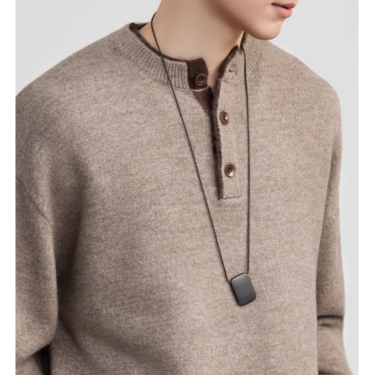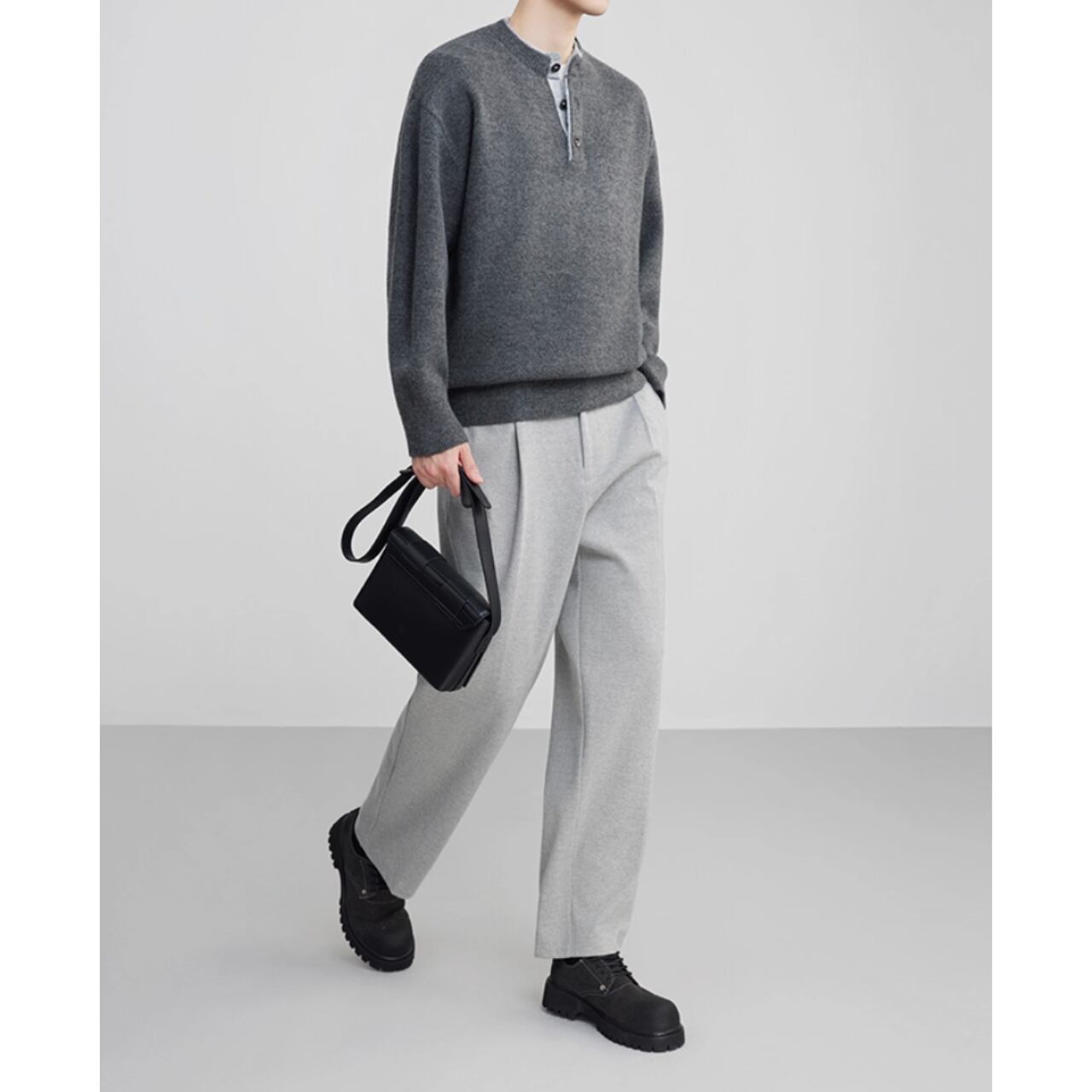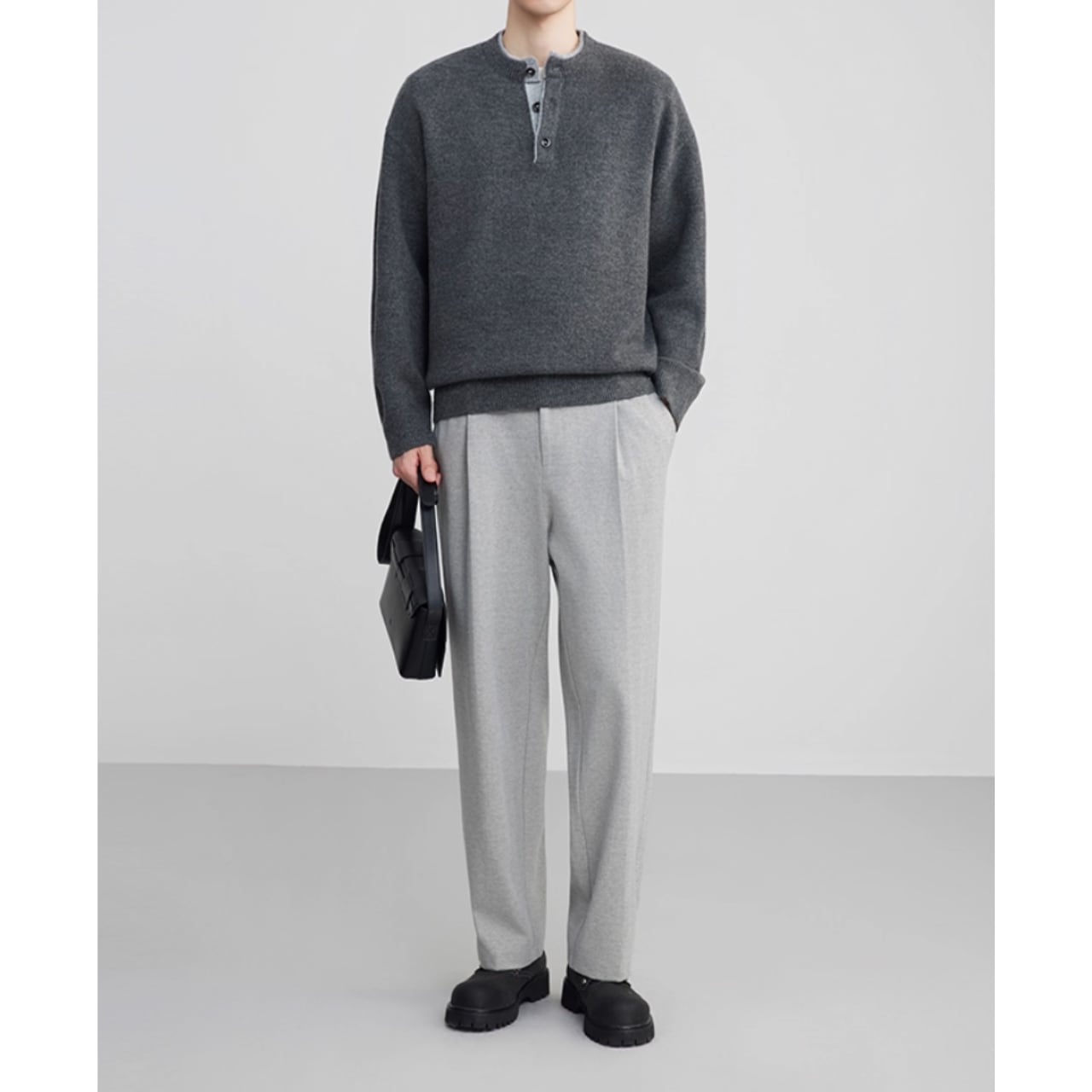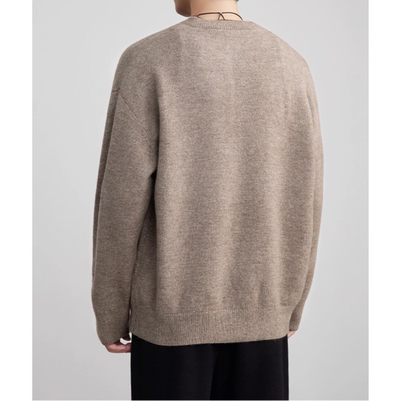 シンプルで落ち着いた印象のヘンリーネック長袖ニット。