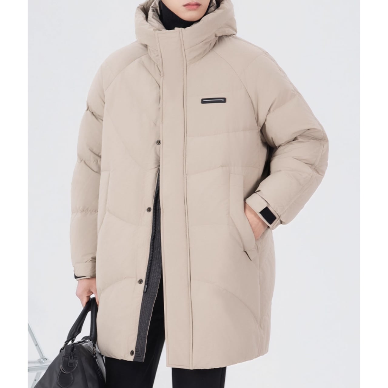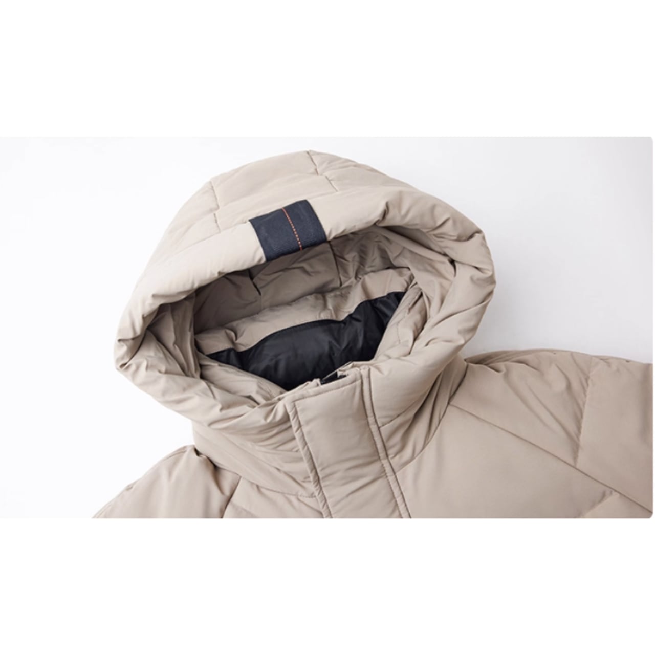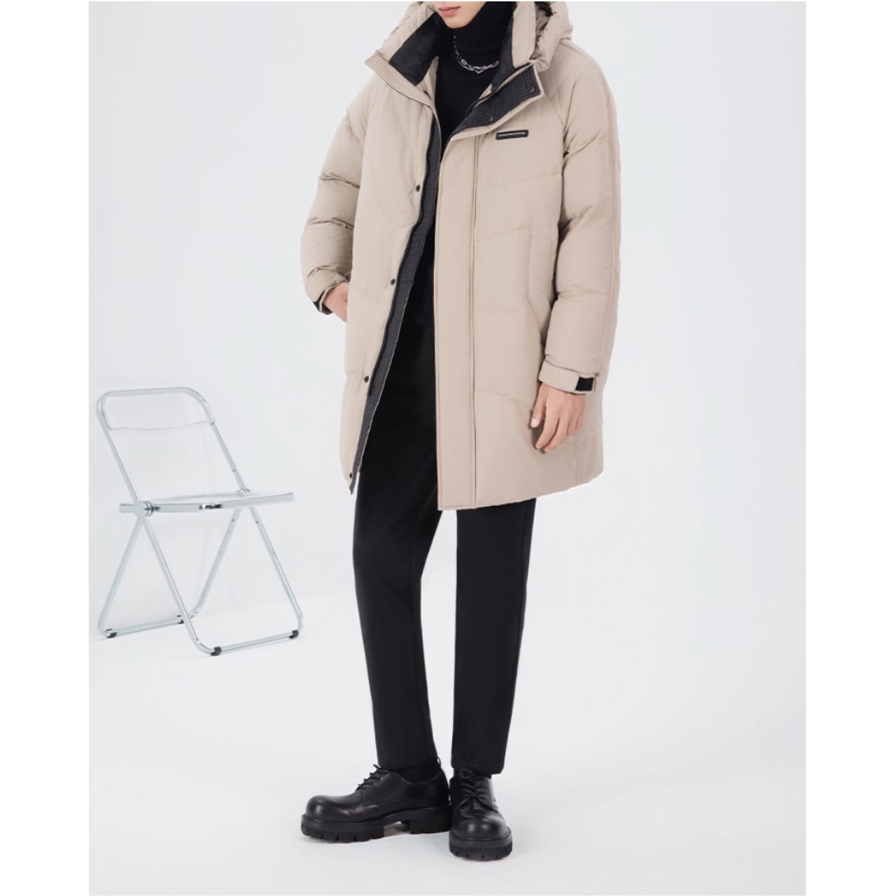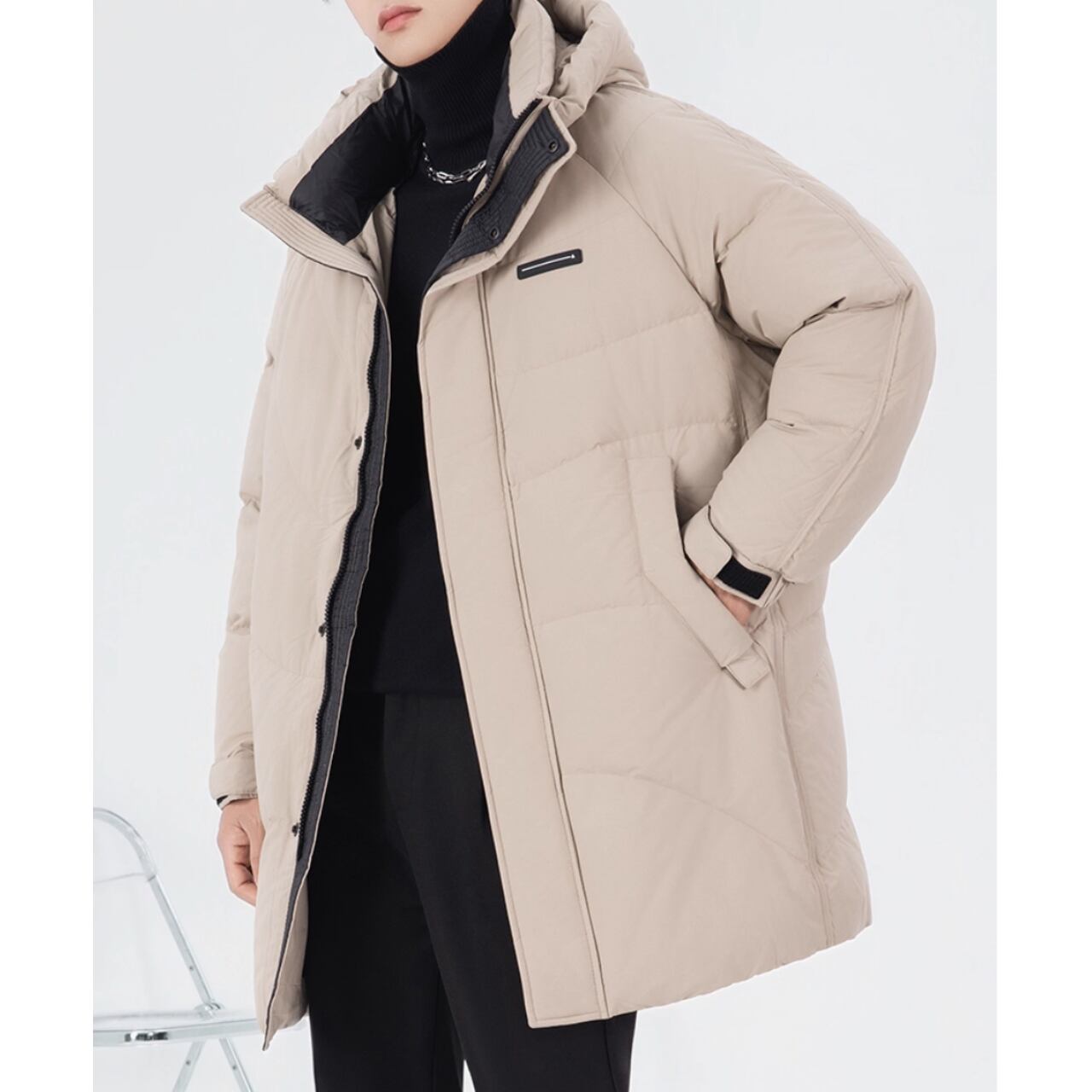 フード付きでカジュアルな印象を与えつつ、ボタンフロントのデザインが上品さを演出します。ミドル丈なので、動きやすく、様々なボトムスと合わせやすいのが魅力です。