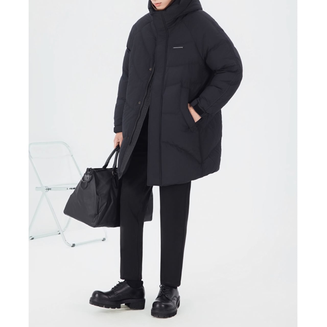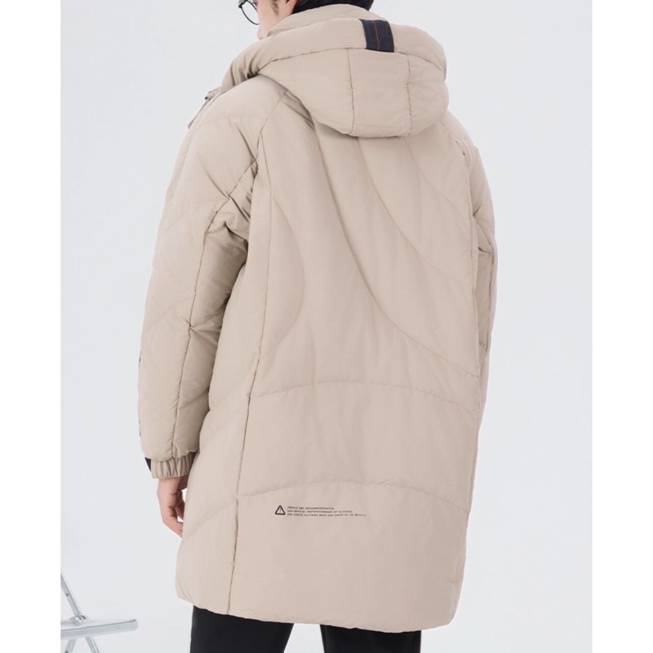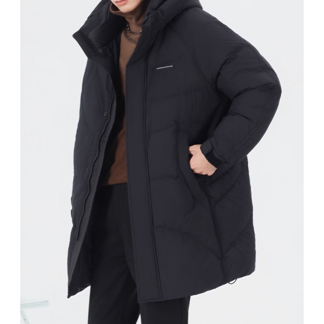 フード付きでカジュアルな印象を与えつつ、ボタンフロントのデザインが上品さを演出します。ミドル丈なので、動きやすく、様々なボトムスと合わせやすいのが魅力です。