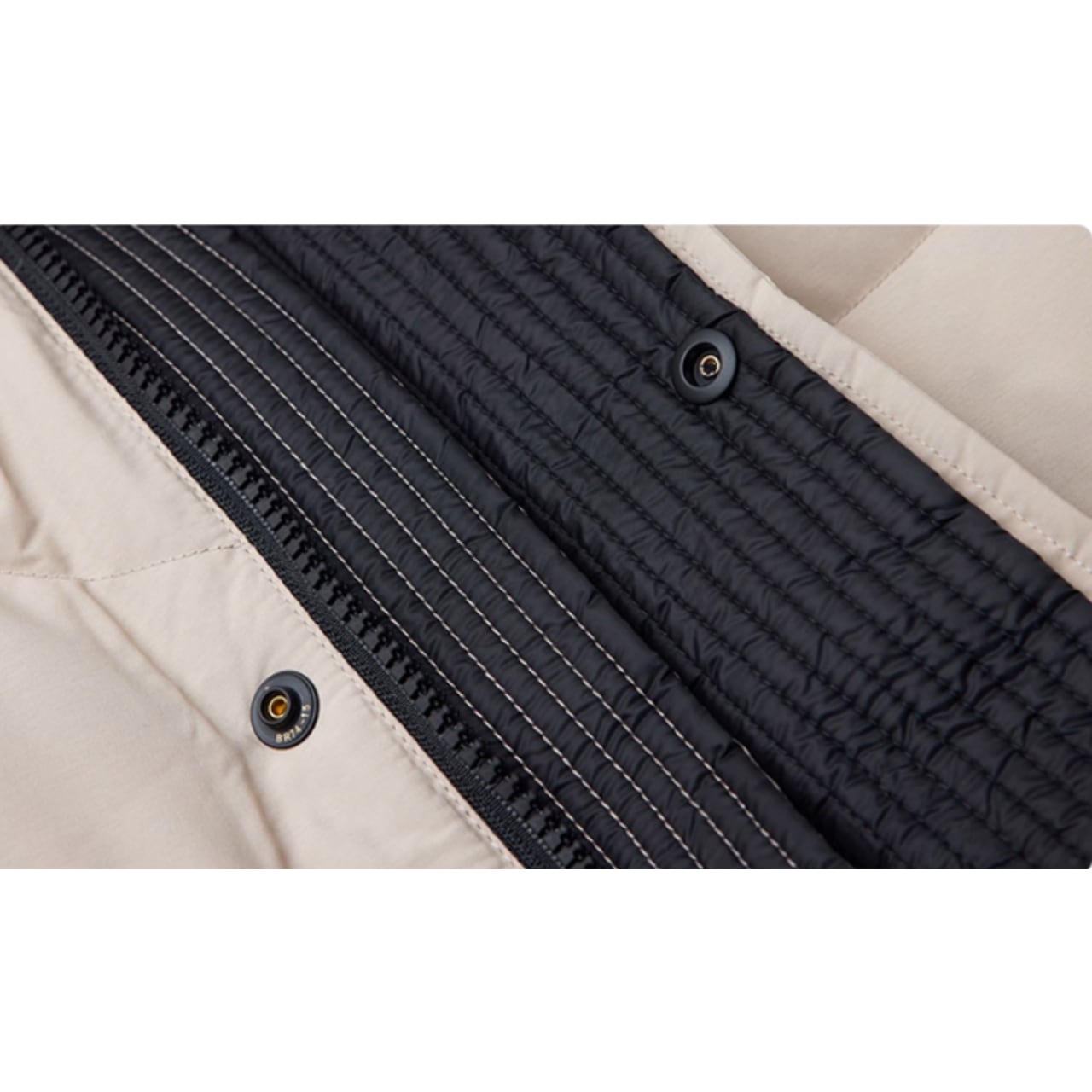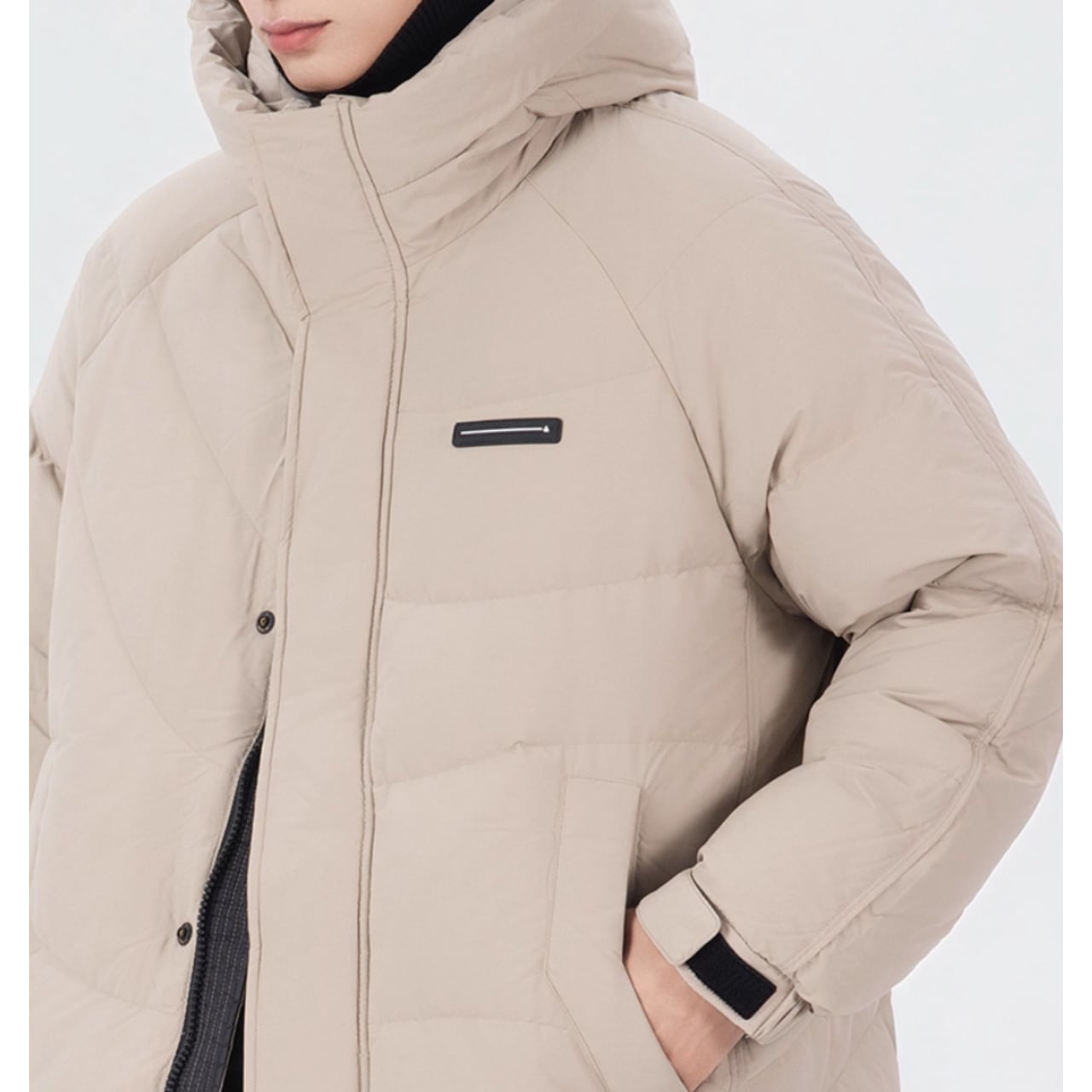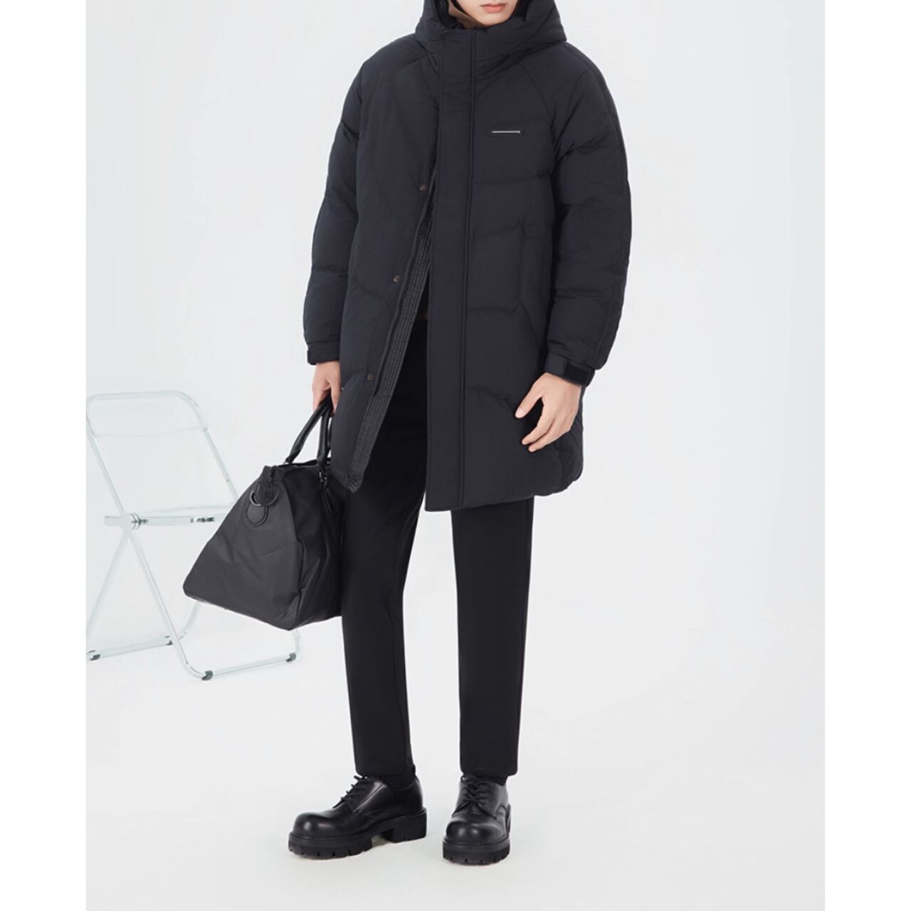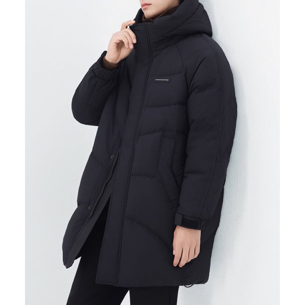 フード付きでカジュアルな印象を与えつつ、ボタンフロントのデザインが上品さを演出します。ミドル丈なので、動きやすく、様々なボトムスと合わせやすいのが魅力です。