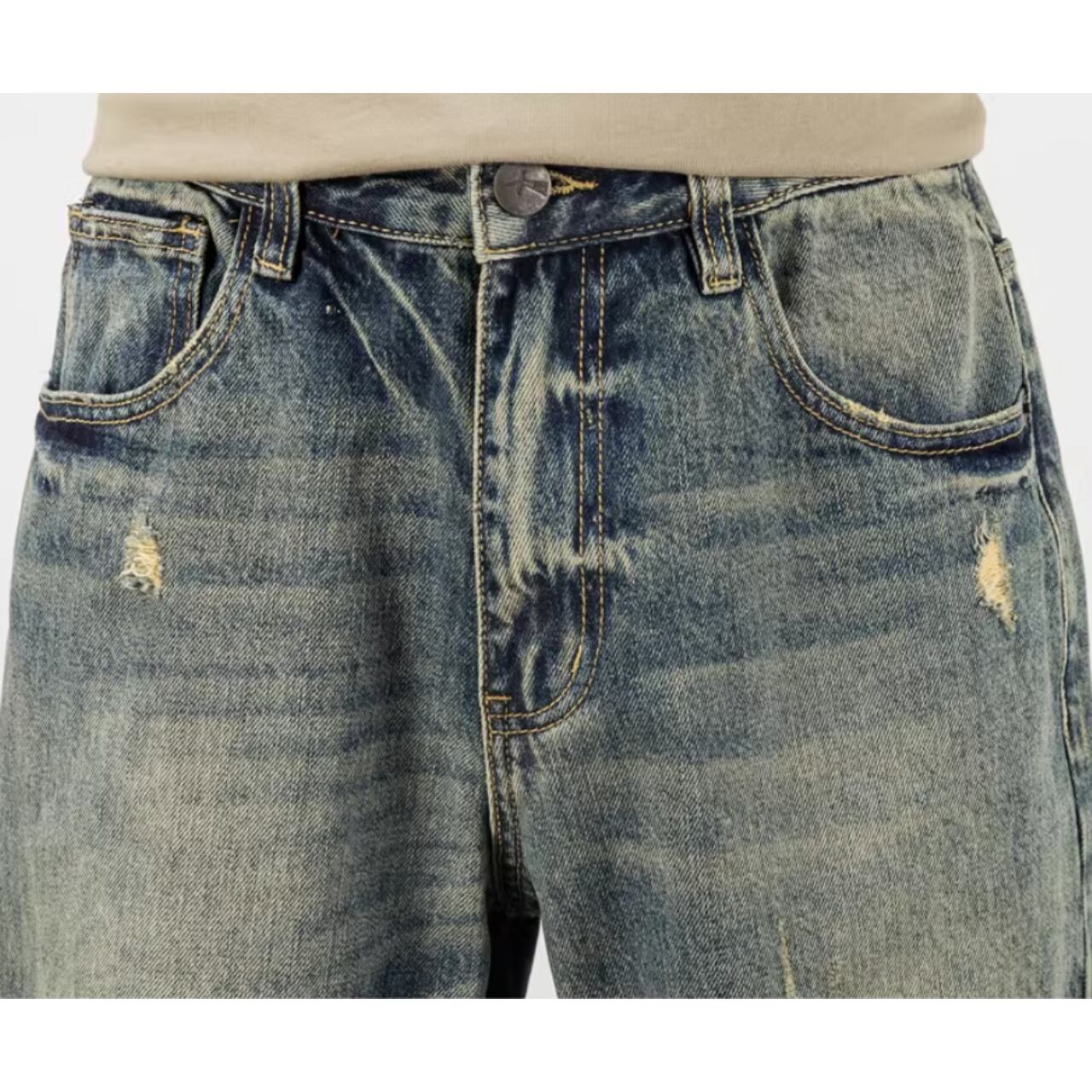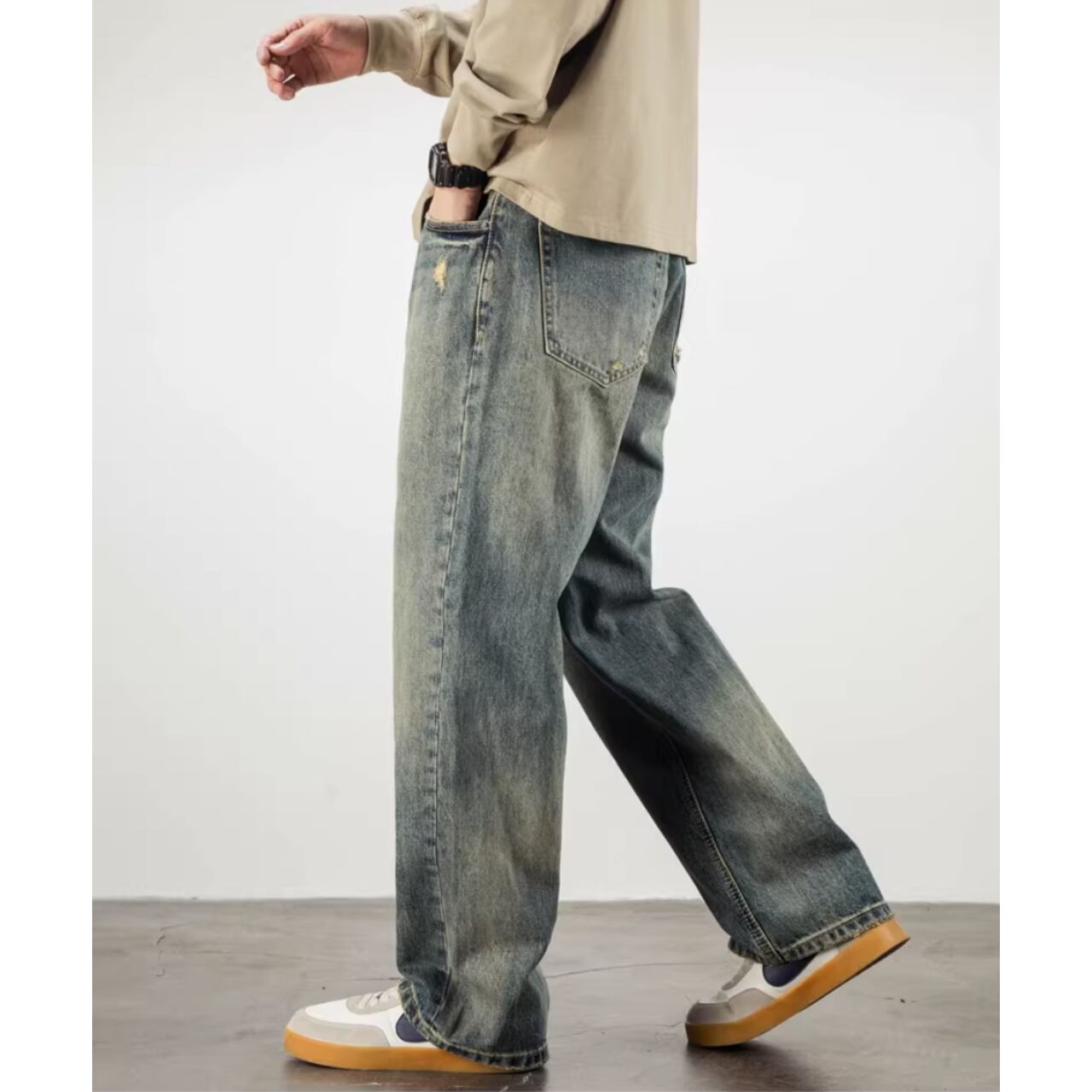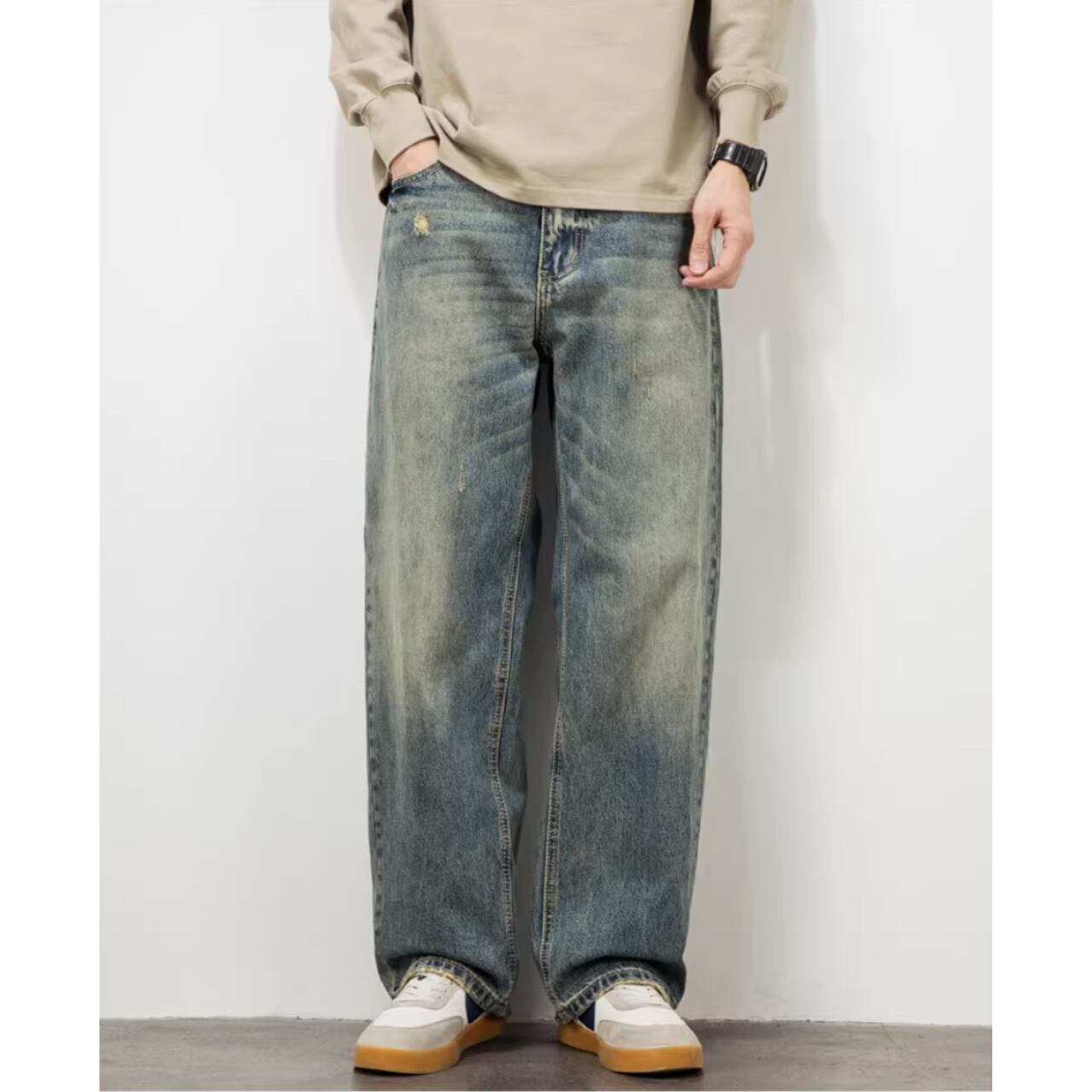 こなれ感のあるダメージ加工が魅力的なワイドストレートデニム。フルレングスで、カジュアルな着こなしに最適です。普段使いはもちろん、休日のリラックススタイルにもマッチする万能アイテムです。