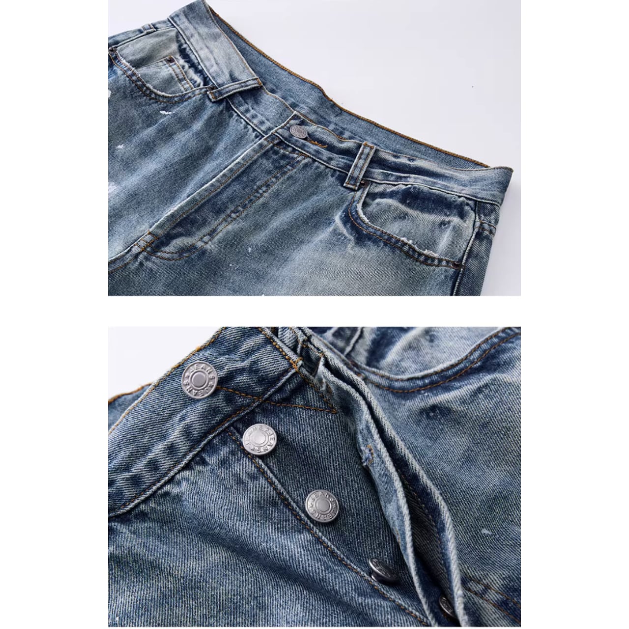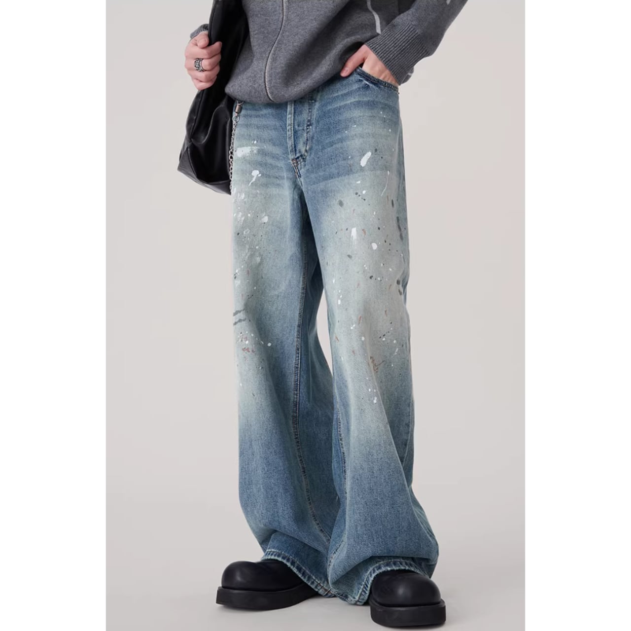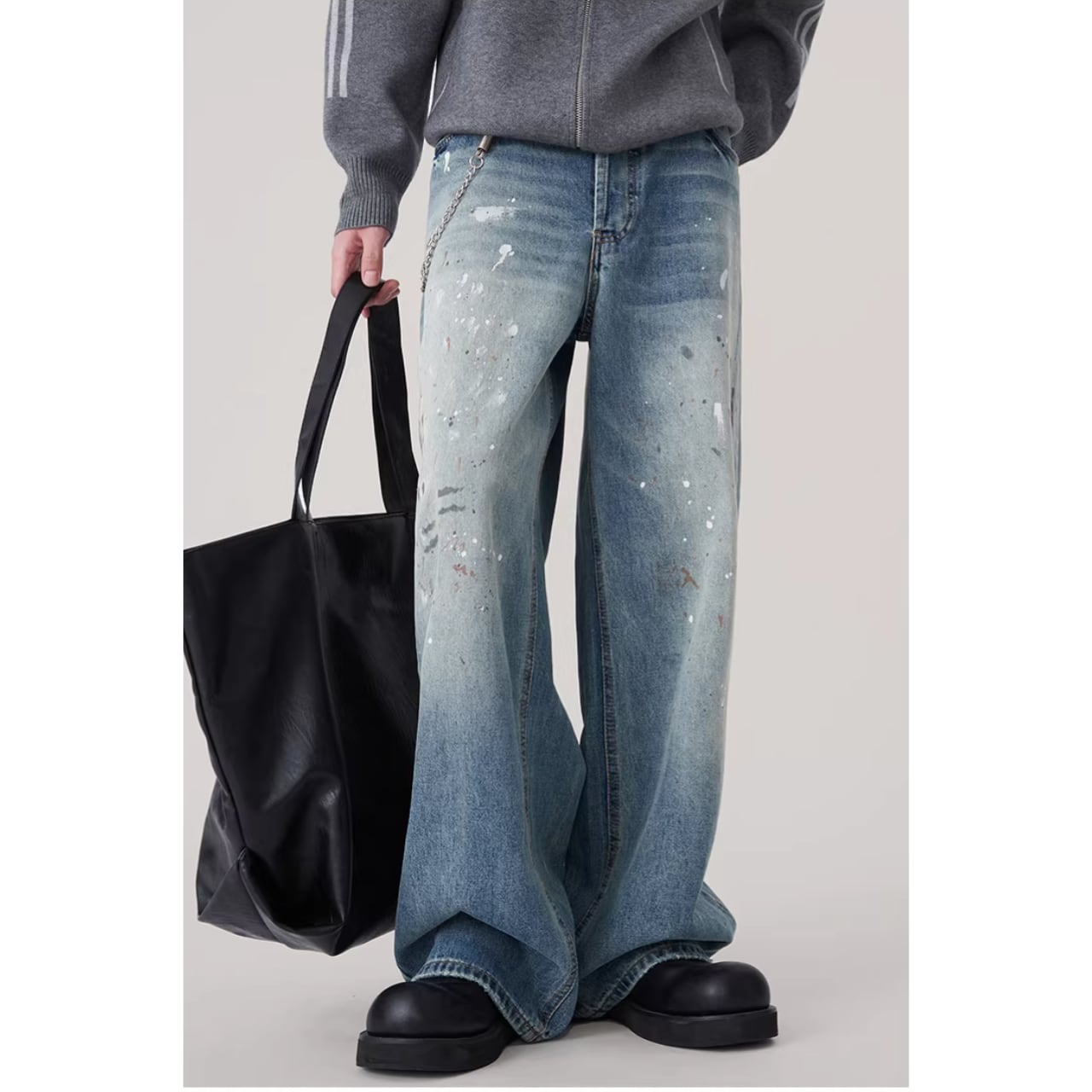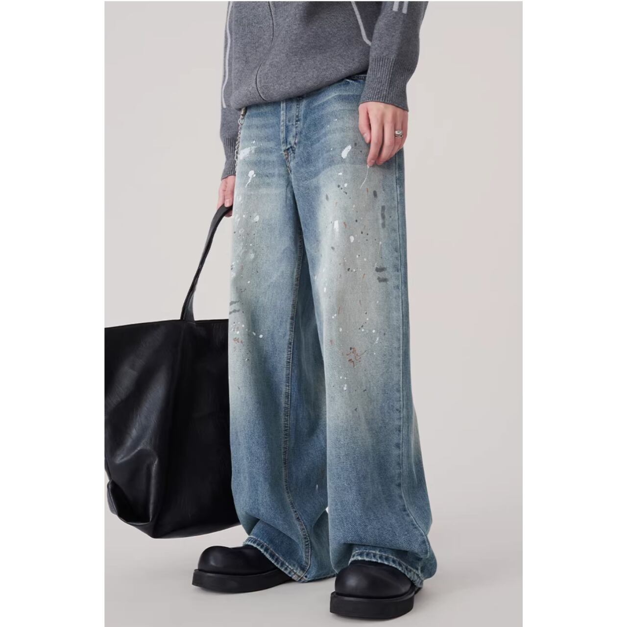 独特のダメージ加工が施されたワイドストレートデニム。フルレングスで、カジュアルな着こなしに最適です。