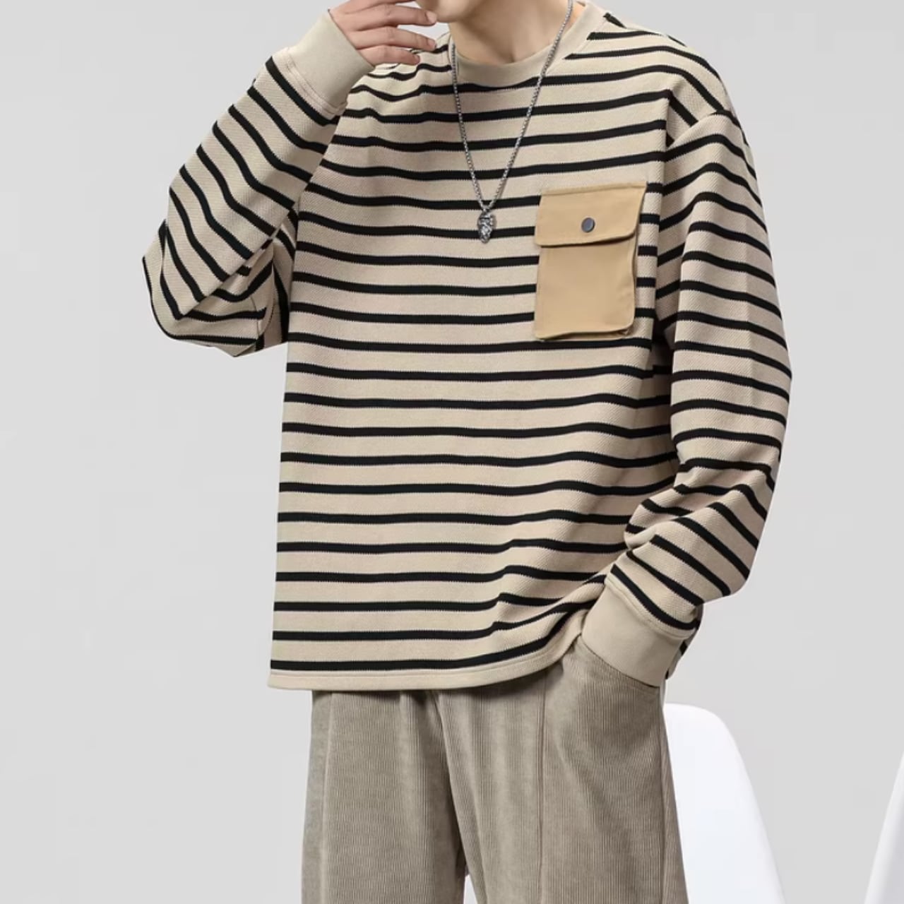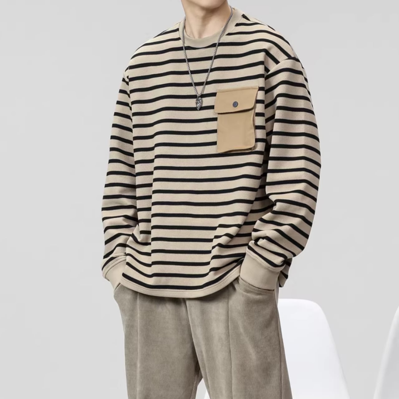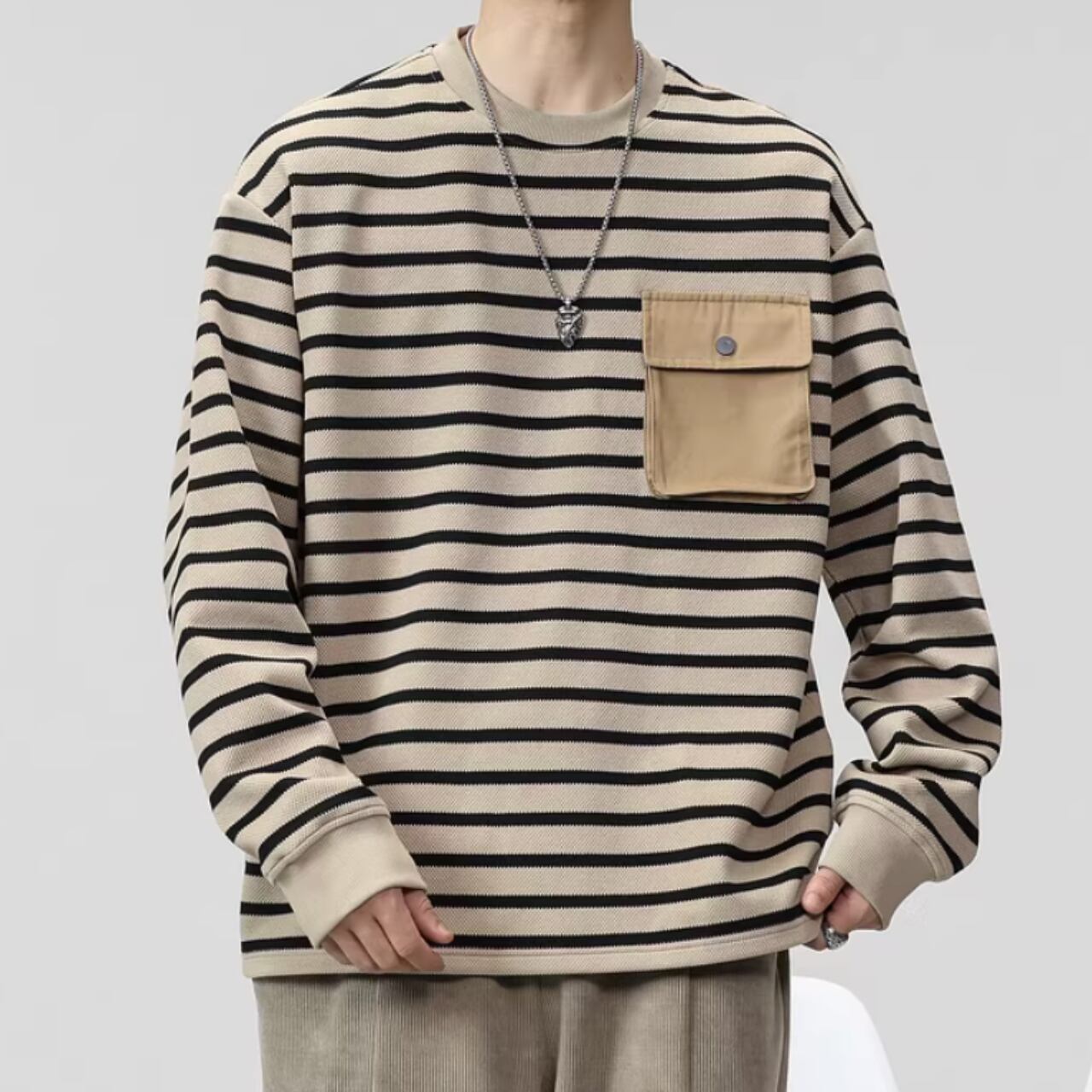 ボーダー柄が目を引く、長袖カットソー。アクセントになるパッチポケットが、さりげないおしゃれを演出します。