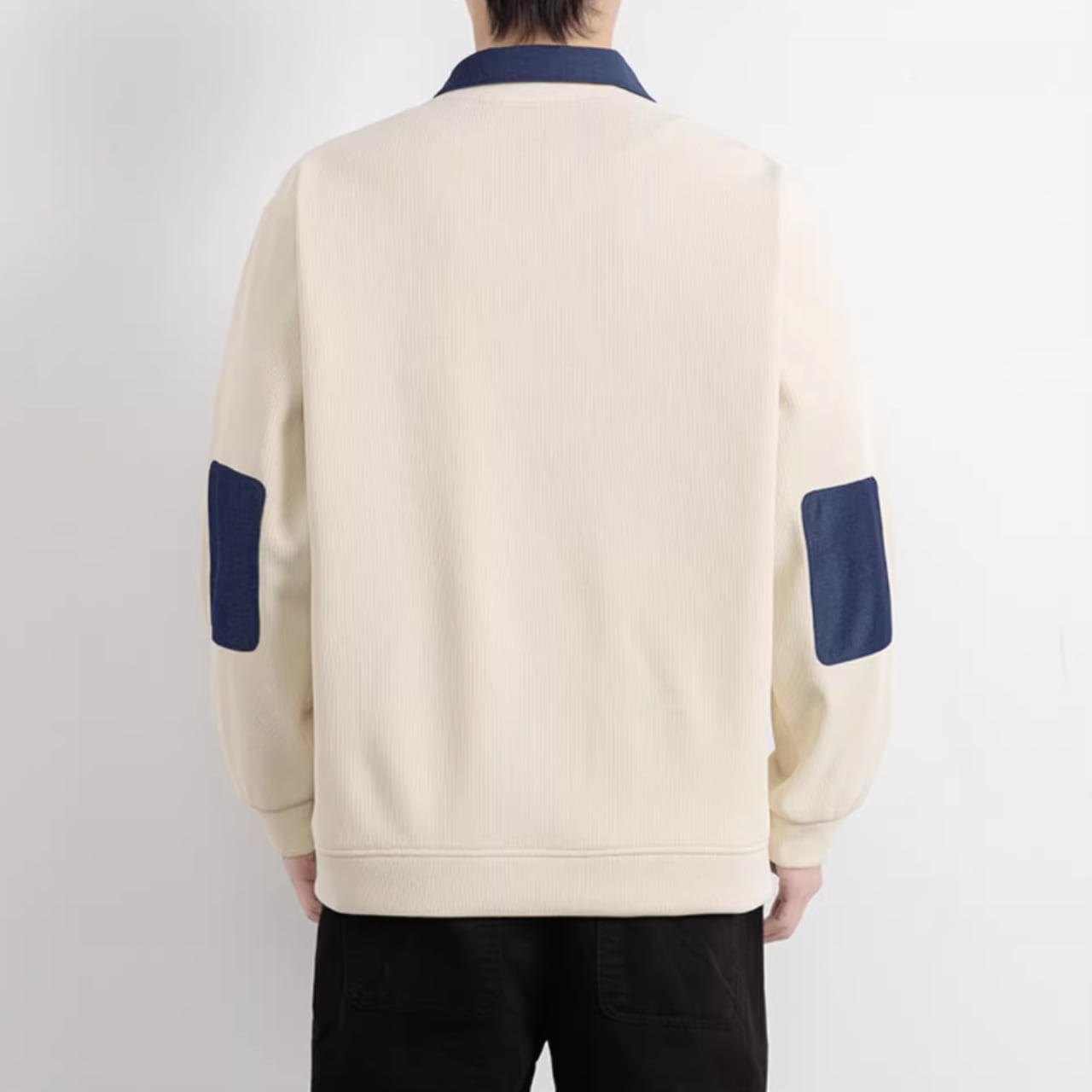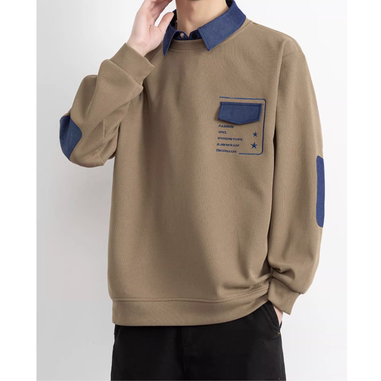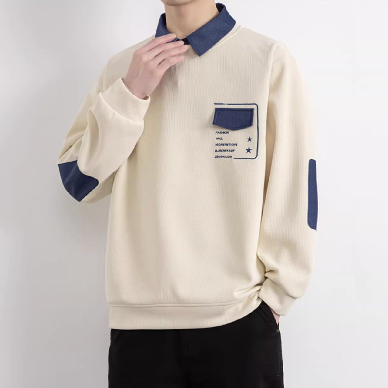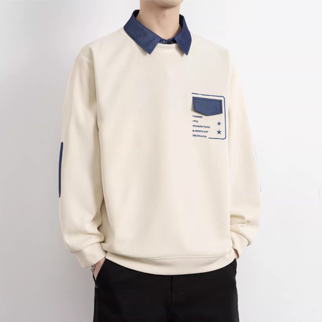 パッチポケットが特徴的な、おしゃれな長袖スウェットシャツ。シンプルなデザインの中に、さりげない個性が光ります。