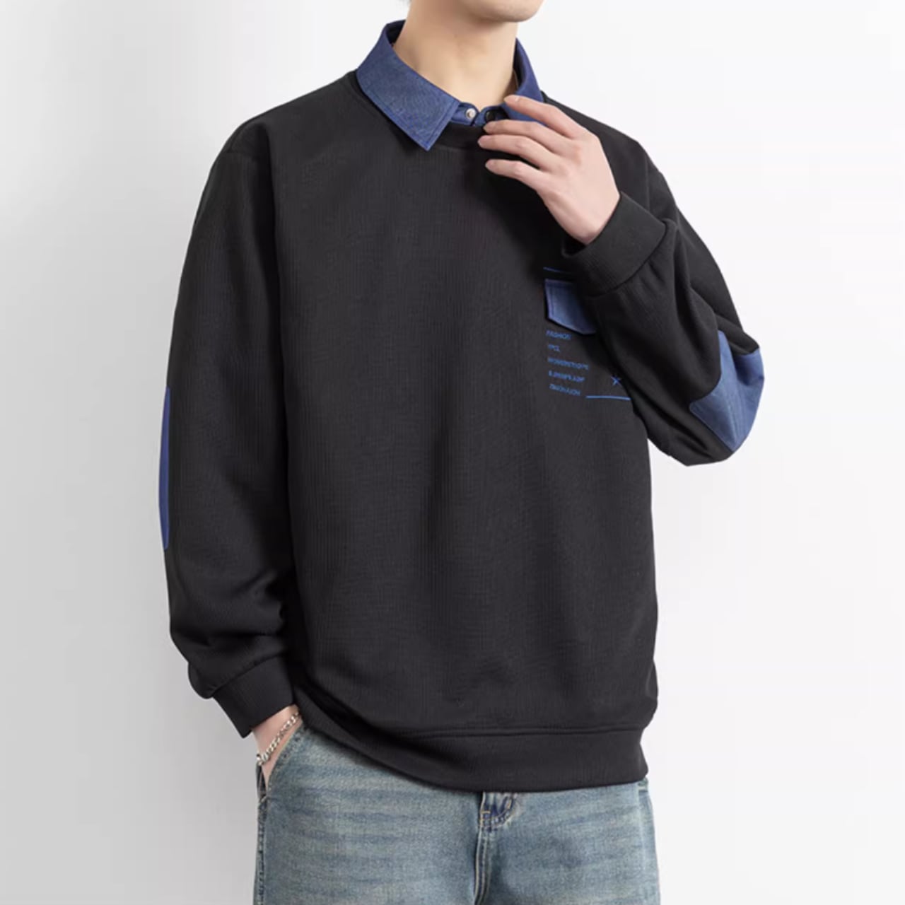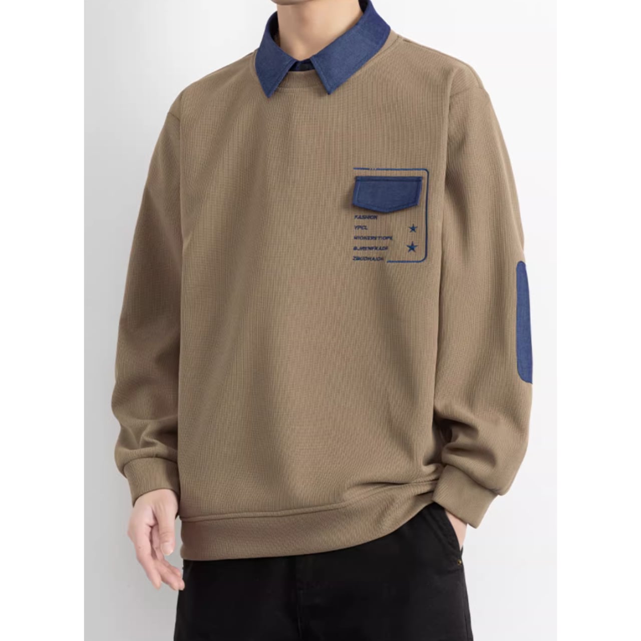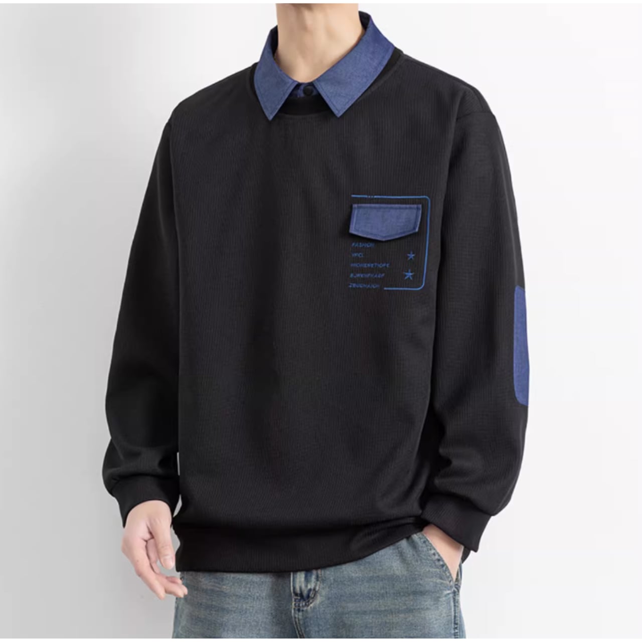 パッチポケットが特徴的な、おしゃれな長袖スウェットシャツ。シンプルなデザインの中に、さりげない個性が光ります。