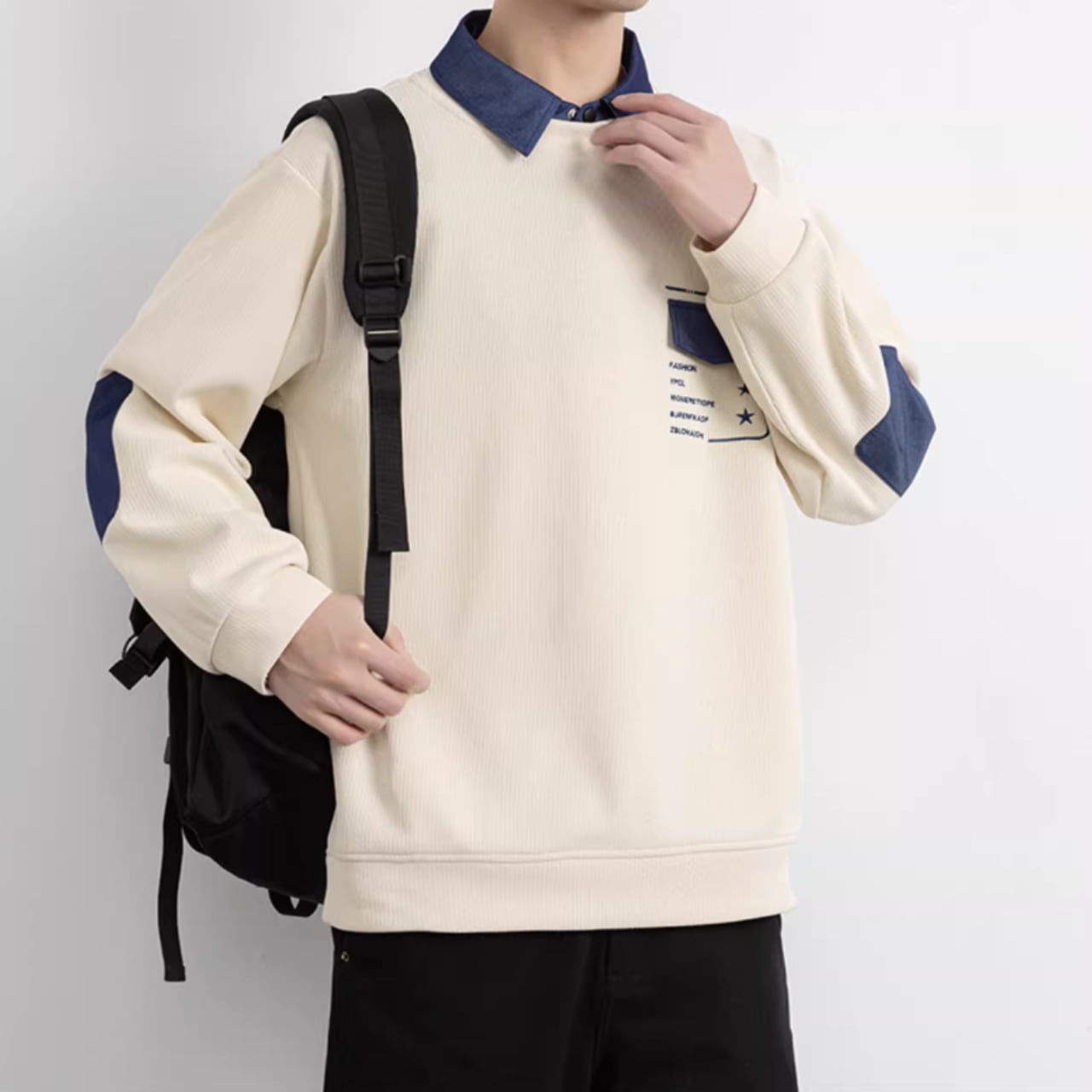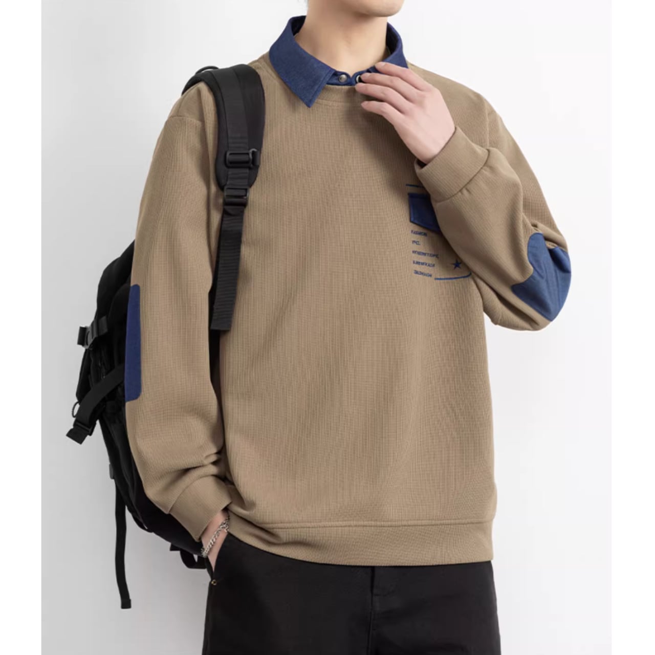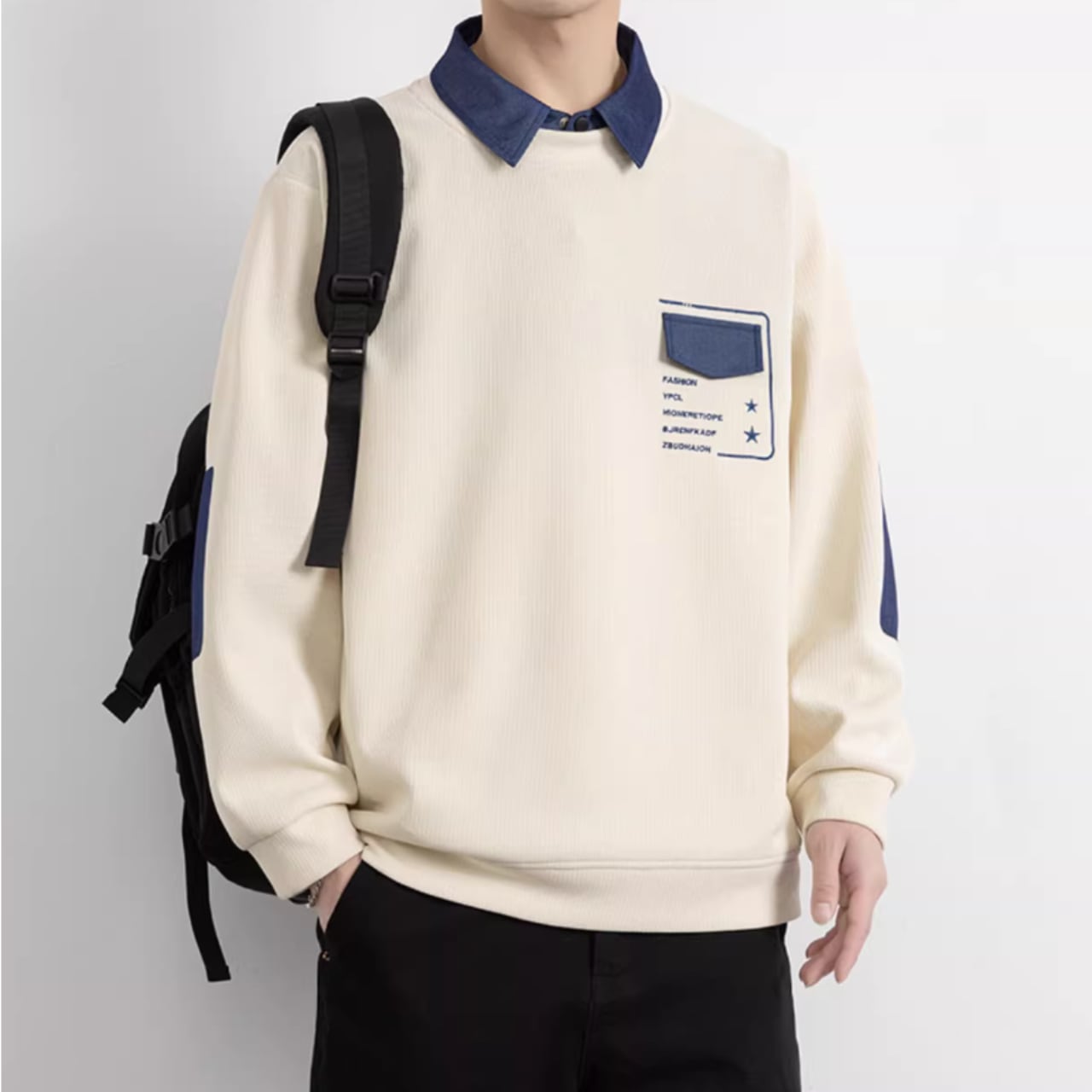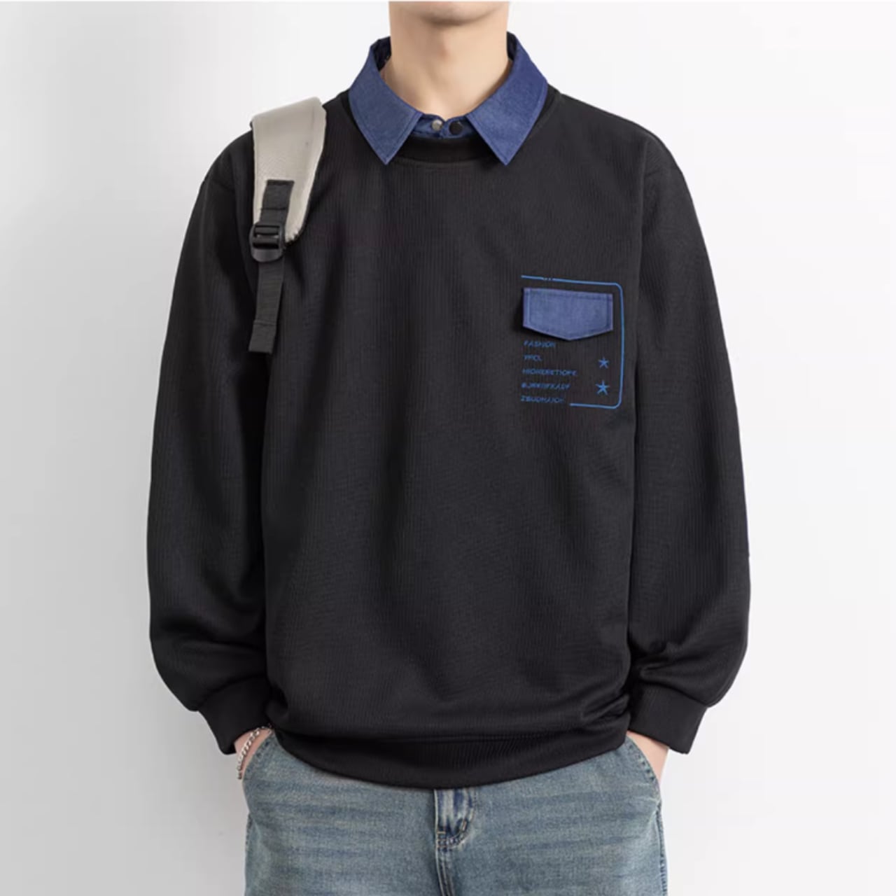 パッチポケットが特徴的な、おしゃれな長袖スウェットシャツ。シンプルなデザインの中に、さりげない個性が光ります。