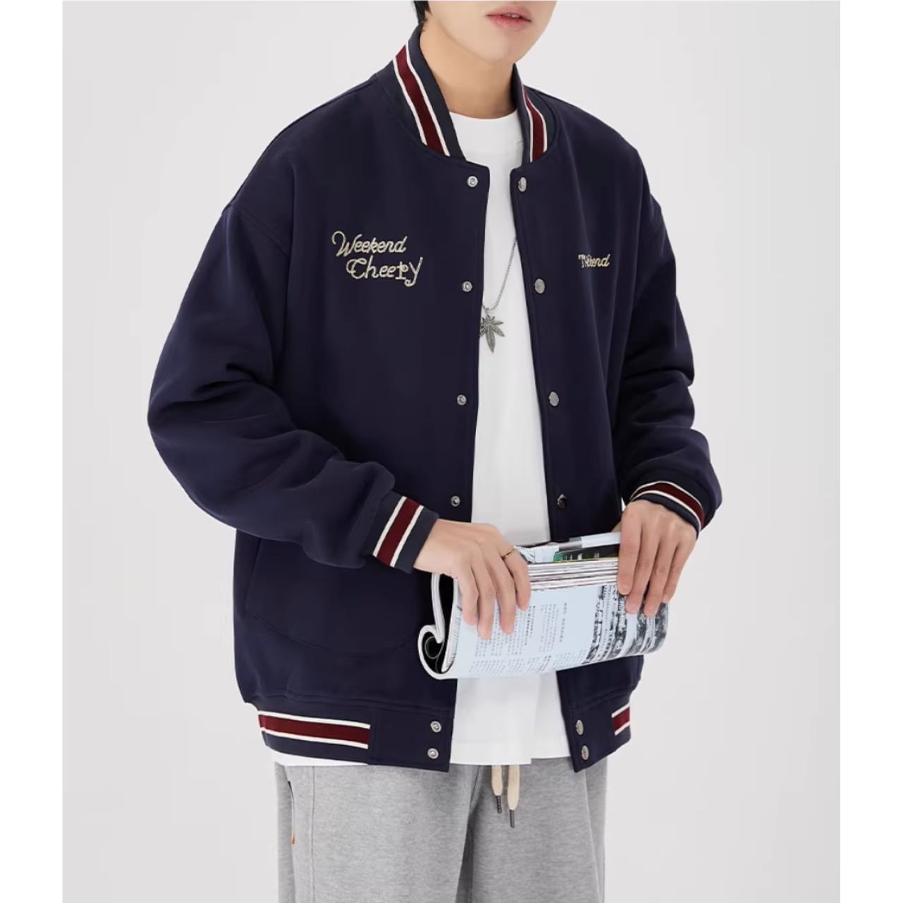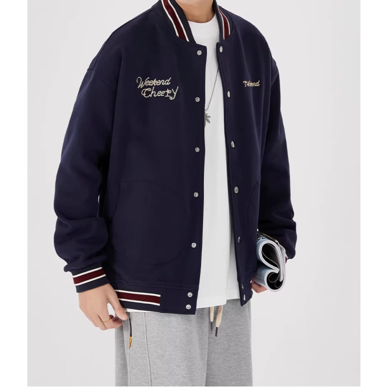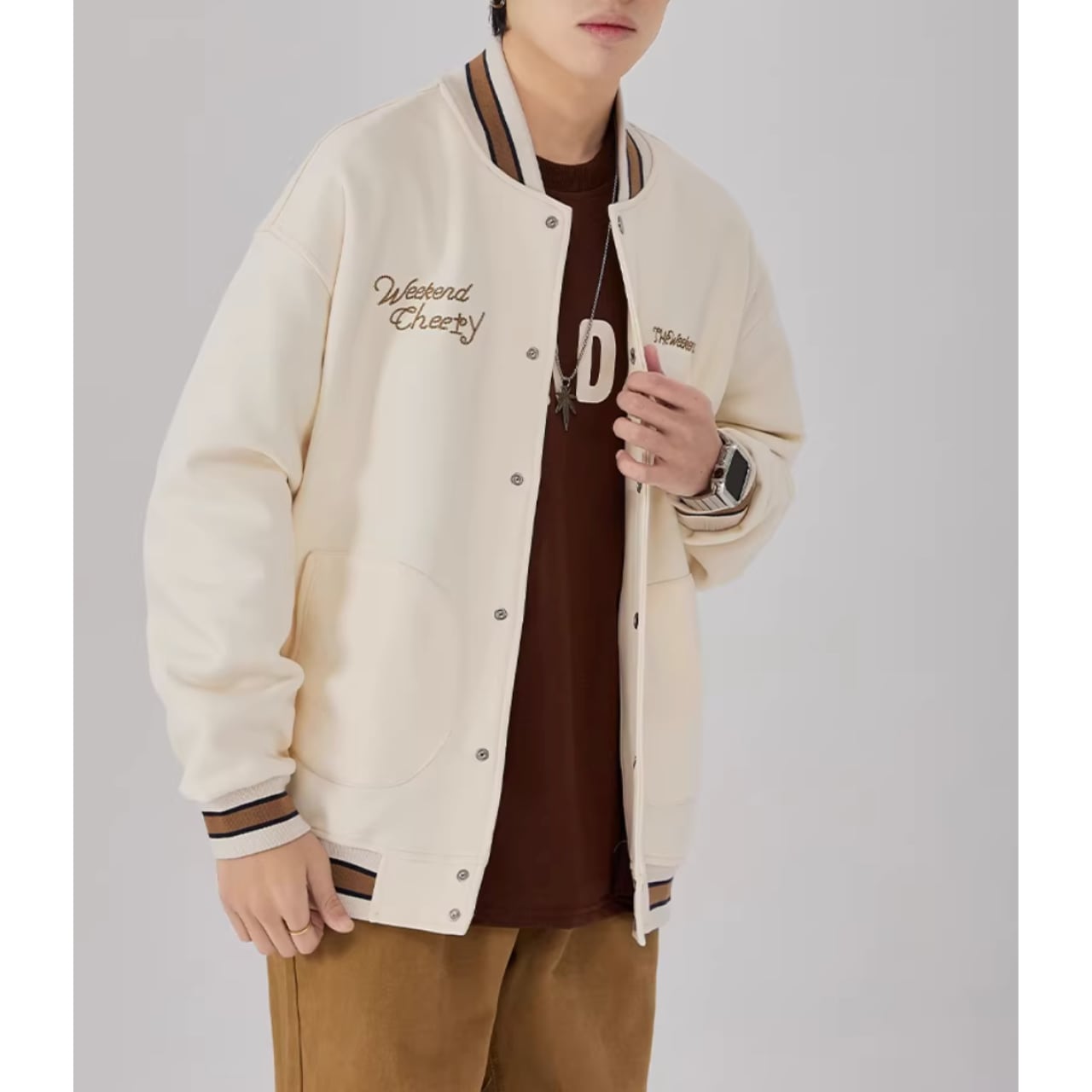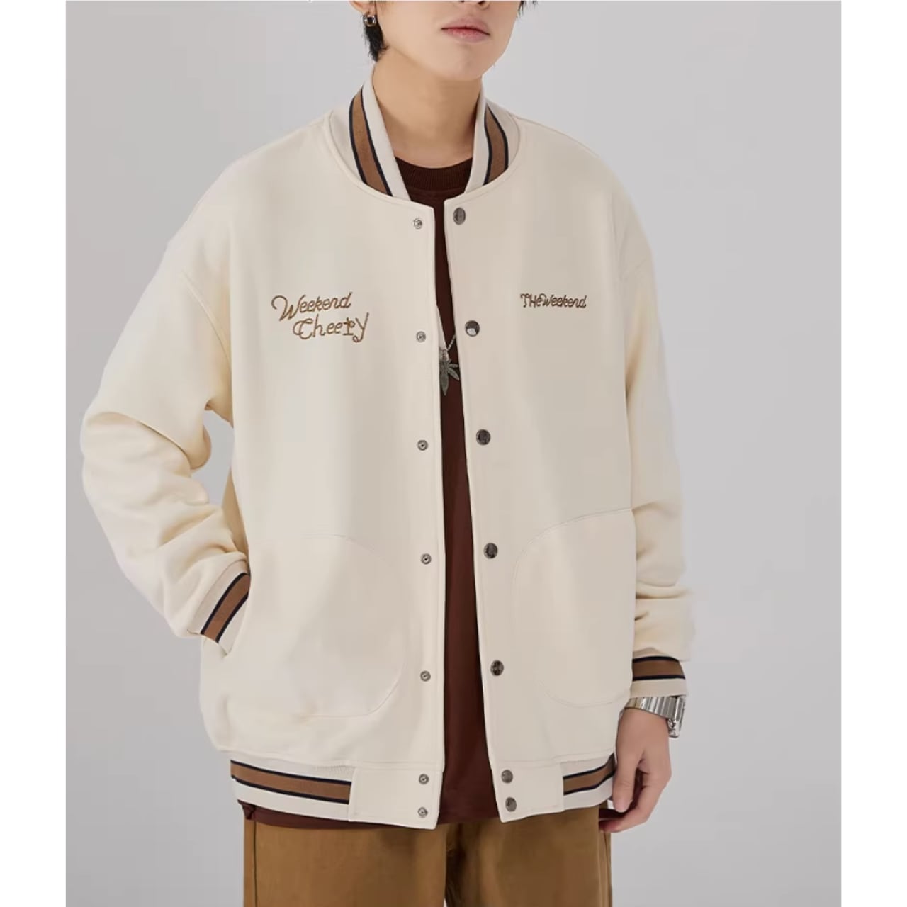リブ襟とヒップ丈が特徴のスタジアムジャケット。ボタンフロントのデザインが、カジュアルながらも洗練された印象を与えます。