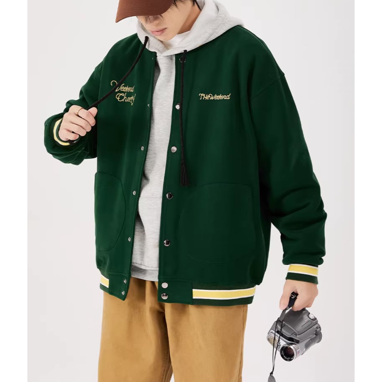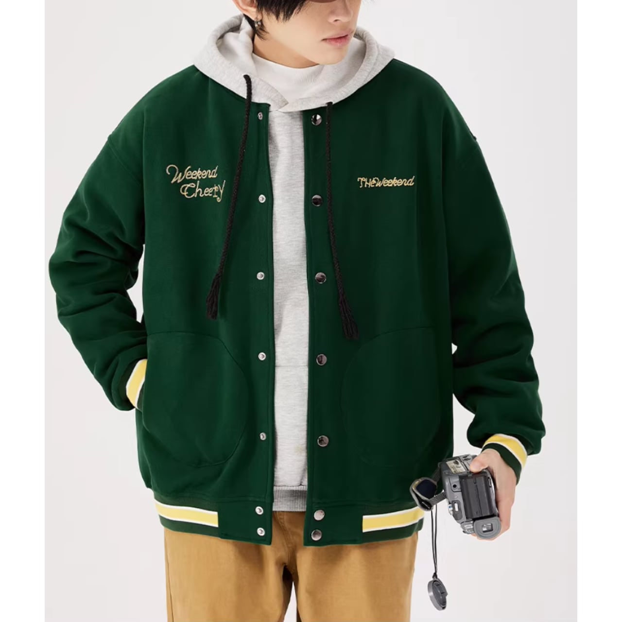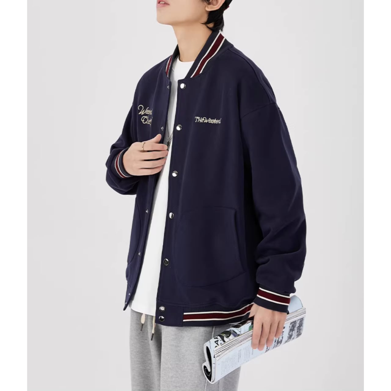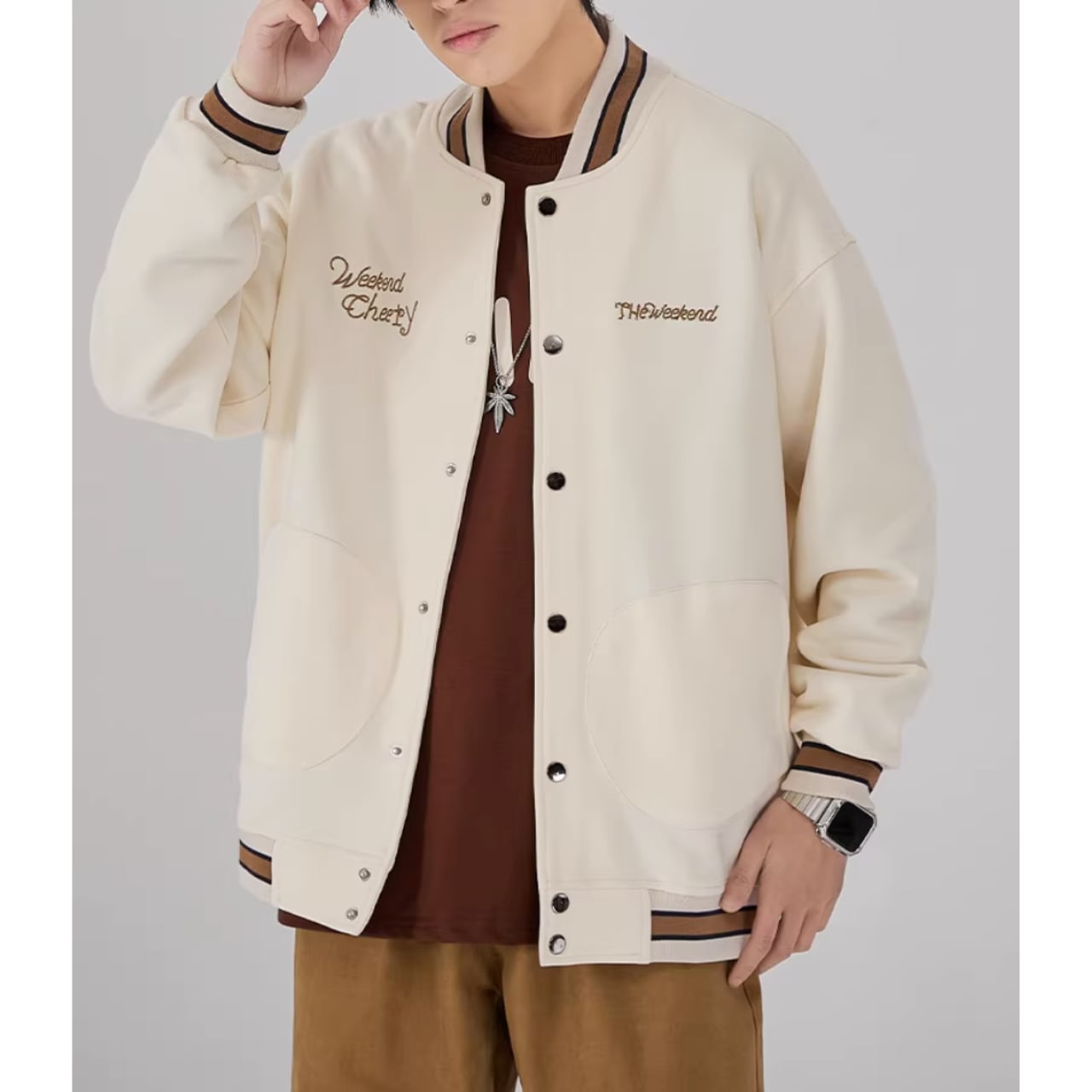 リブ襟とヒップ丈が特徴のスタジアムジャケット。ボタンフロントのデザインが、カジュアルながらも洗練された印象を与えます。