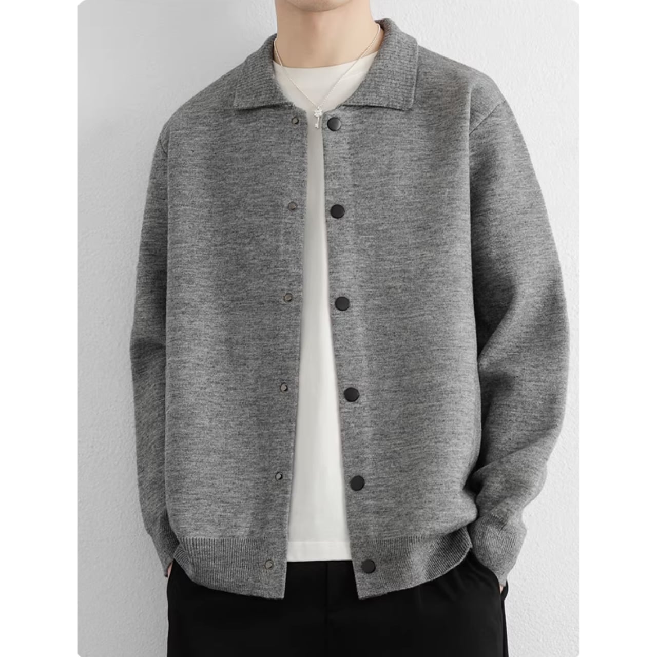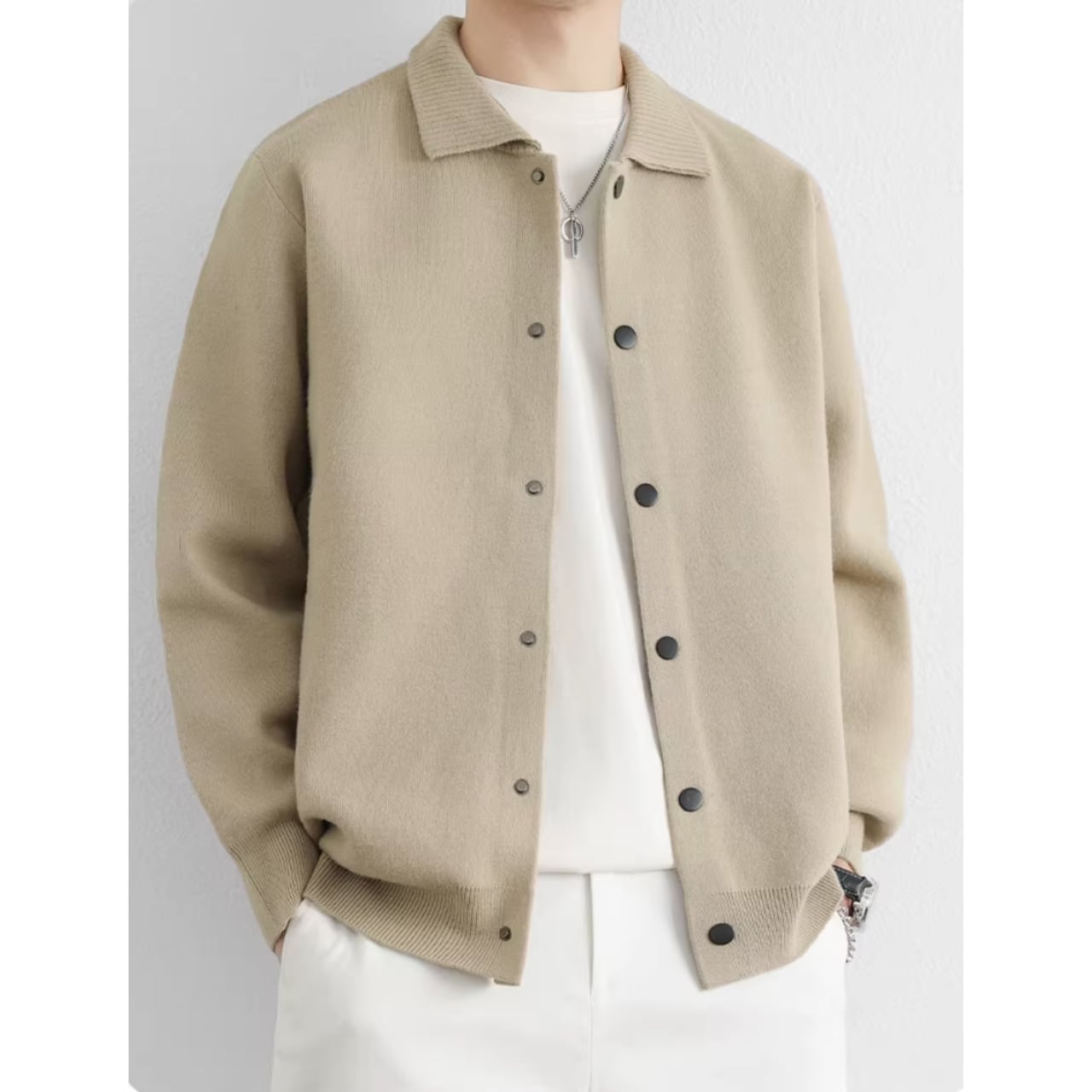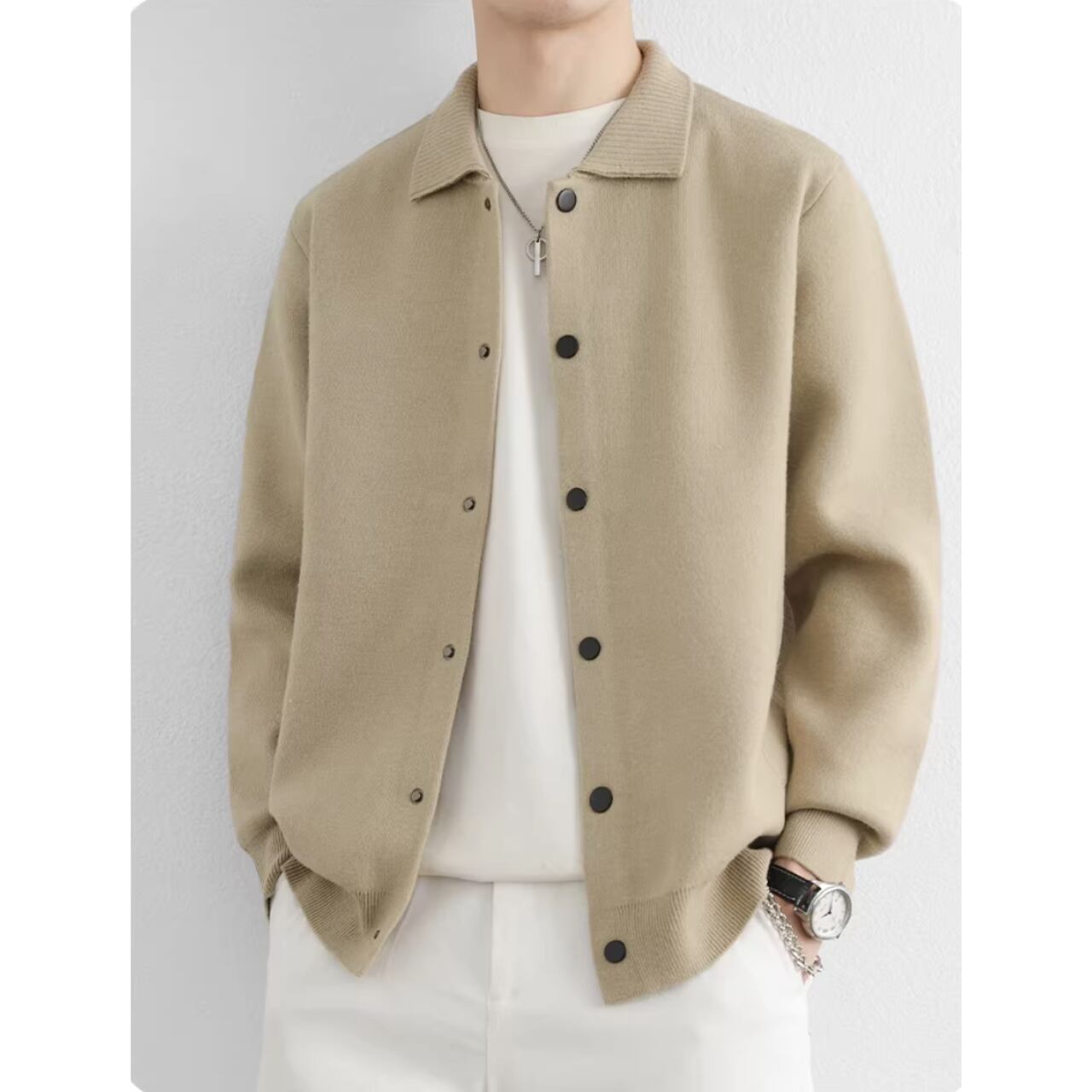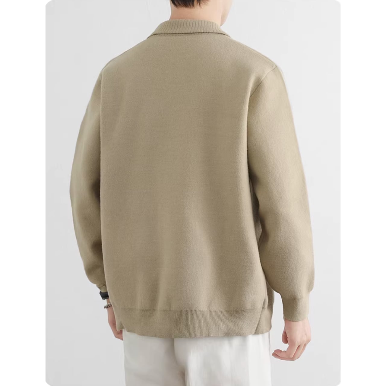 オフィスでのきちんとスタイルから、休日のリラックスしたカジュアルスタイルまで、幅広く活躍します。ボタンを留めてプルオーバーのように着こなすのもおすすめです。