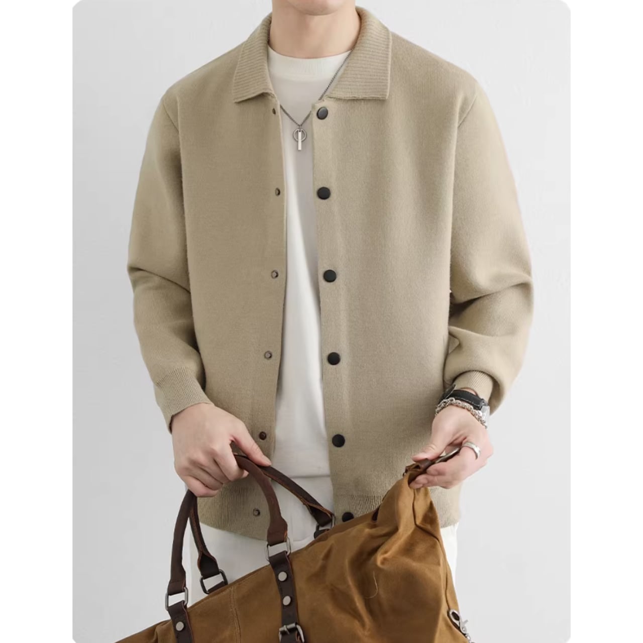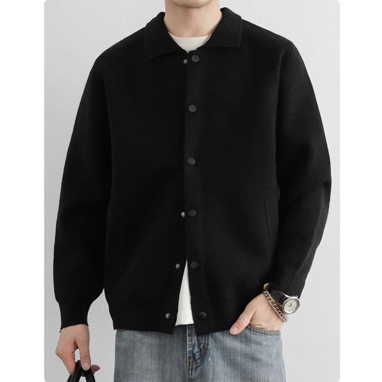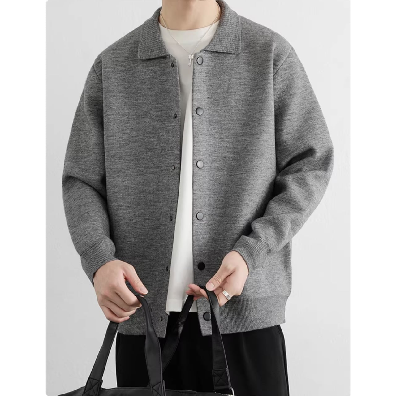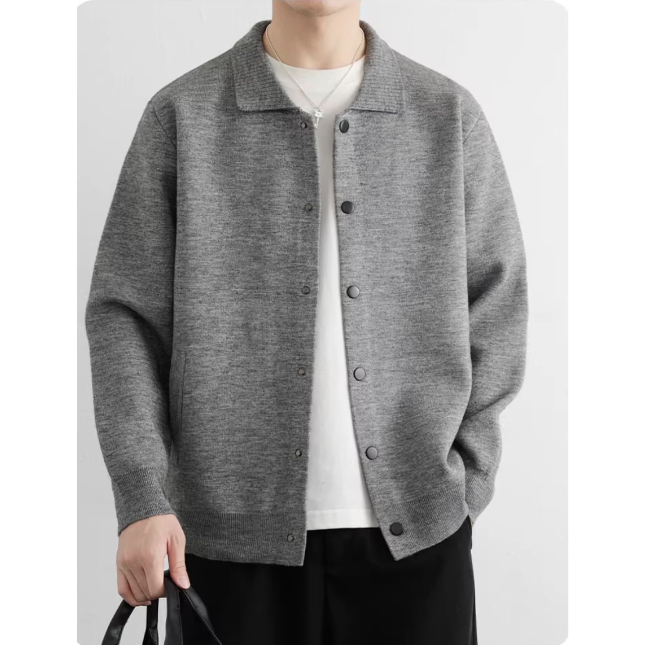 オフィスでのきちんとスタイルから、休日のリラックスしたカジュアルスタイルまで、幅広く活躍します。ボタンを留めてプルオーバーのように着こなすのもおすすめです。