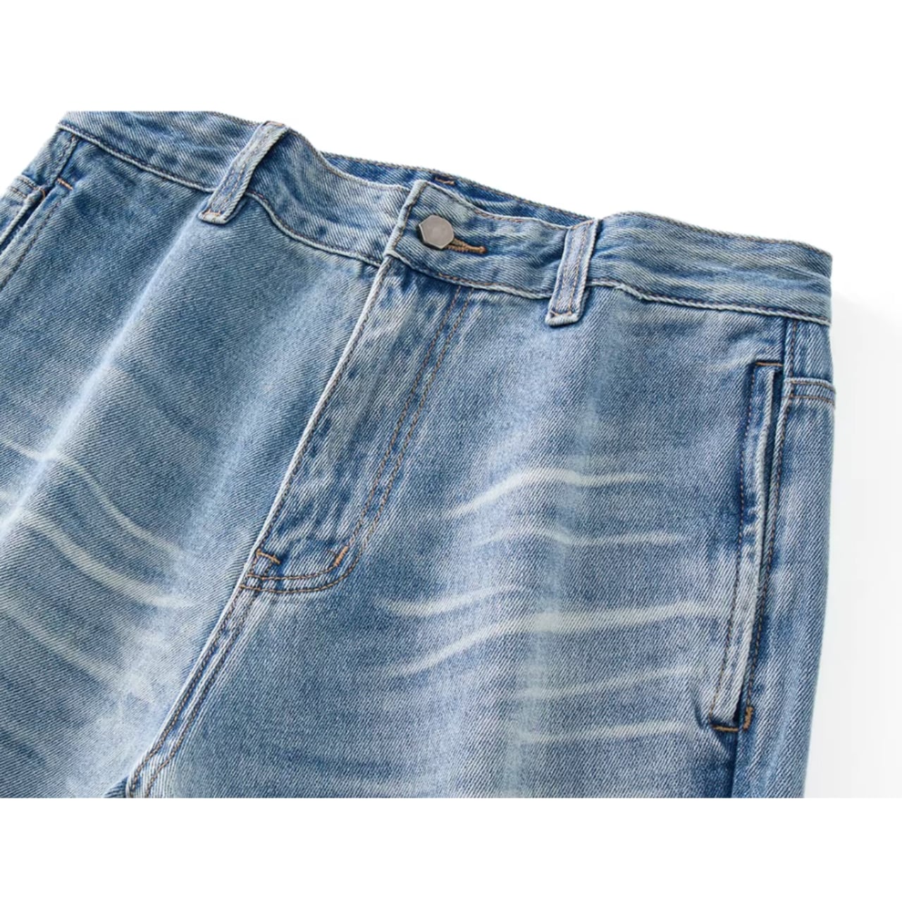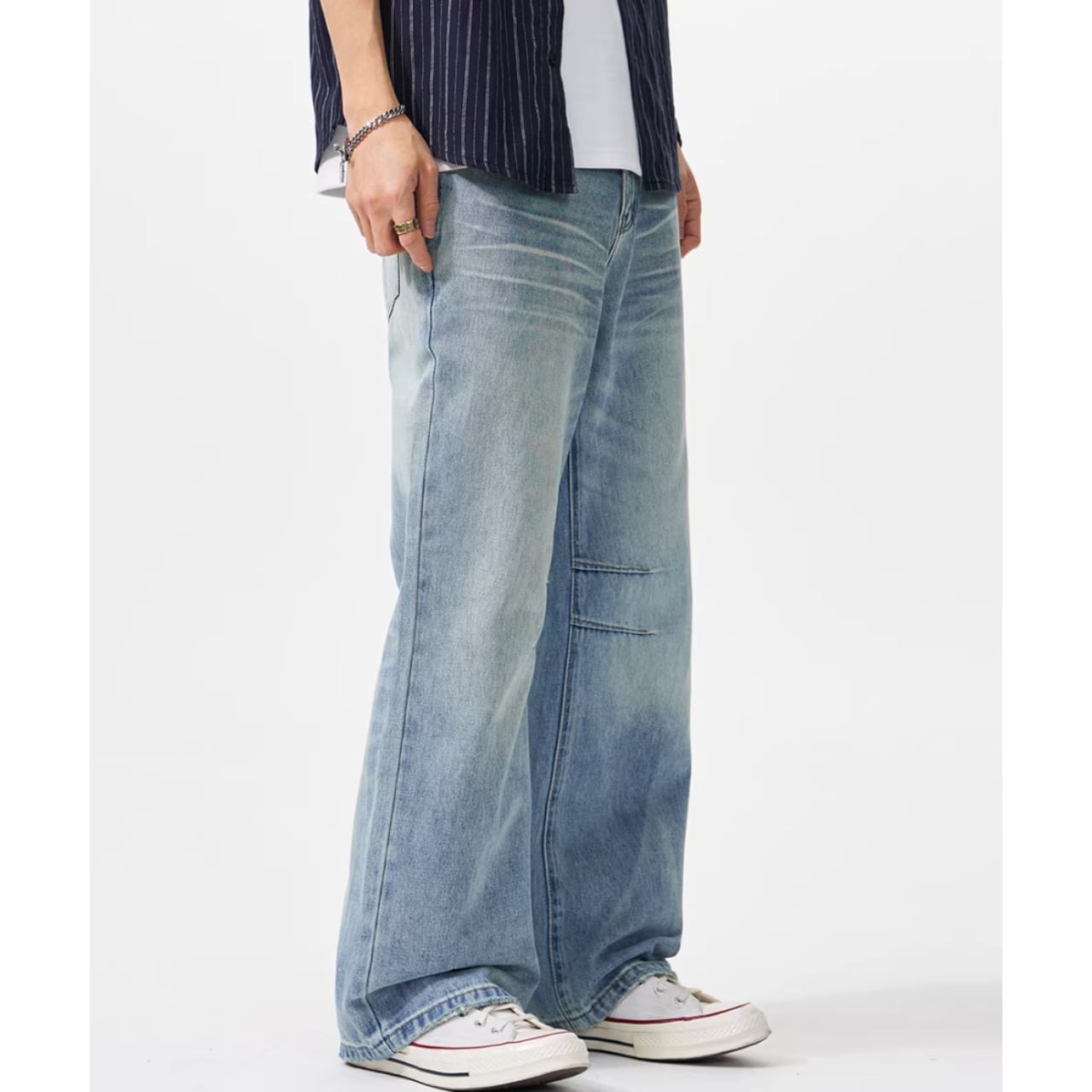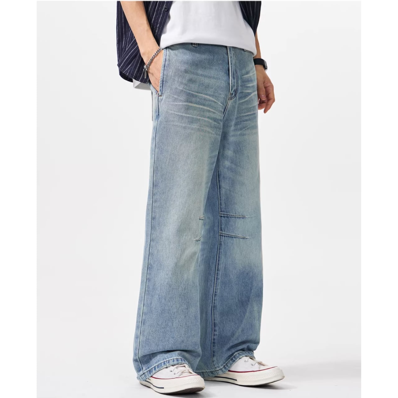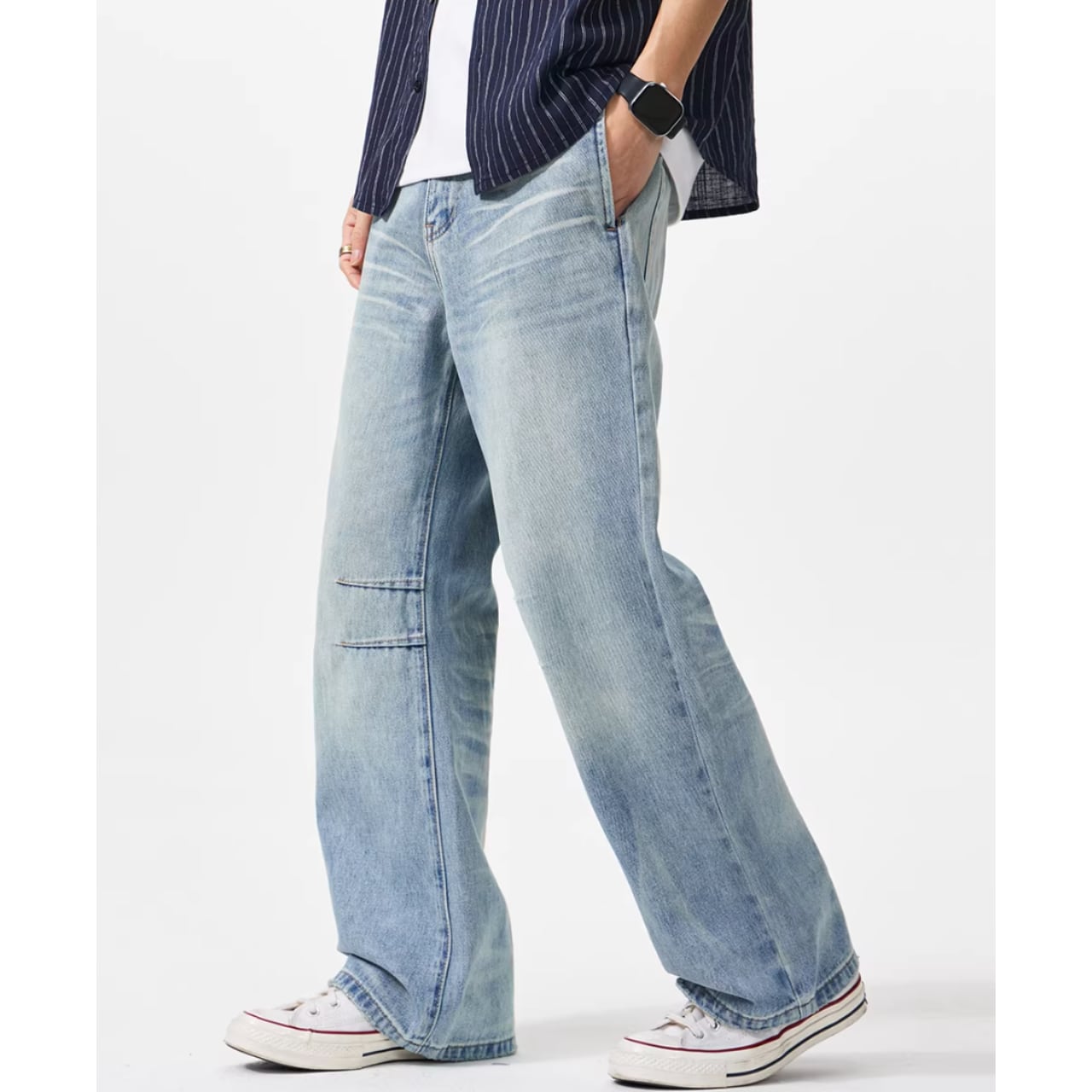 特徴的なパッチワークが目を引くワイドレッグデニム。ゆったりとしたシルエットで、リラックスした着心地が魅力です。