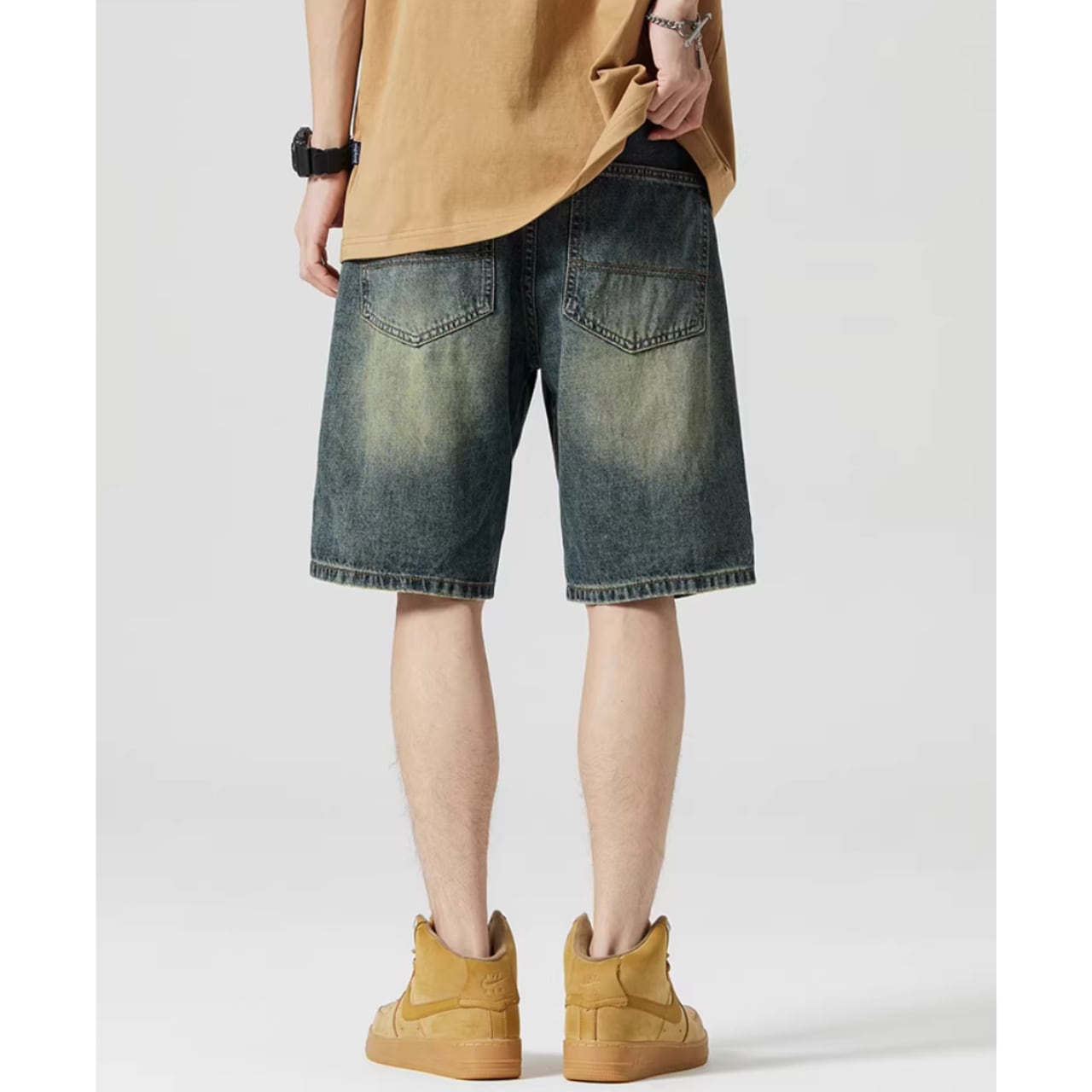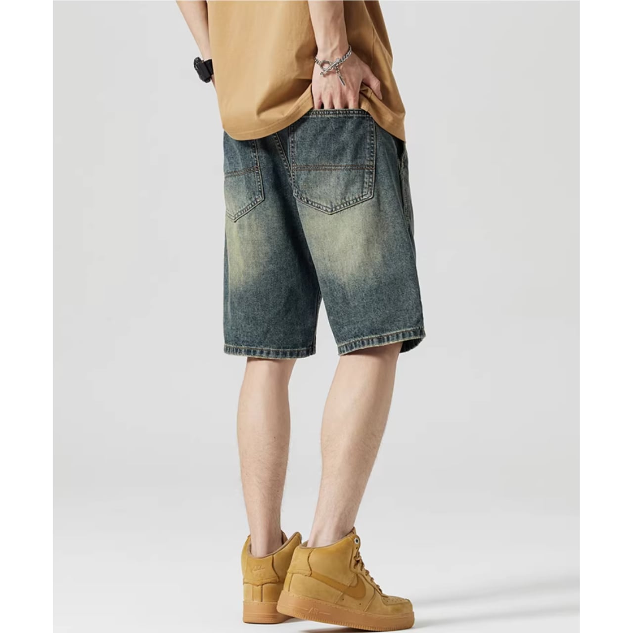 カジュアルなスタイリングに最適なハーフ丈デニムショートパンツ。程よいダメージ加工が、こなれ感を演出します。