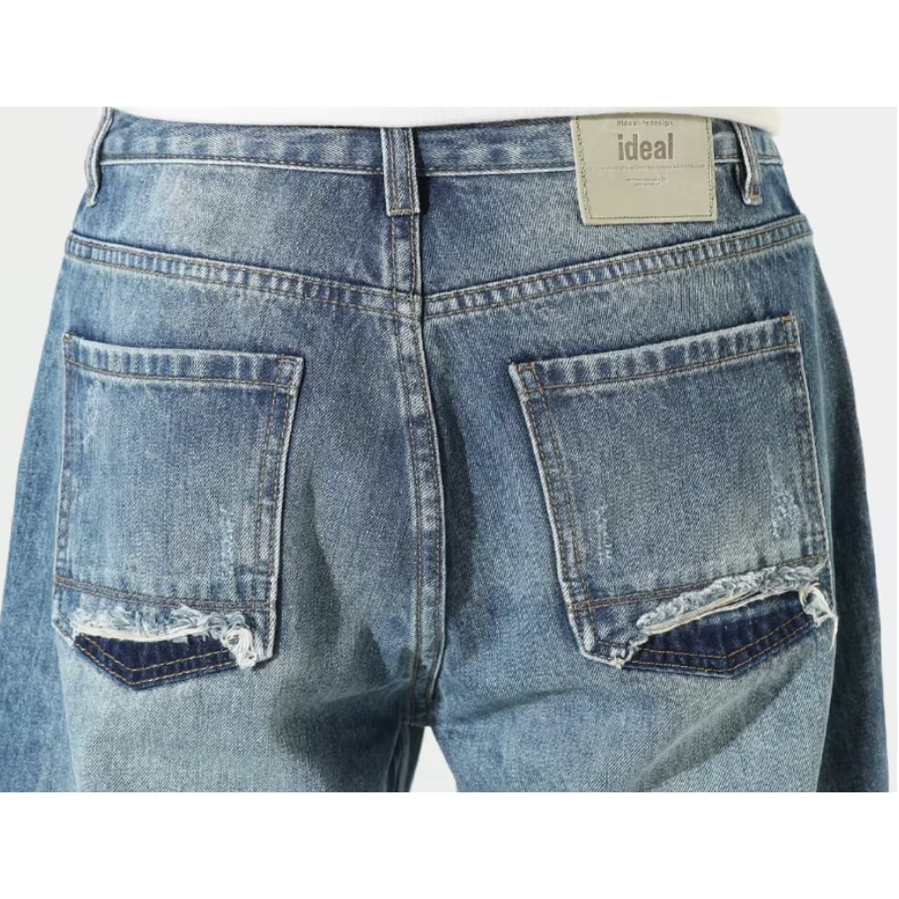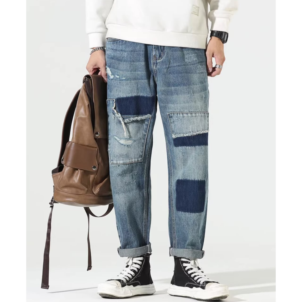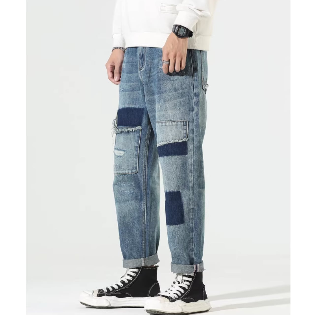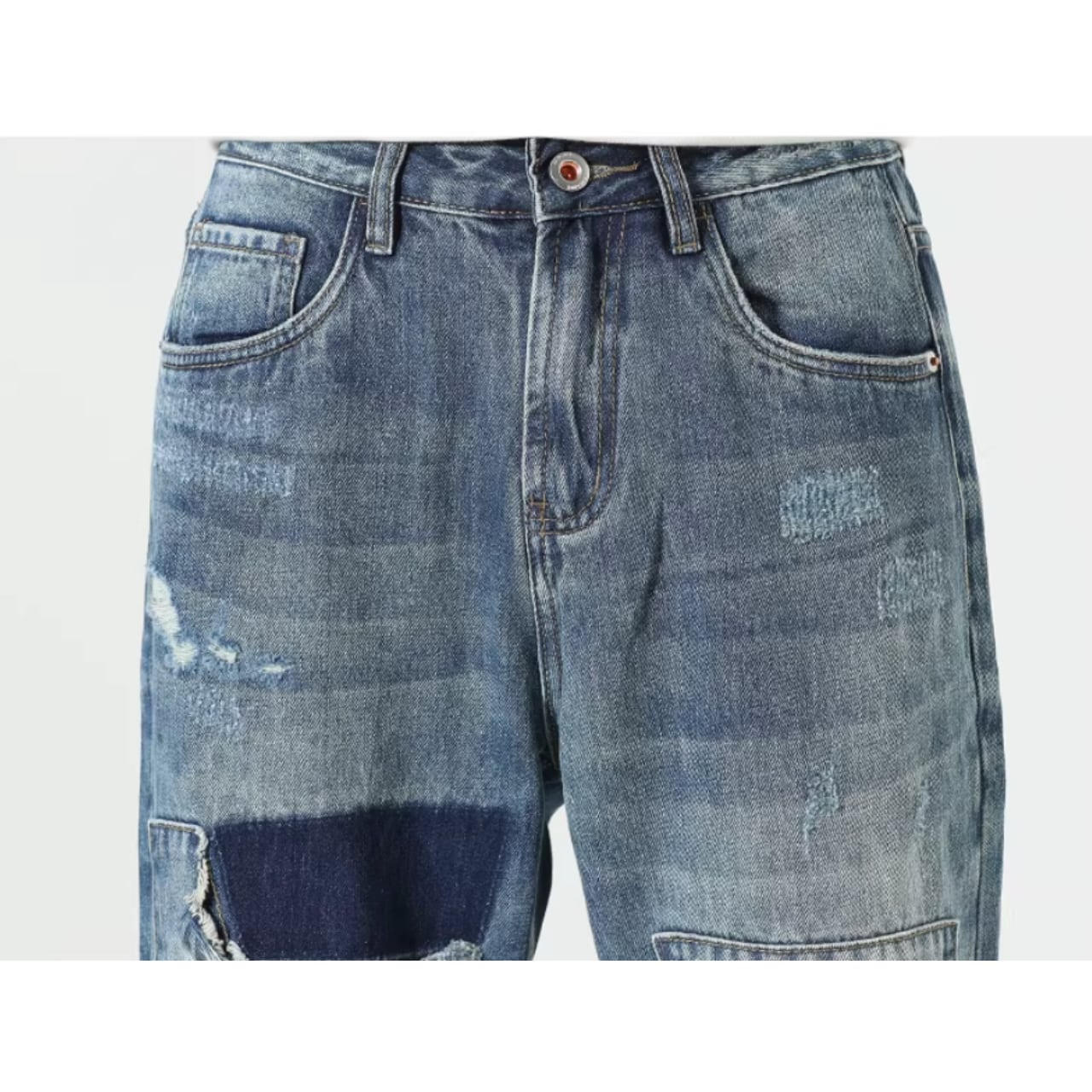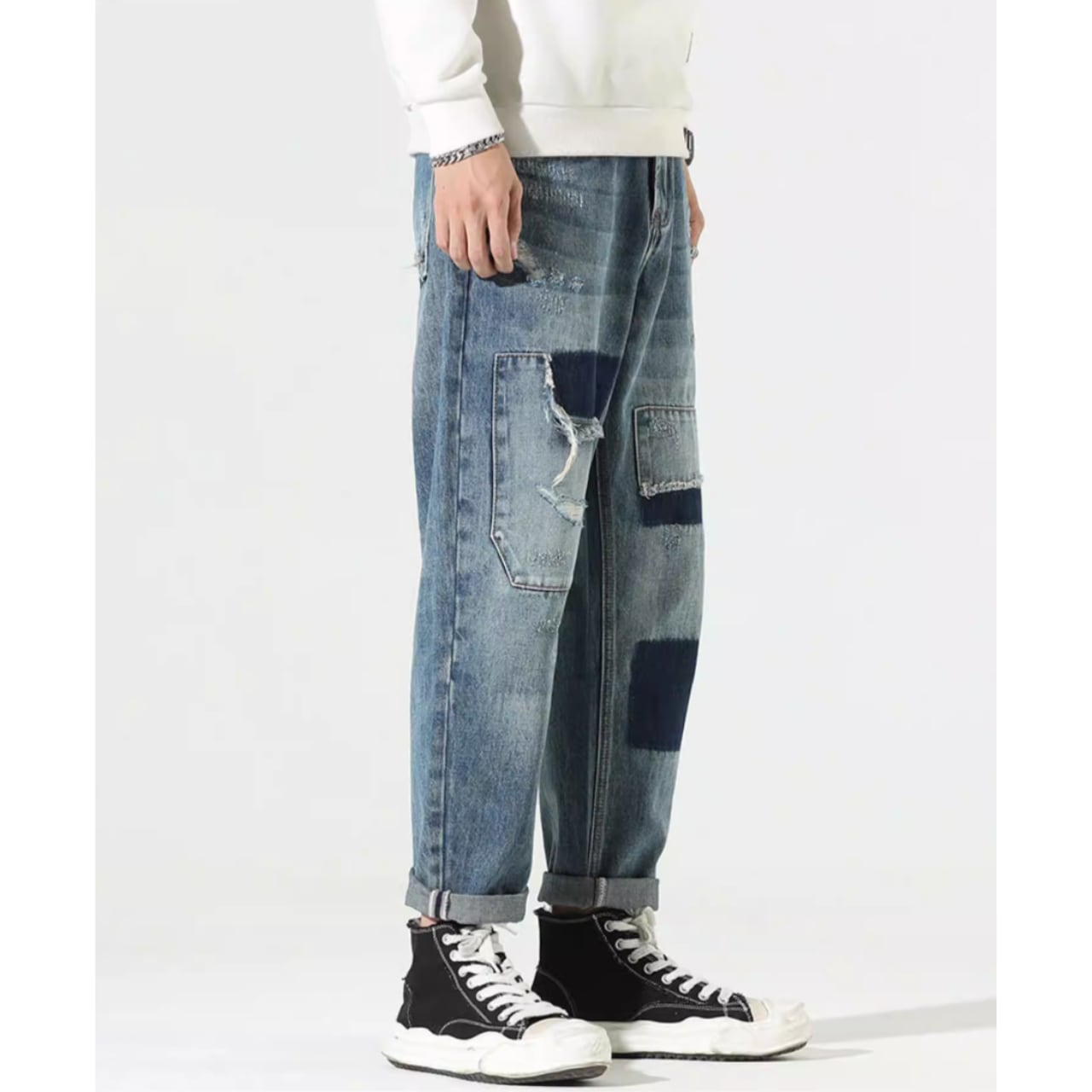 パッチワークが目を引く、個性的な一本。テーパードシルエットで、カジュアルながらもすっきりとした印象を与えます。