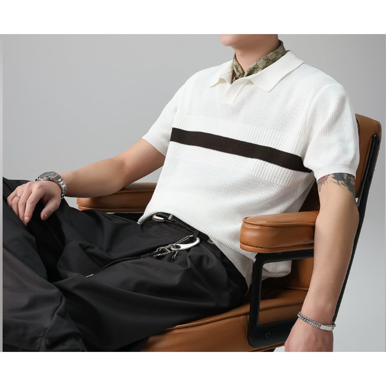 着回し力に優れた、シンプルながらもこだわりのあるデザインのニットポロシャツ。クリーンな印象のボディに、アクセントとなるラインが程よいアクセントを加えています。